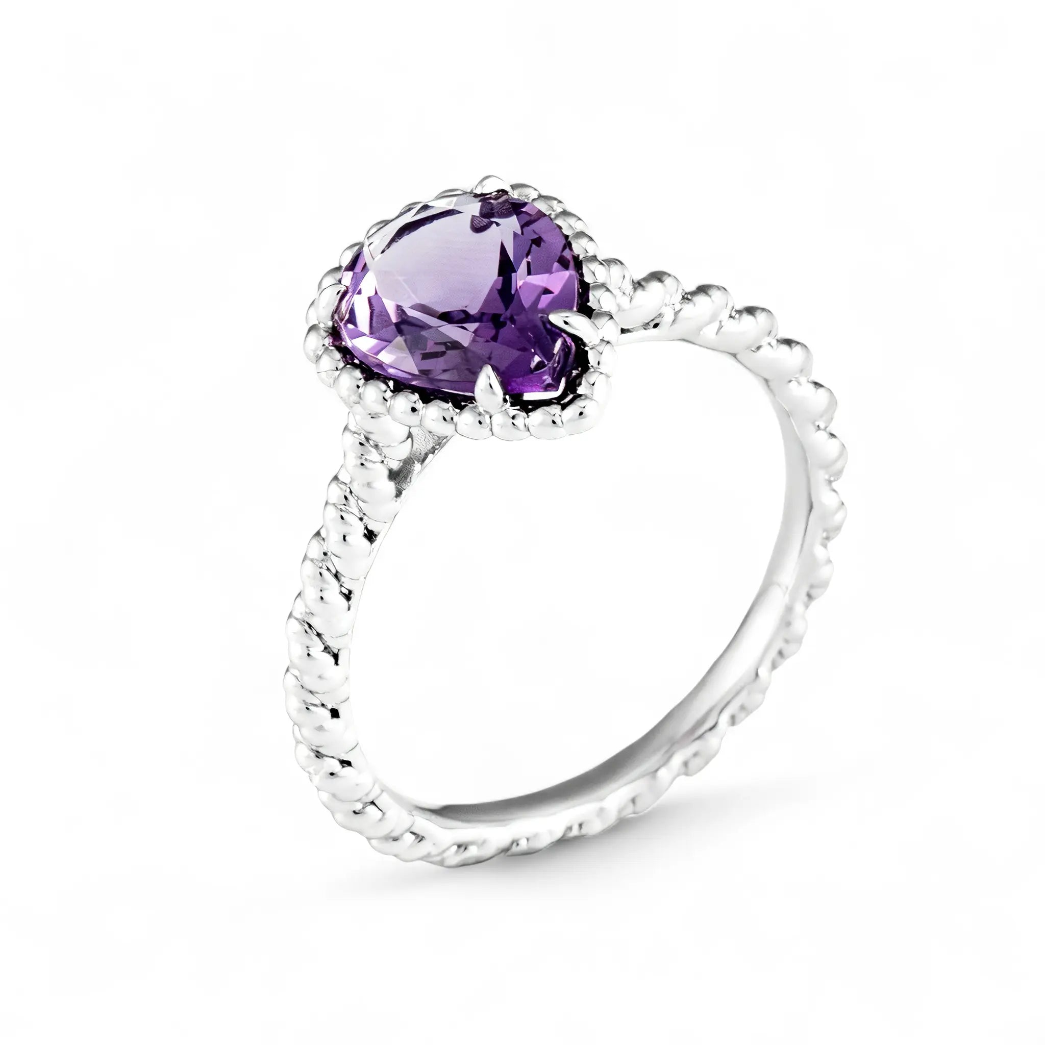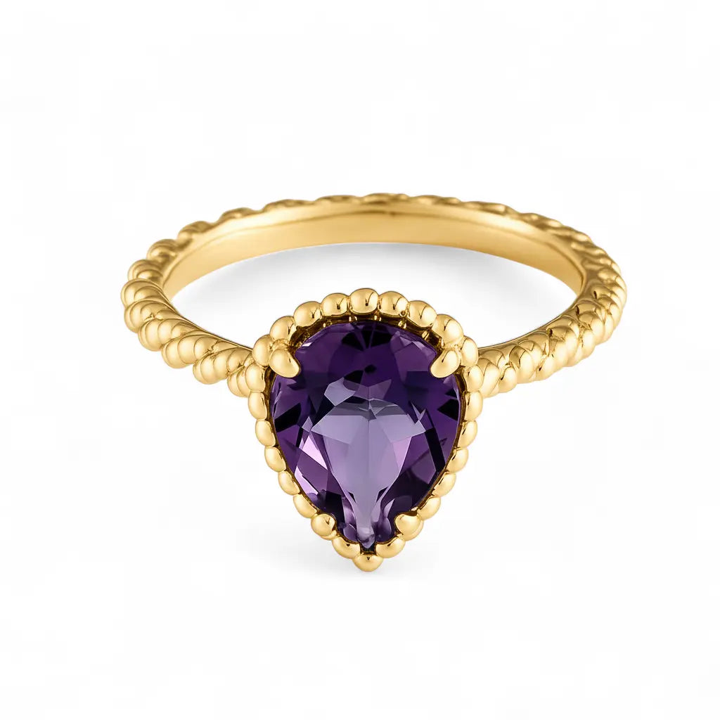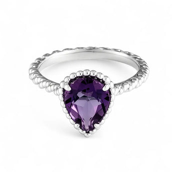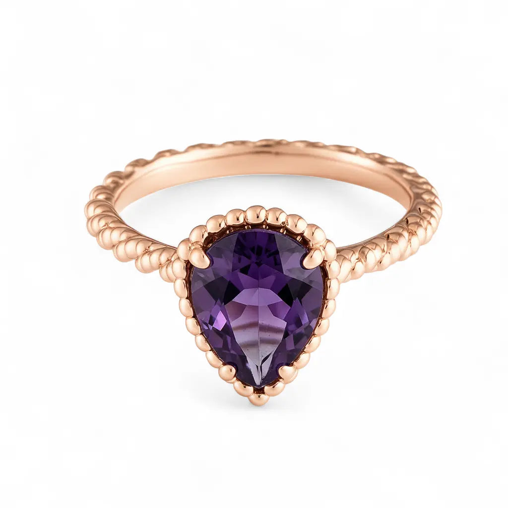 The pear-shaped amethyst ring breathes gently in the light and shadow. And the purple halo, like the soft, profound thoughts of the night. The winding, entwined band, like whispered moments, envelops you in layers of tranquility and gentleness.