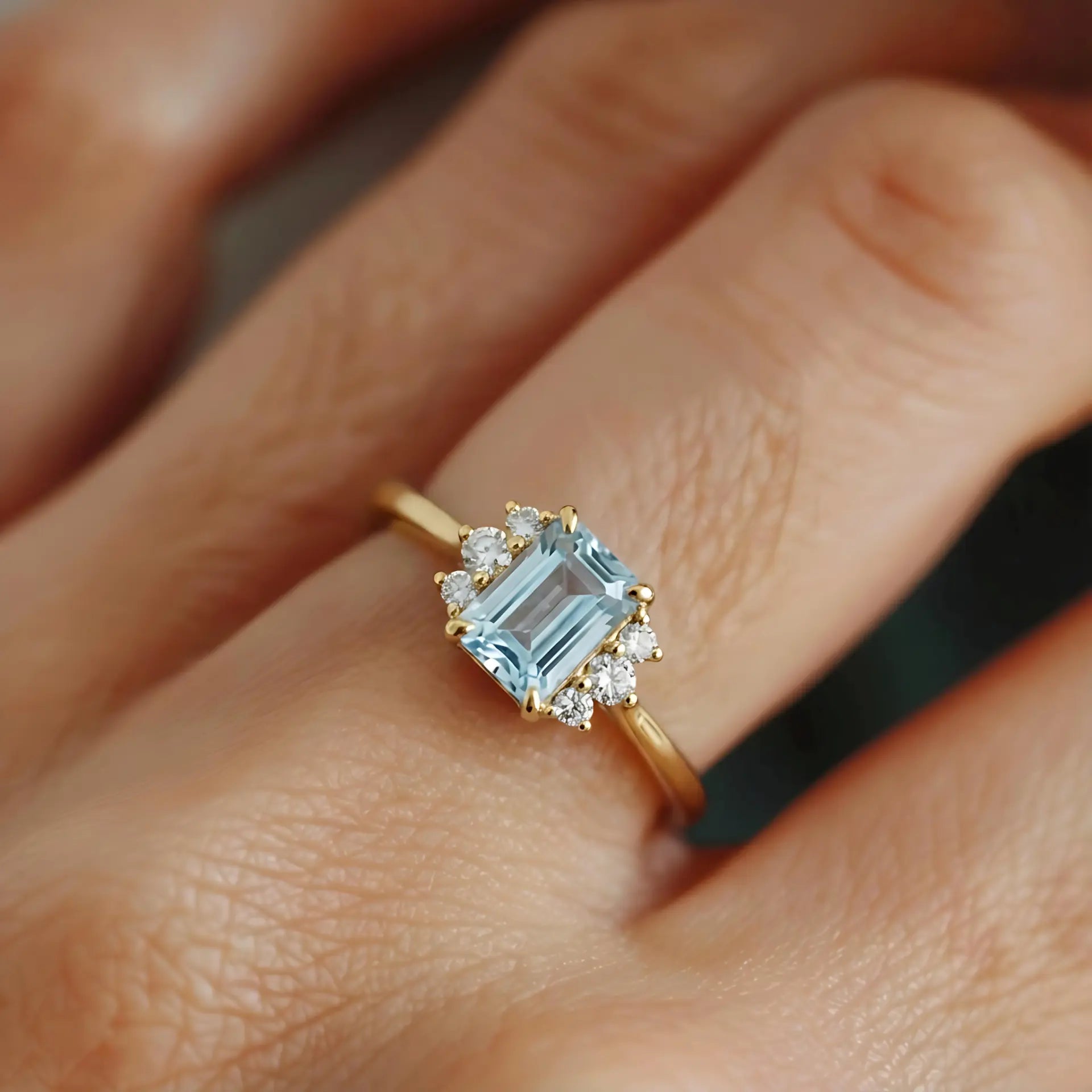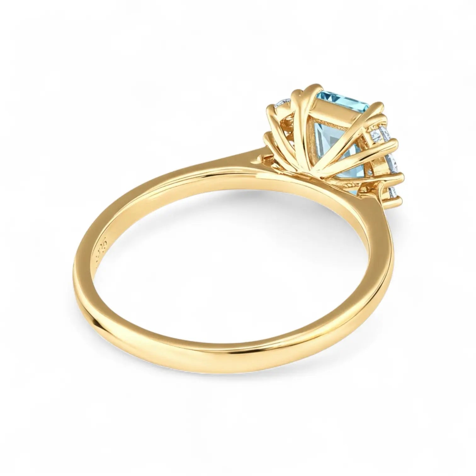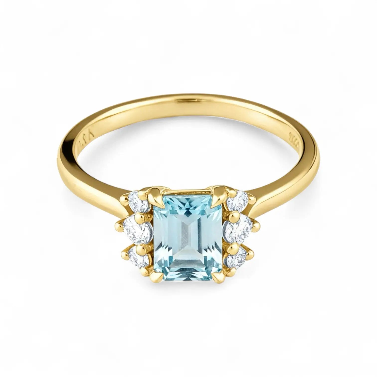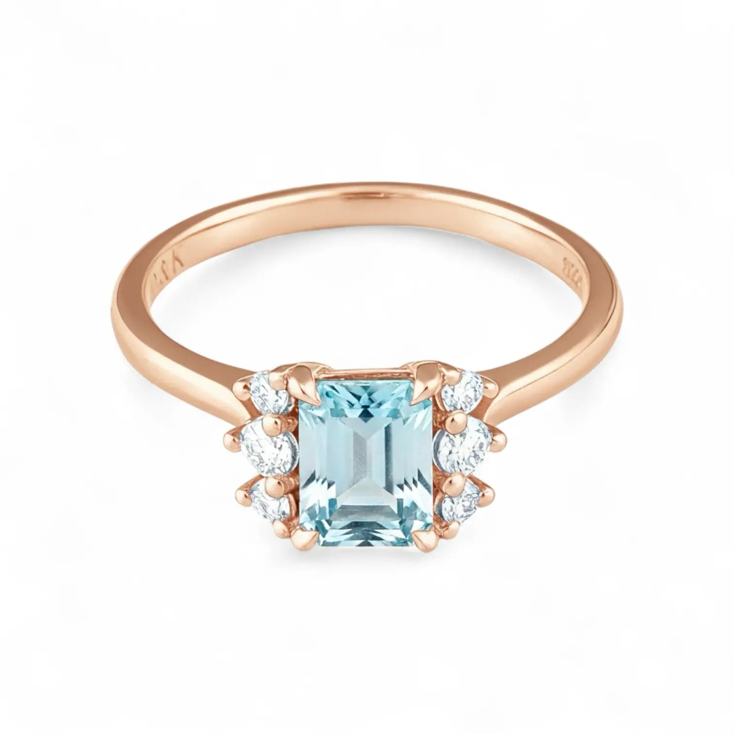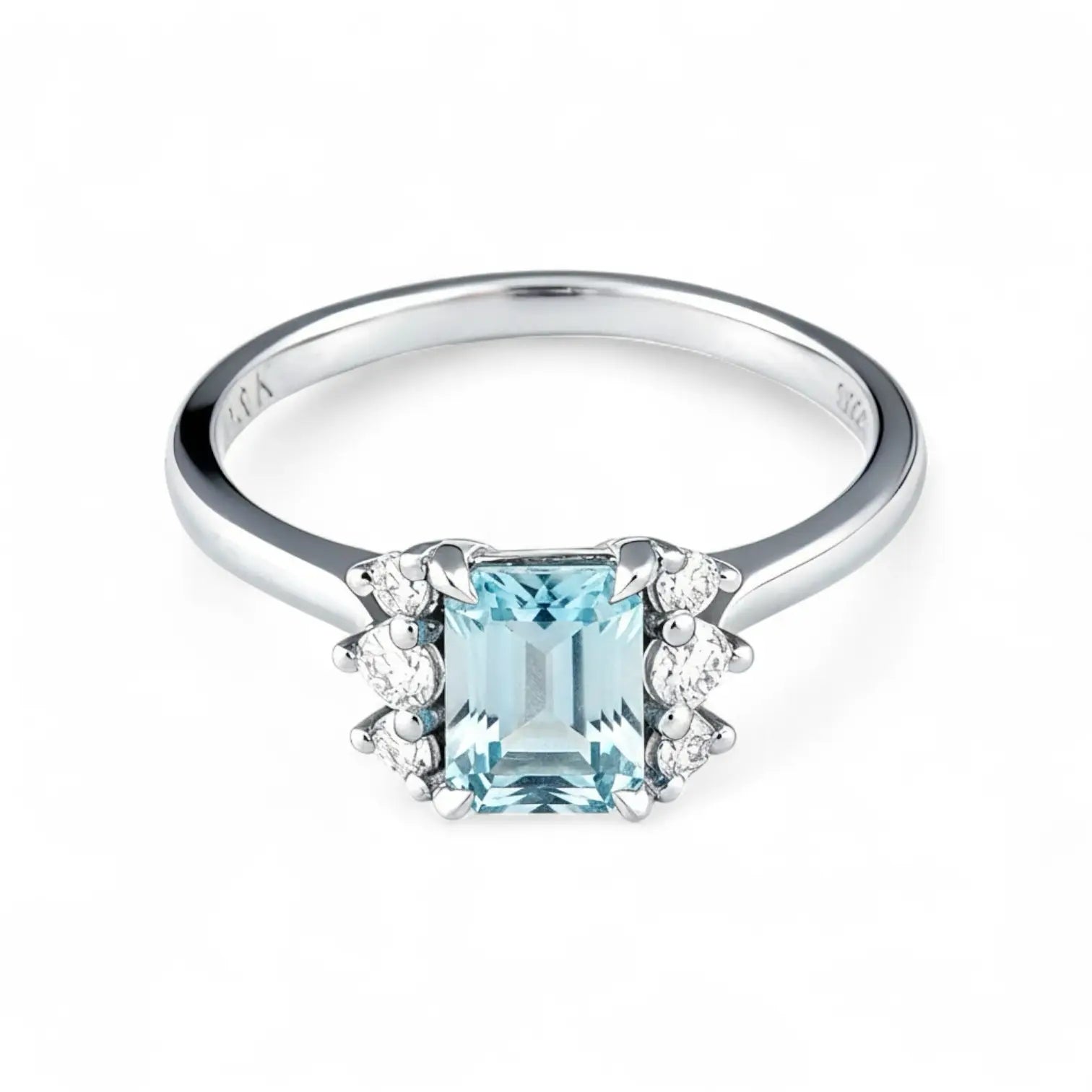 The band flows with a warm, gentle curve, carries a baguette aquamarine at its heart, while fine zircon stones shimmer softly at both sides, like faint light resting on water. Its layered structure brings a quiet sense of balance, fitting close to the finger with grace and calm strength. The cool blue tone whispers of courage, letting resolve grow tenderly within, steady between solitude and the world.