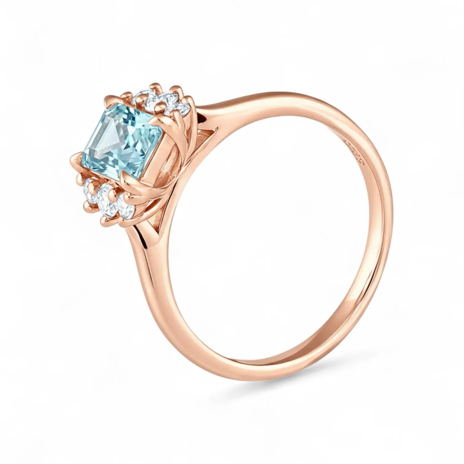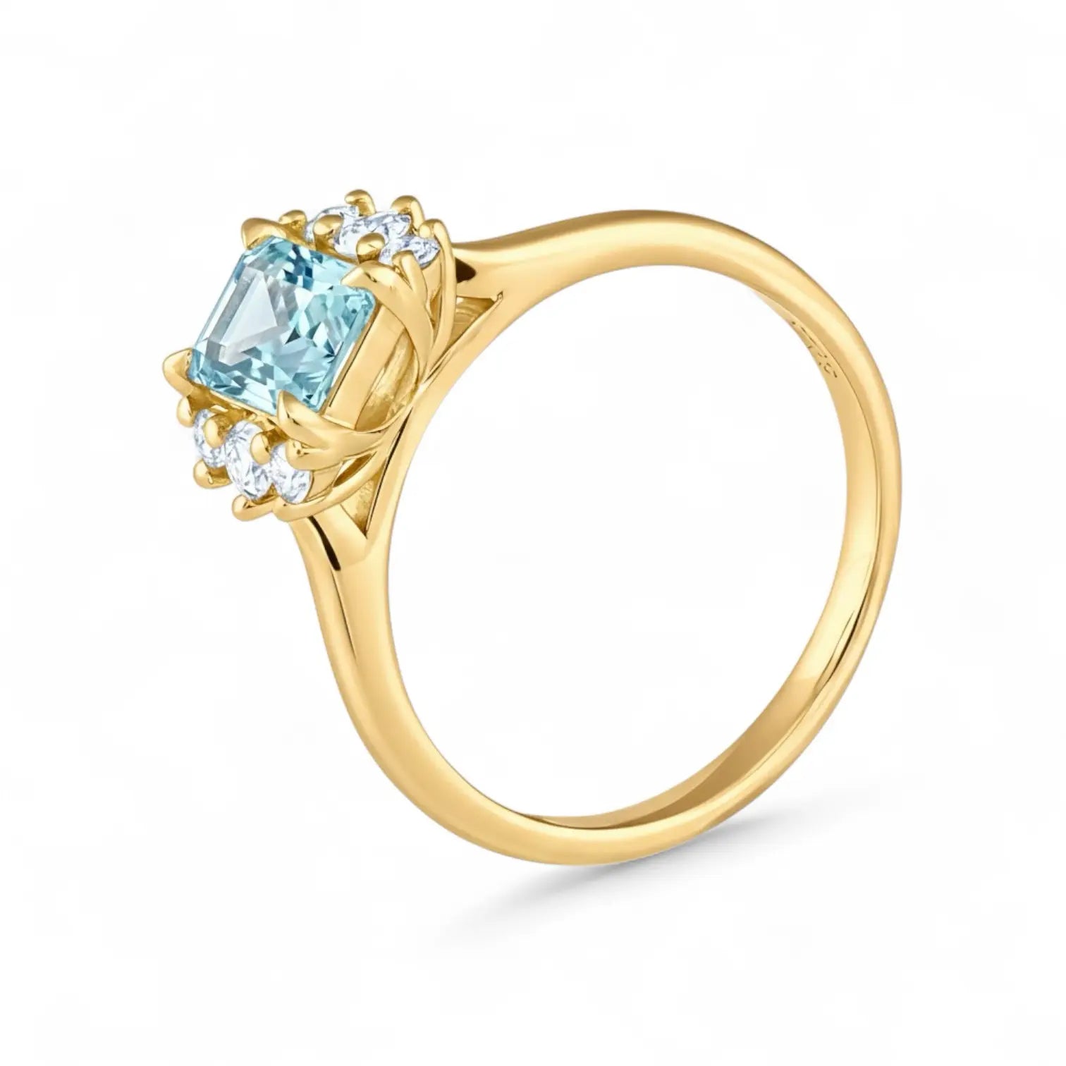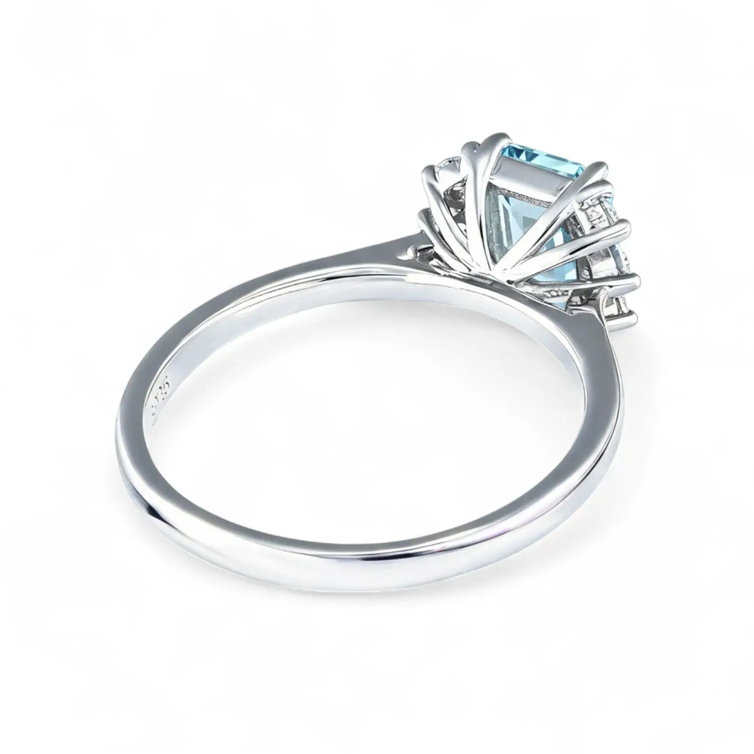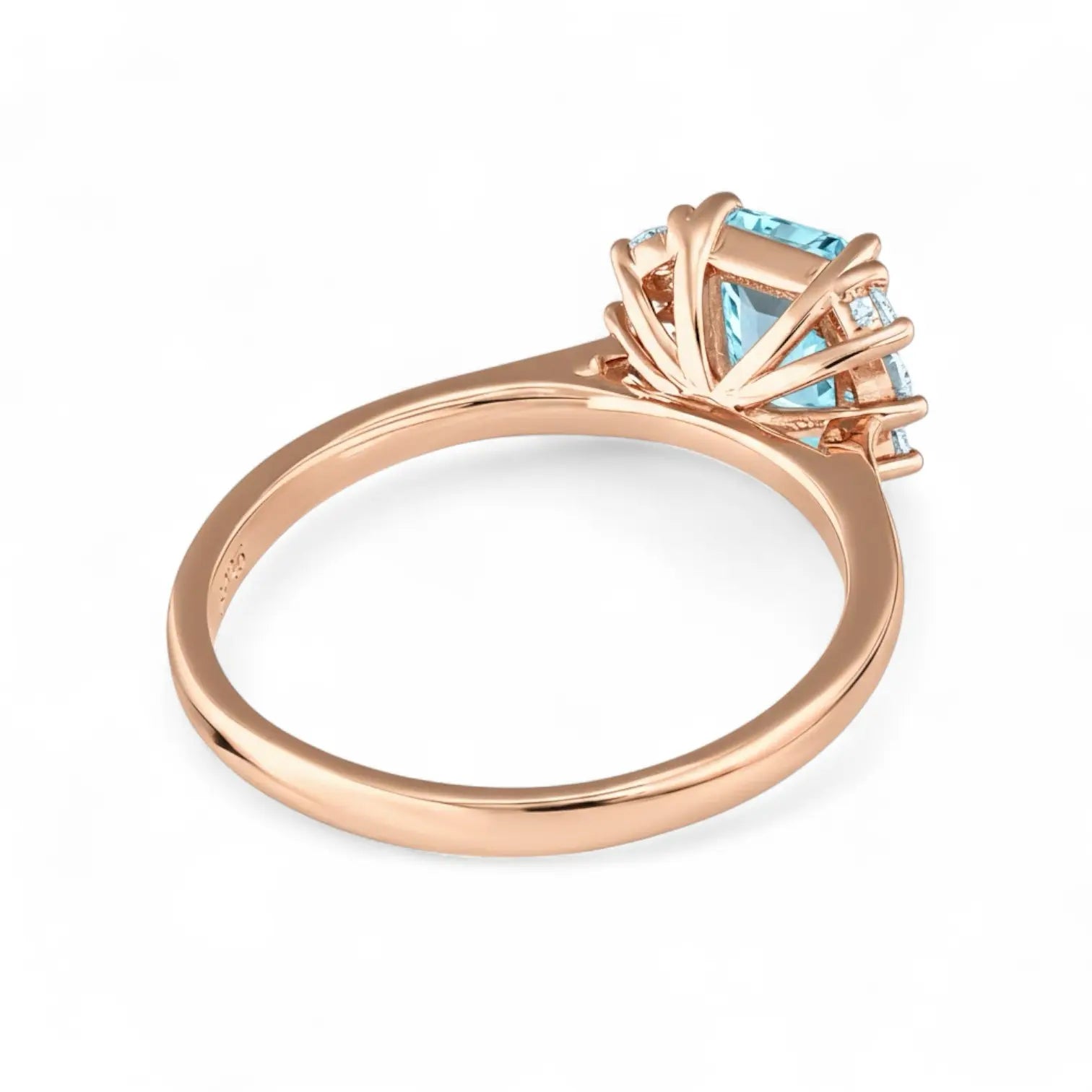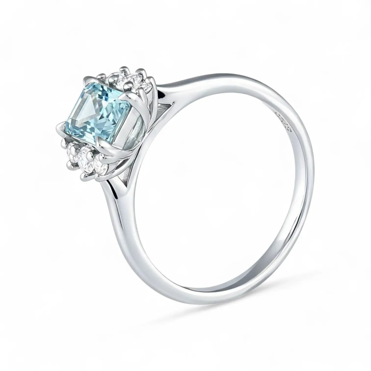 The band flows with a warm, gentle curve, carries a baguette aquamarine at its heart, while fine zircon stones shimmer softly at both sides, like faint light resting on water. Its layered structure brings a quiet sense of balance, fitting close to the finger with grace and calm strength. The cool blue tone whispers of courage, letting resolve grow tenderly within, steady between solitude and the world.