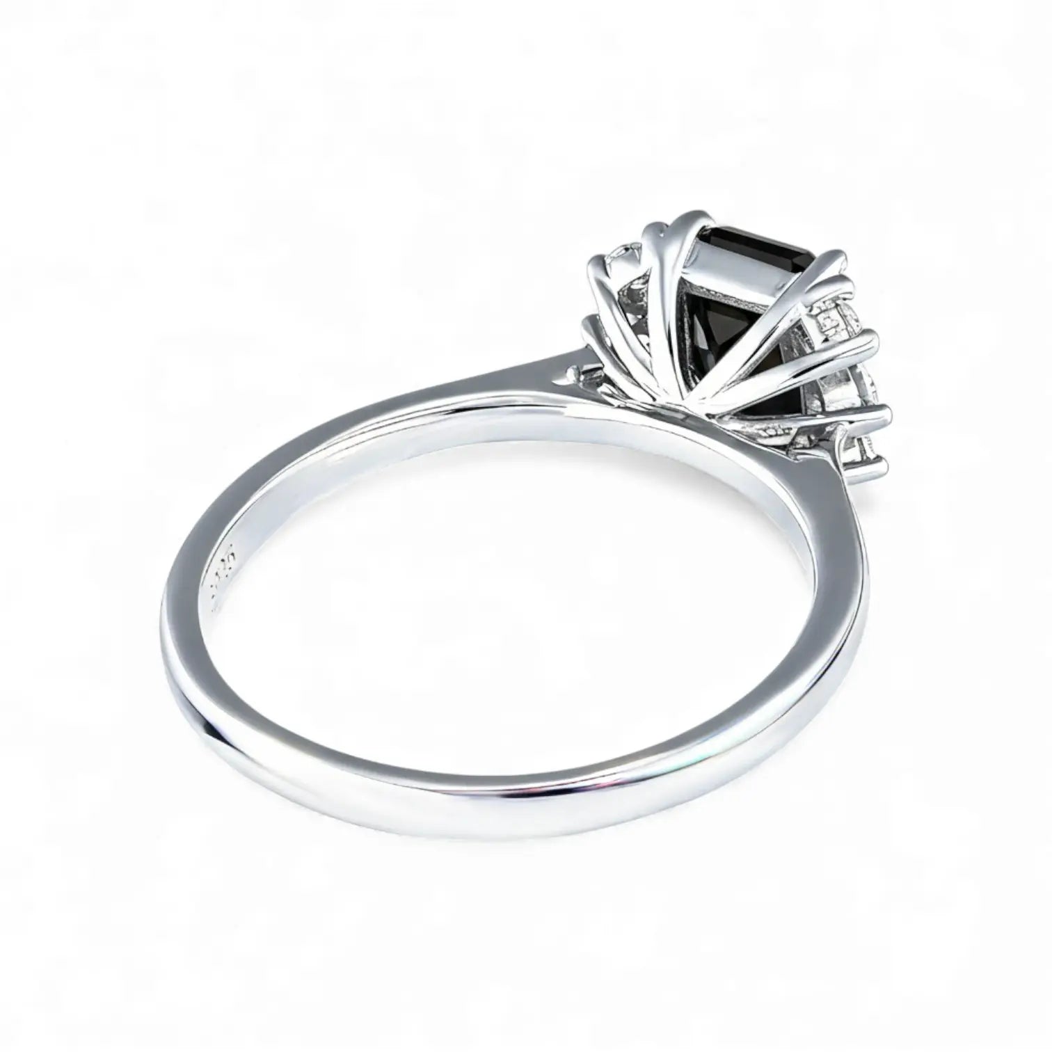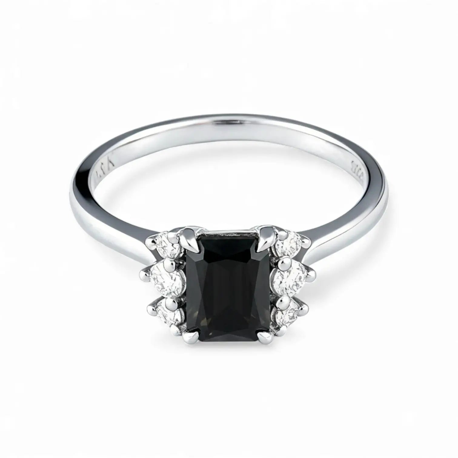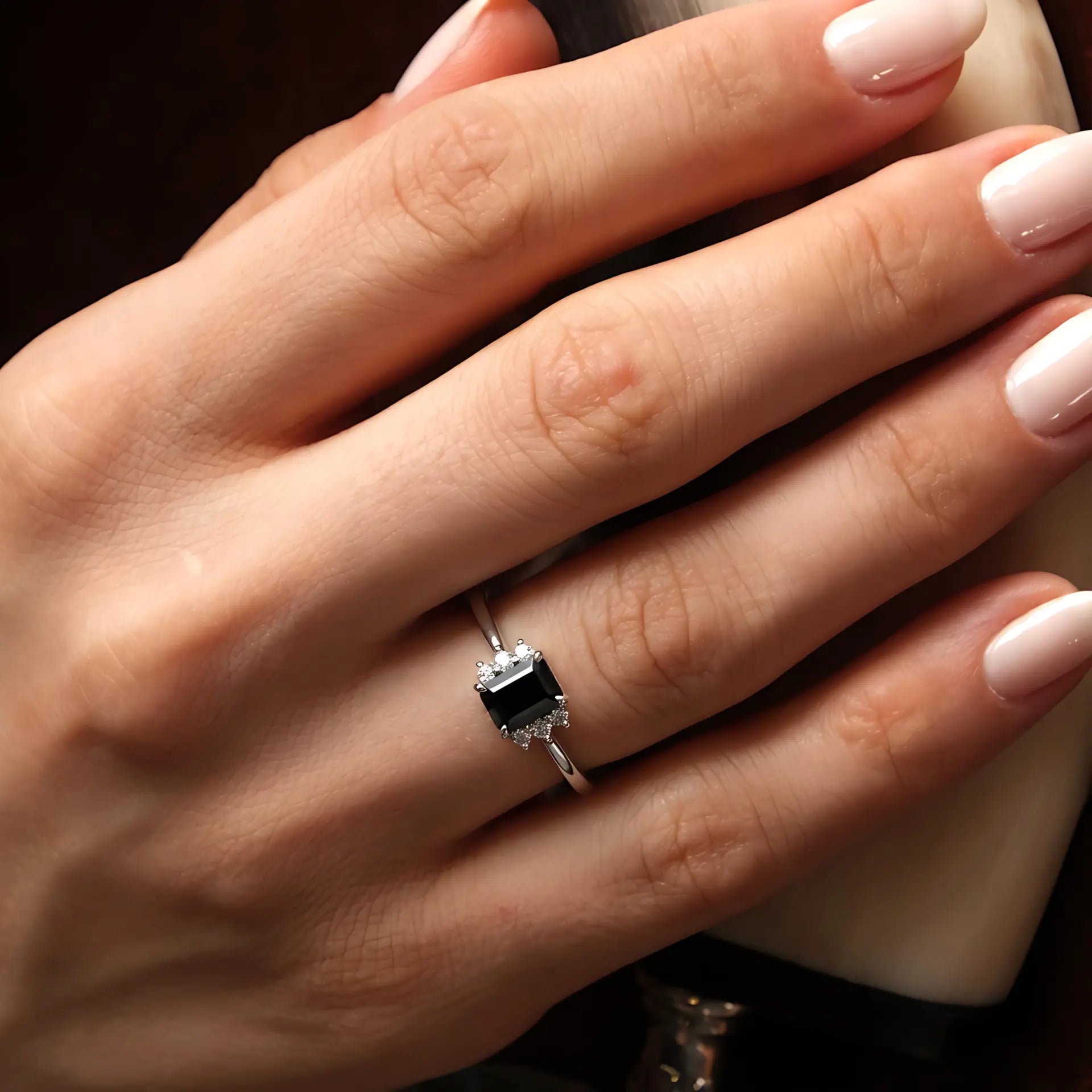 A slender baguette black onyx rests on the finger, its deep tone holding a calm sheen. Soft zircon accents glow at the sides, shaping lines that feel clean and gentle. The smooth band sits with quiet ease. Black onyx embodies willpower, offering steady strength and quiet focus, the ring likes a silent companion that carries you through everyday moments.