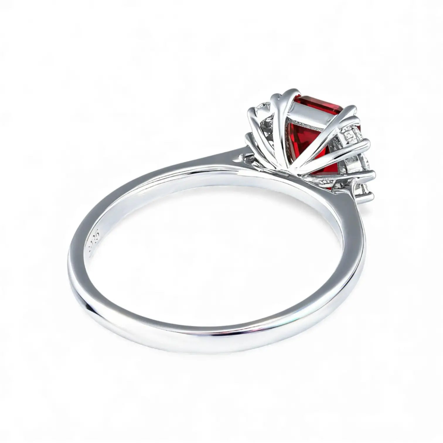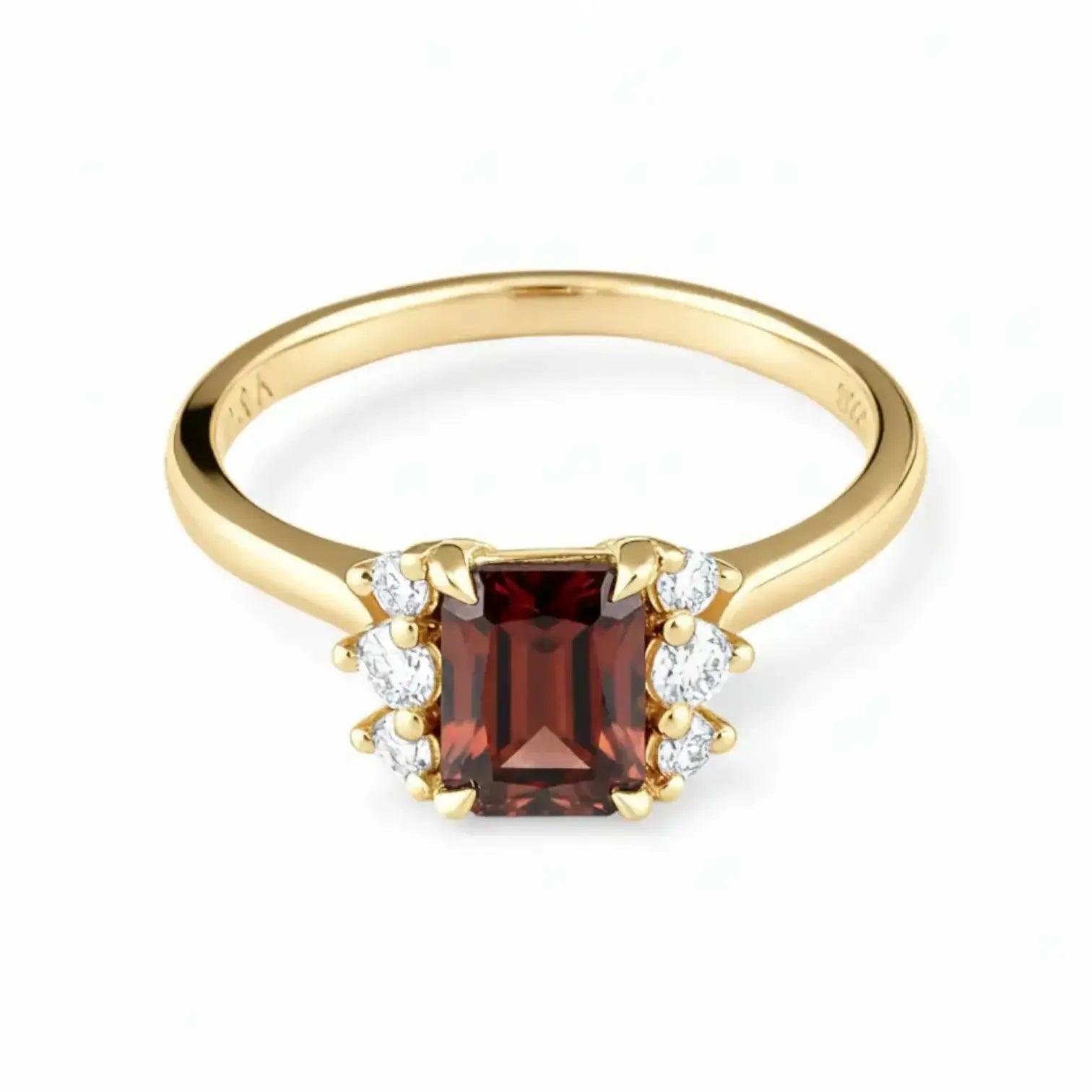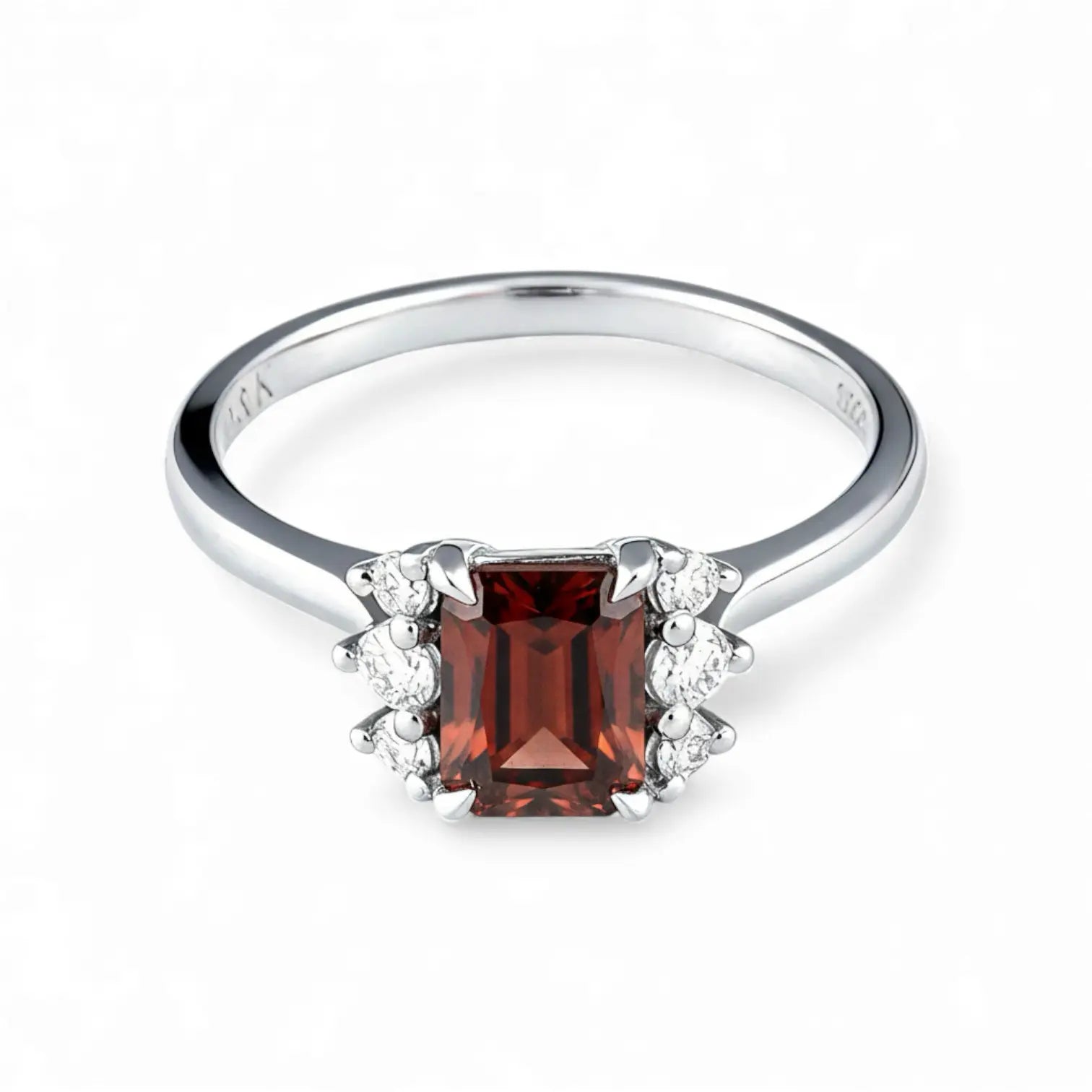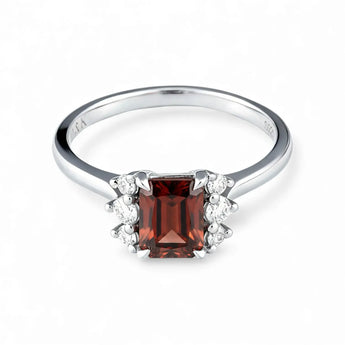 Soft lines of the band rest gently around the finger, with a baguette cut garnet set at the center, its deep red tone steady and quietly powerful. Zircon accents on each side add gentle layers and balance. The design feels restrained yet warm, holding a quiet passion that stirs inner strength and brings a subtle sense of courage to everyday moments.