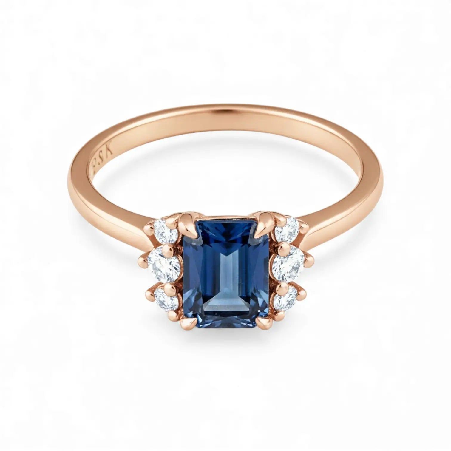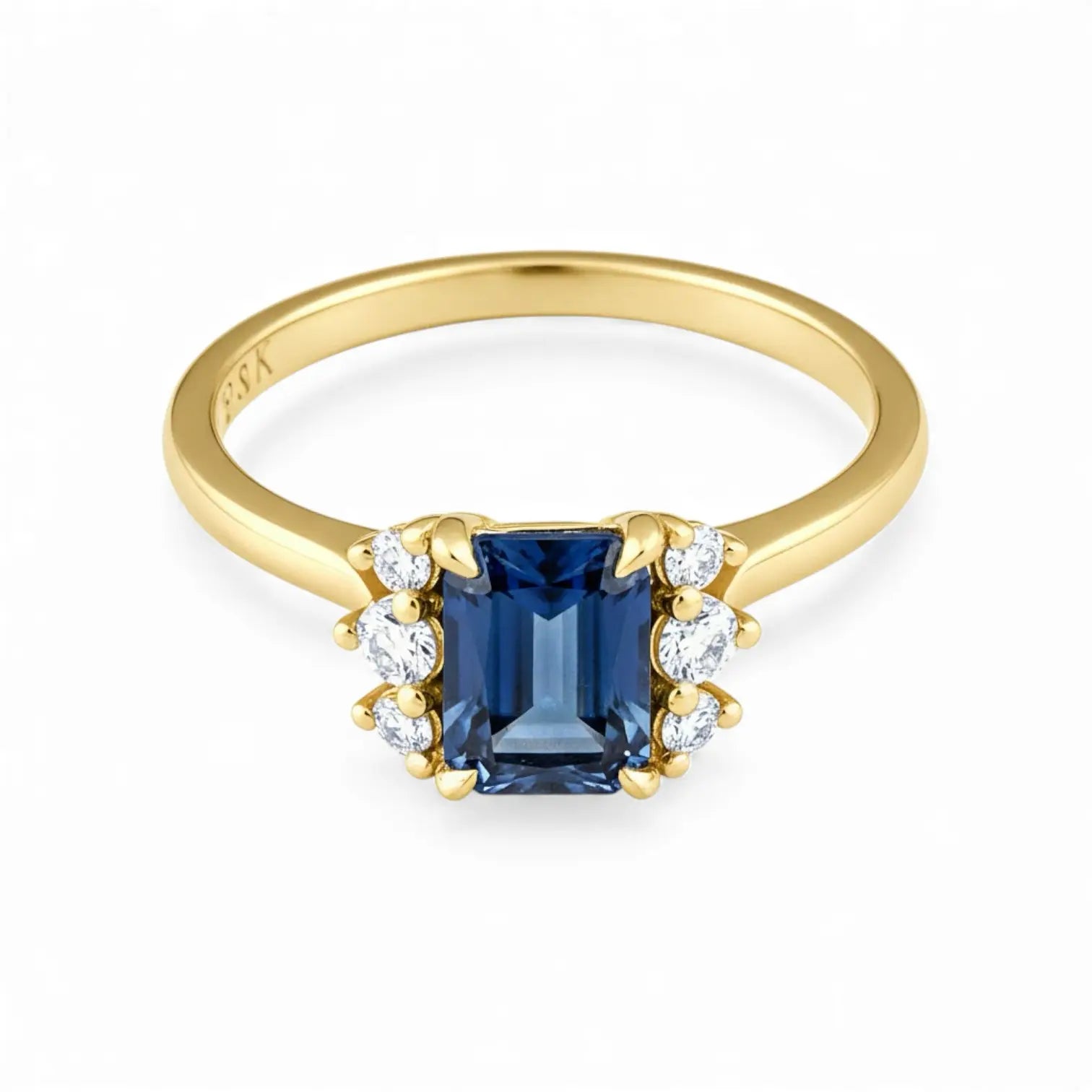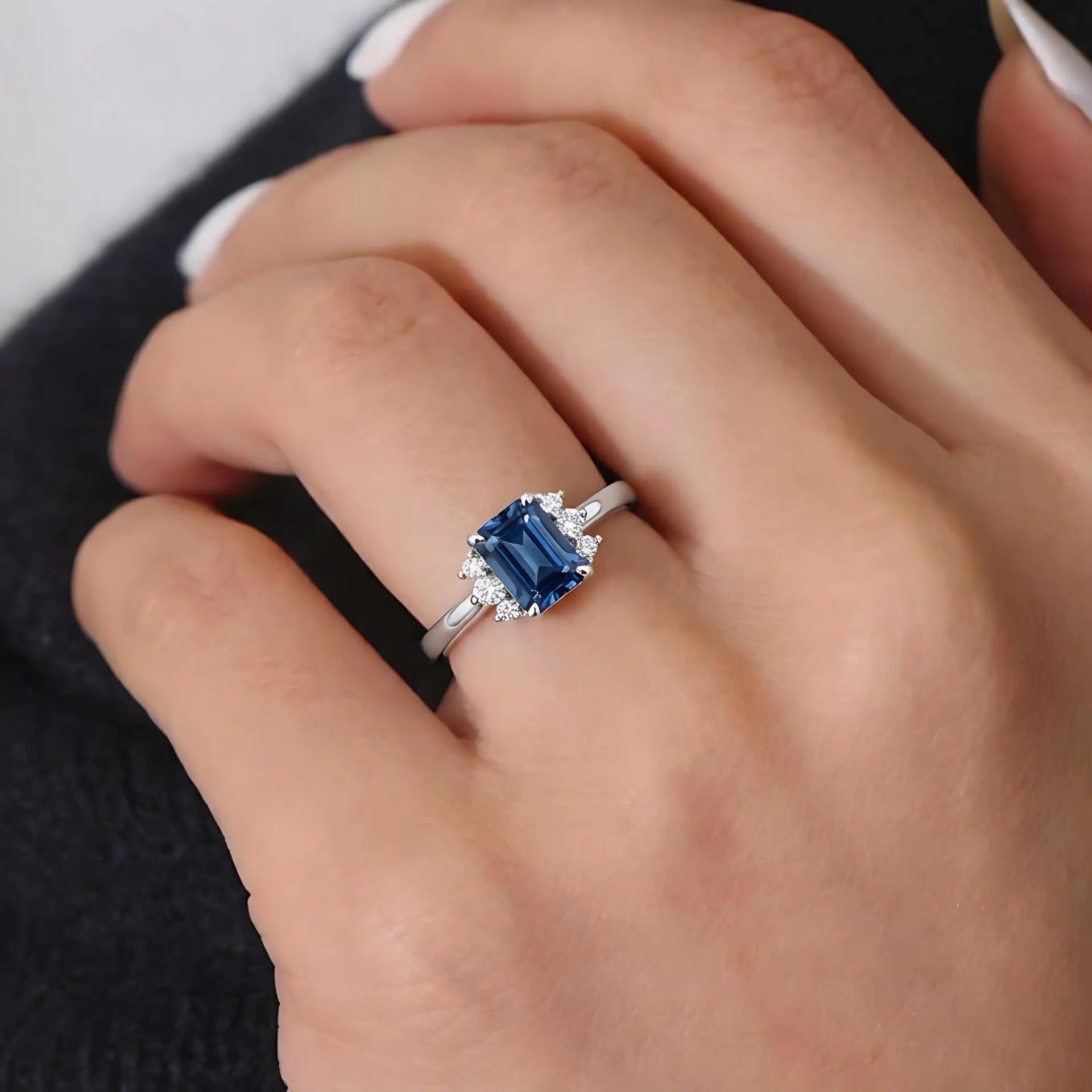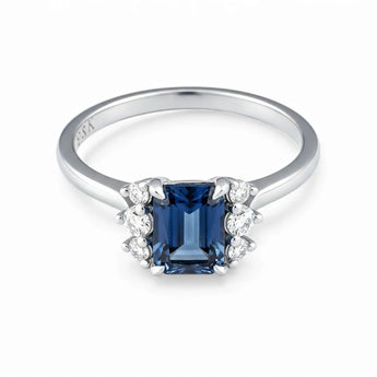 Soft curves shape the slender band, with a London Blue Topaz set in a clean baguette cut at the center. Zircon stones on each side cradle it like quiet points of light. The design feels simple yet refined, its deep blue tone carrying clarity and calm, offers you balance, steady comfort, and a quiet sense of ease in everyday moments.