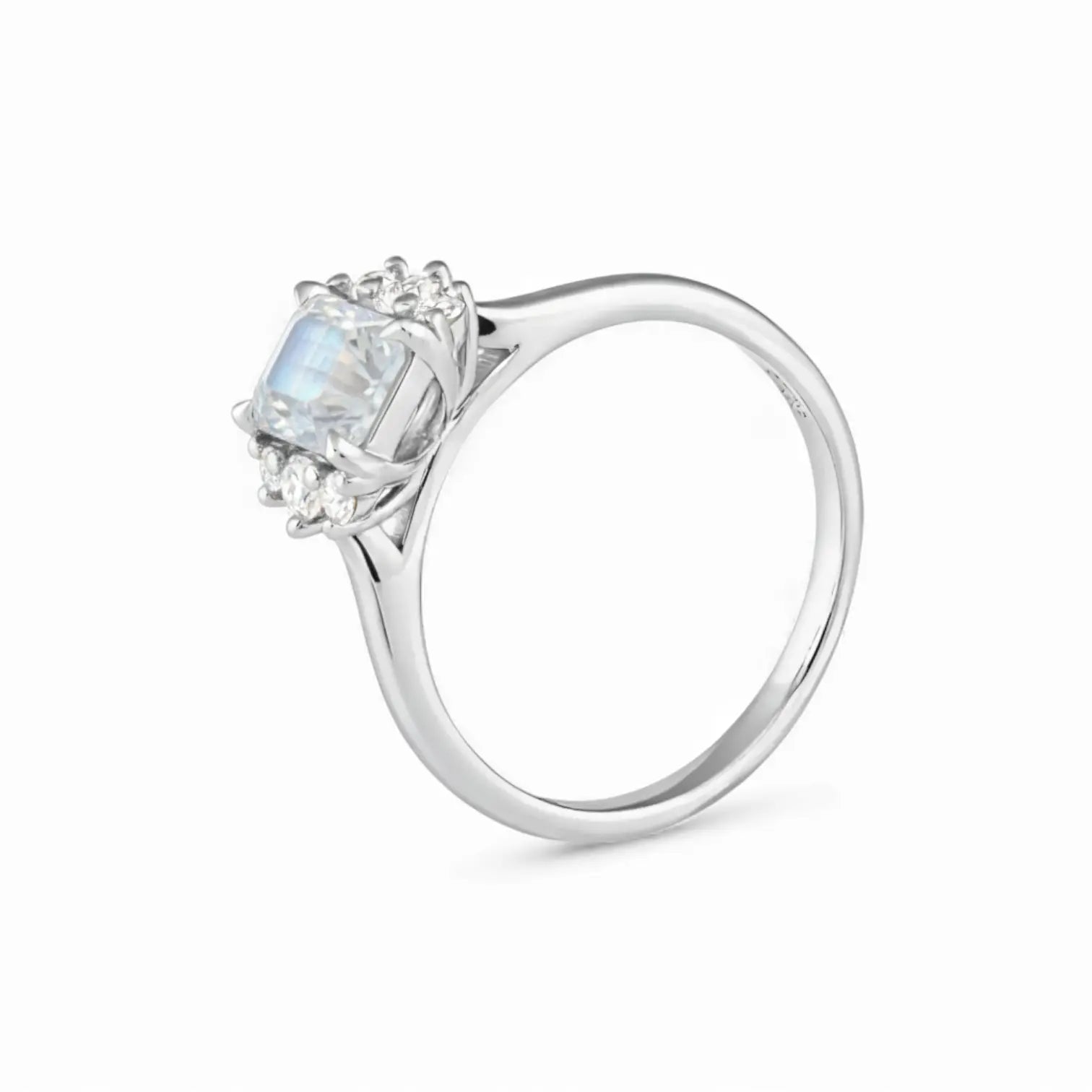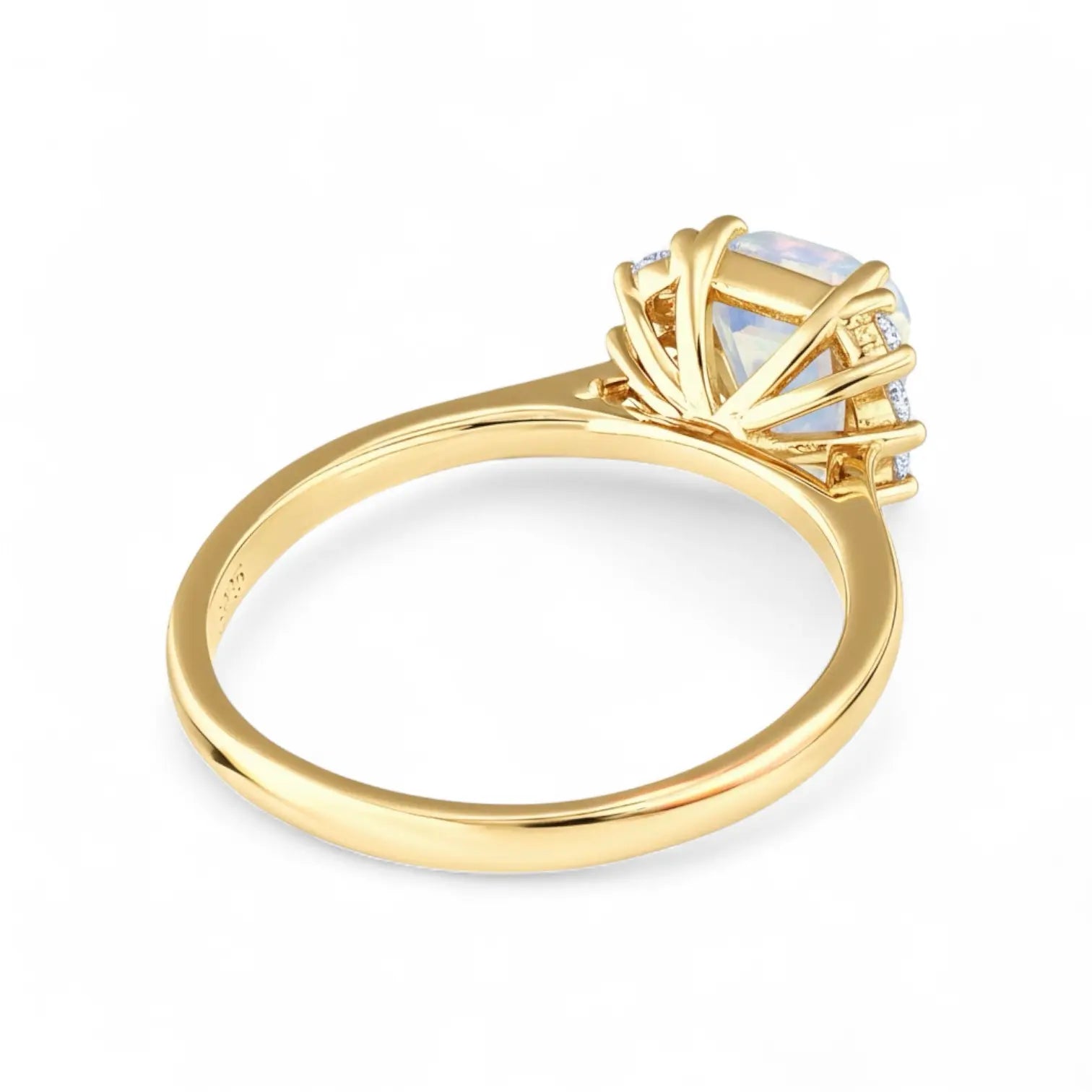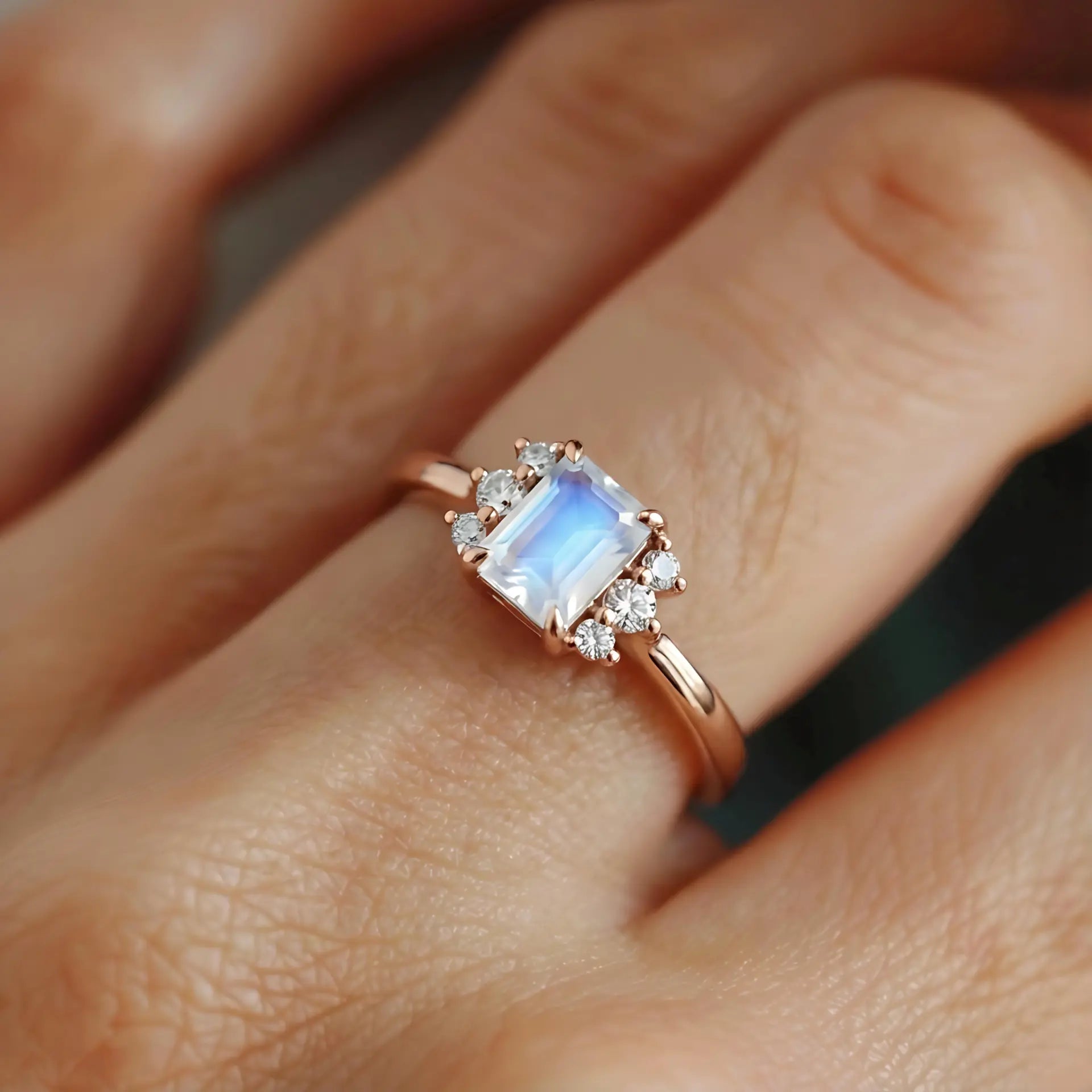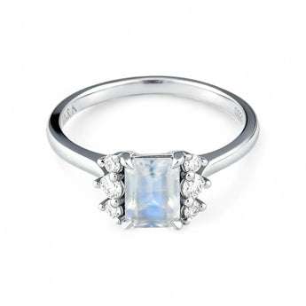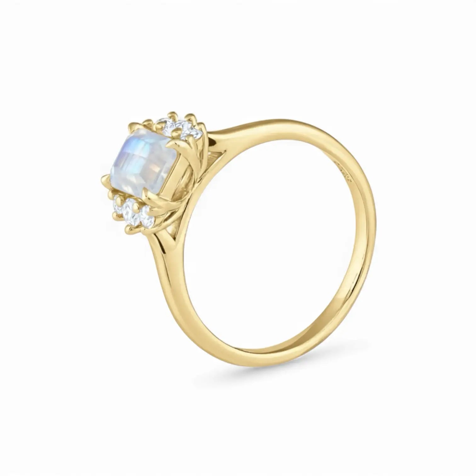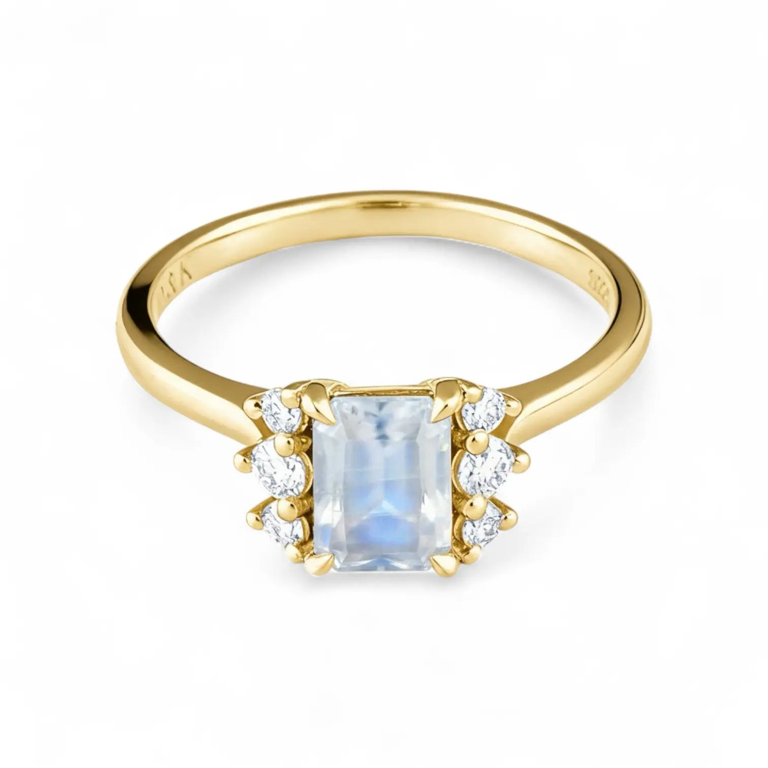 The ring’s design is elegant and minimalist, with a smooth band that complements the moonstone’s soft, ethereal glow. The stone, embodying the gentle essence of moonlight, is highlighted by its delicate baguette cut, enhancing its unique radiance. The ring's flowing lines create a balance of simplicity and sophistication, serving as a reminder to stay connected to your inner intuition.