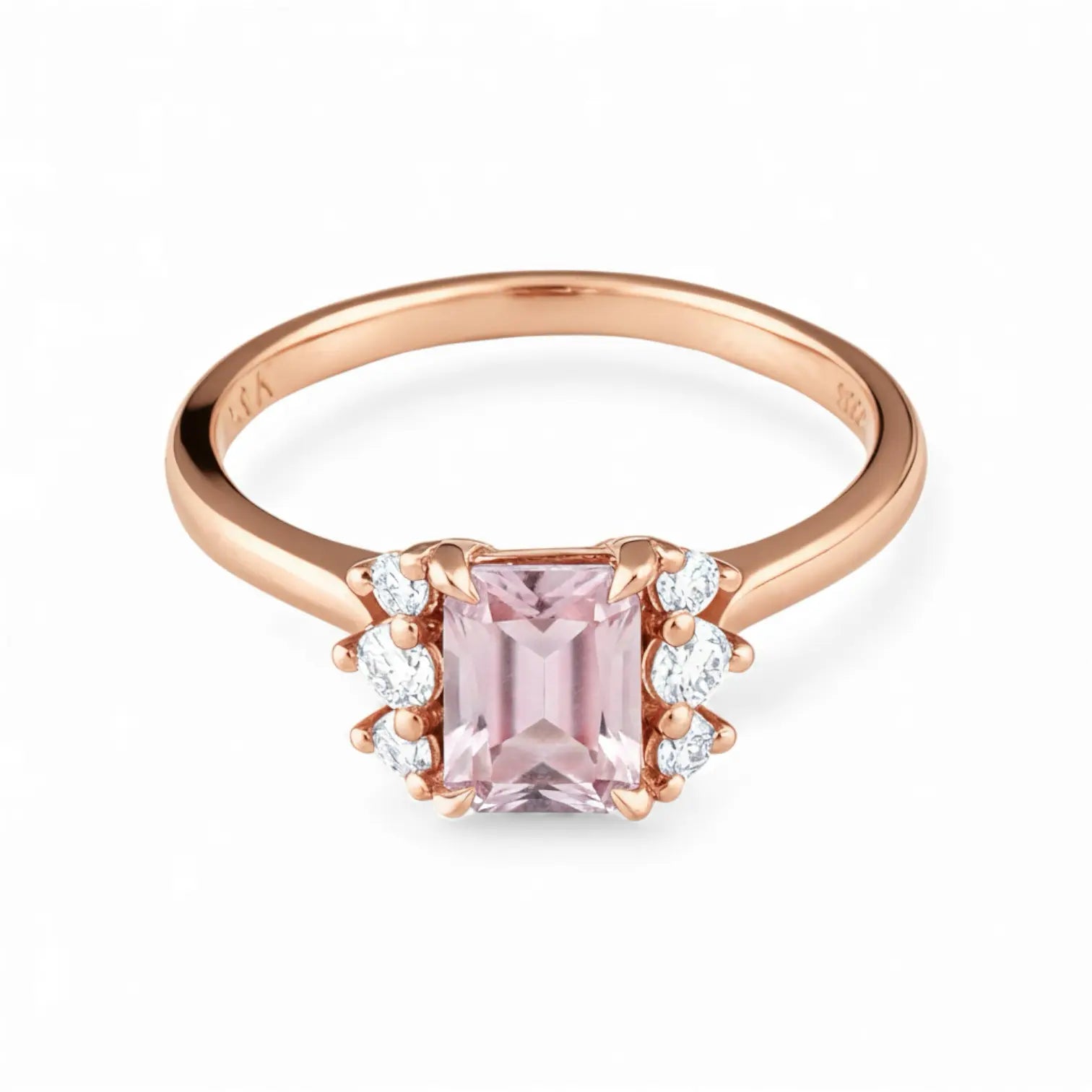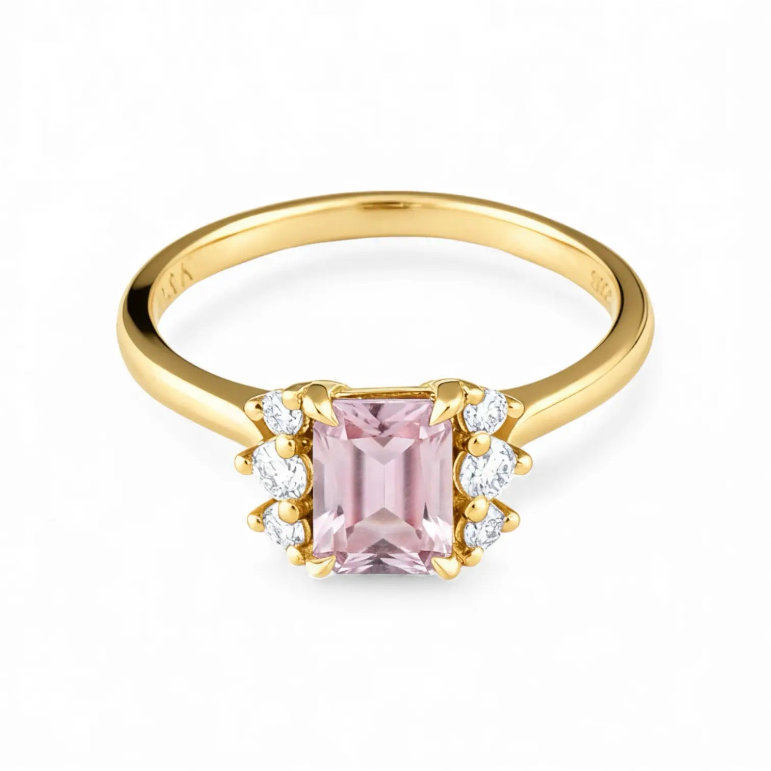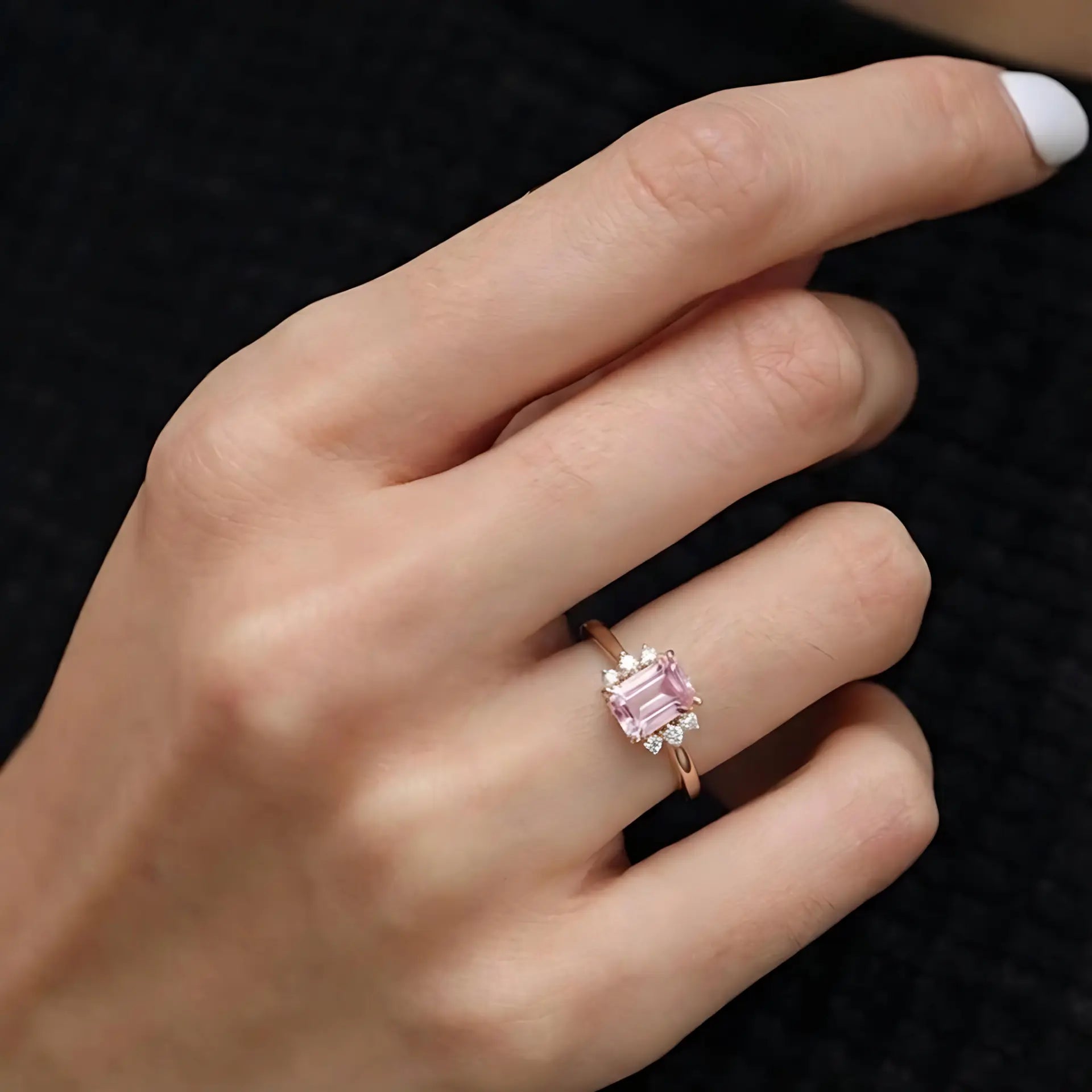 The ring carries a gentle silhouette. A smooth band lifts a soft pink rose quartz, with tiny zircon stones resting beside it like quiet light. The design feels tender and balanced. Rose quartz speaks of self-love and calm. Worn close, it reminds you to slow down, soften your thoughts, and return to a kinder space within.