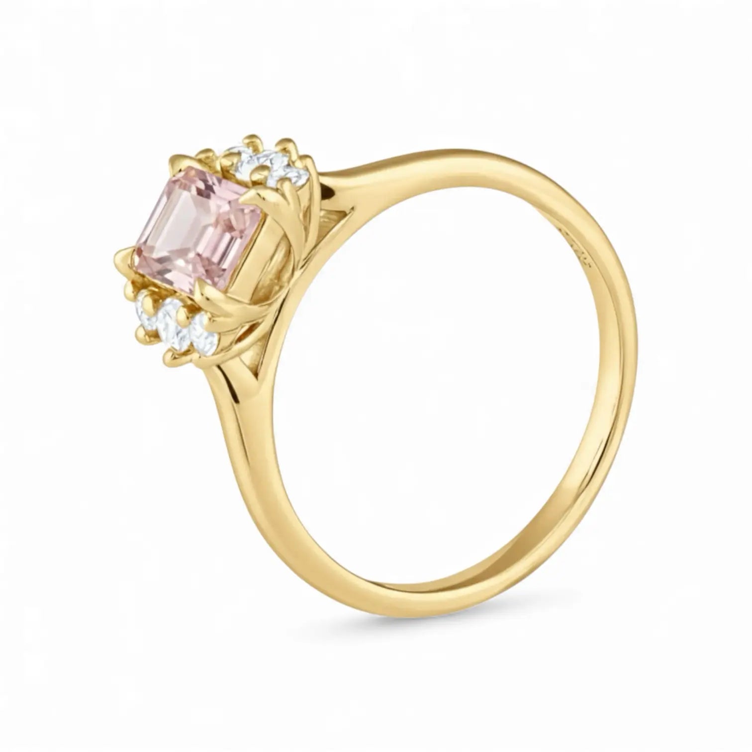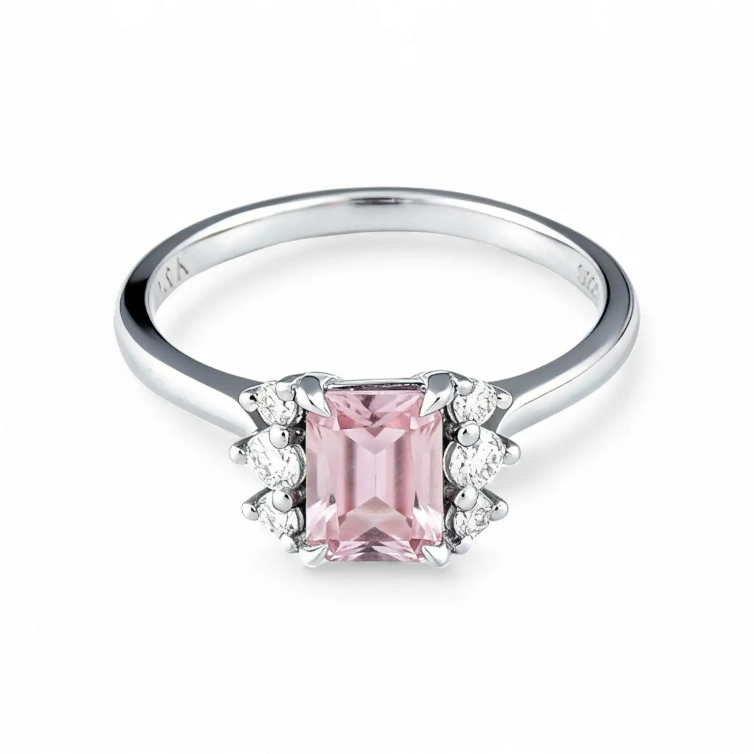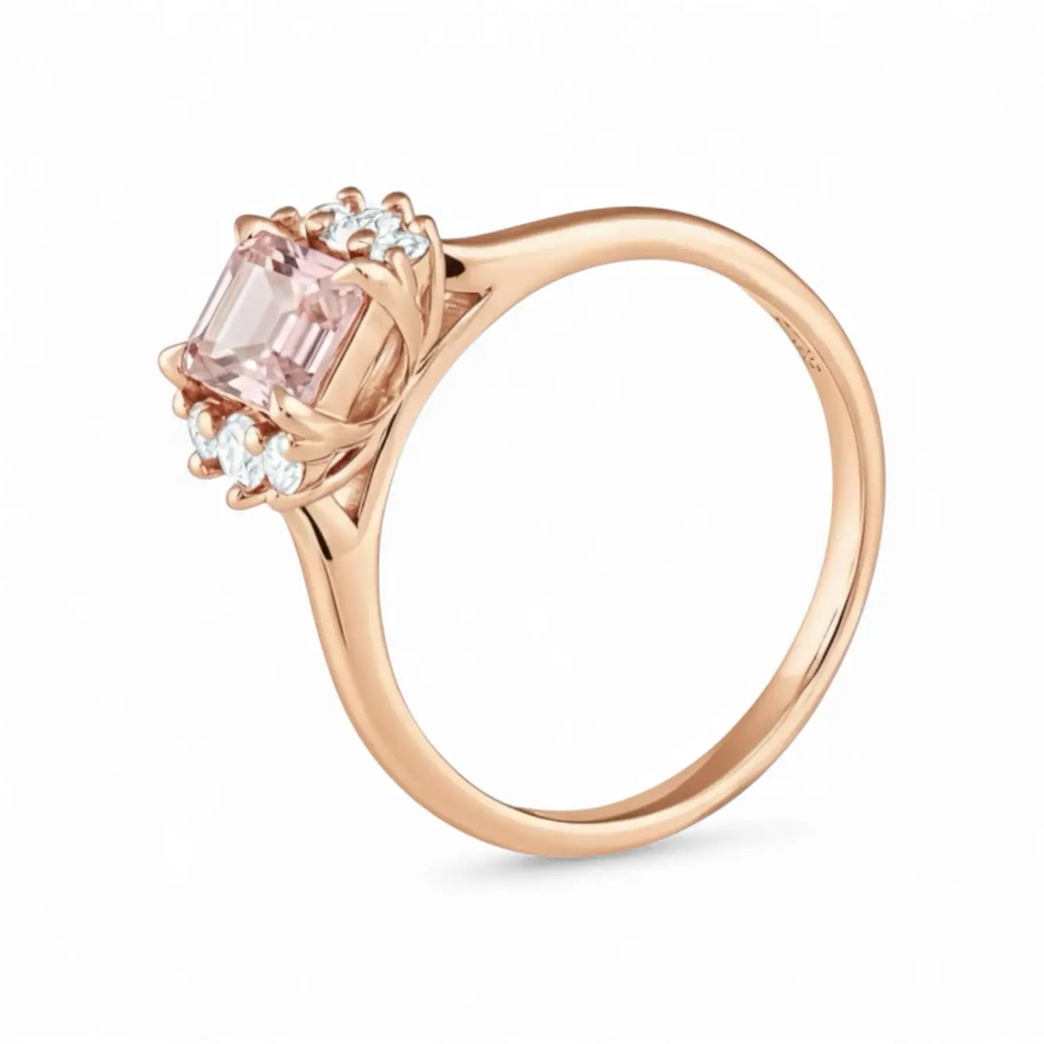 The ring carries a gentle silhouette. A smooth band lifts a soft pink rose quartz, with tiny zircon stones resting beside it like quiet light. The design feels tender and balanced. Rose quartz speaks of self-love and calm. Worn close, it reminds you to slow down, soften your thoughts, and return to a kinder space within.