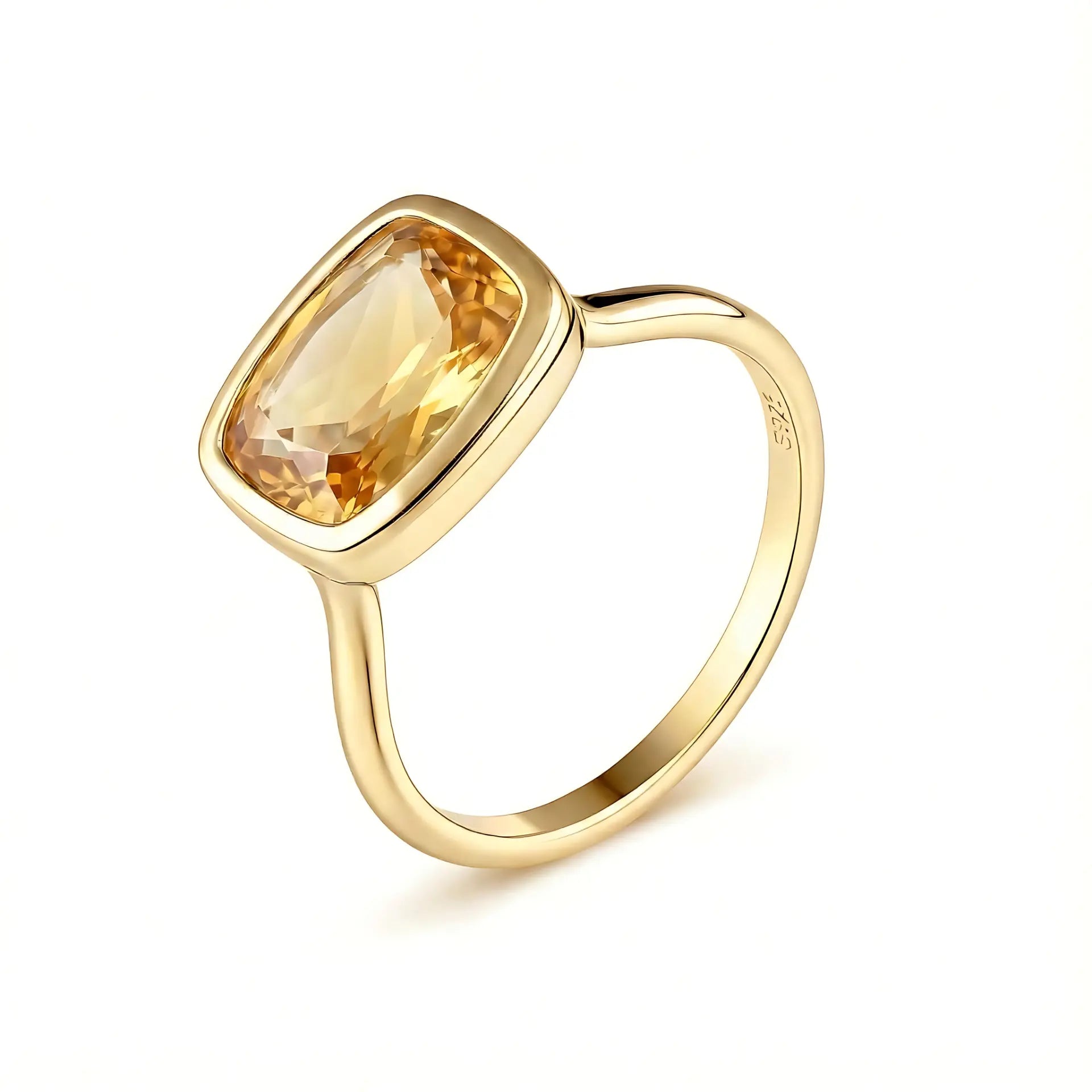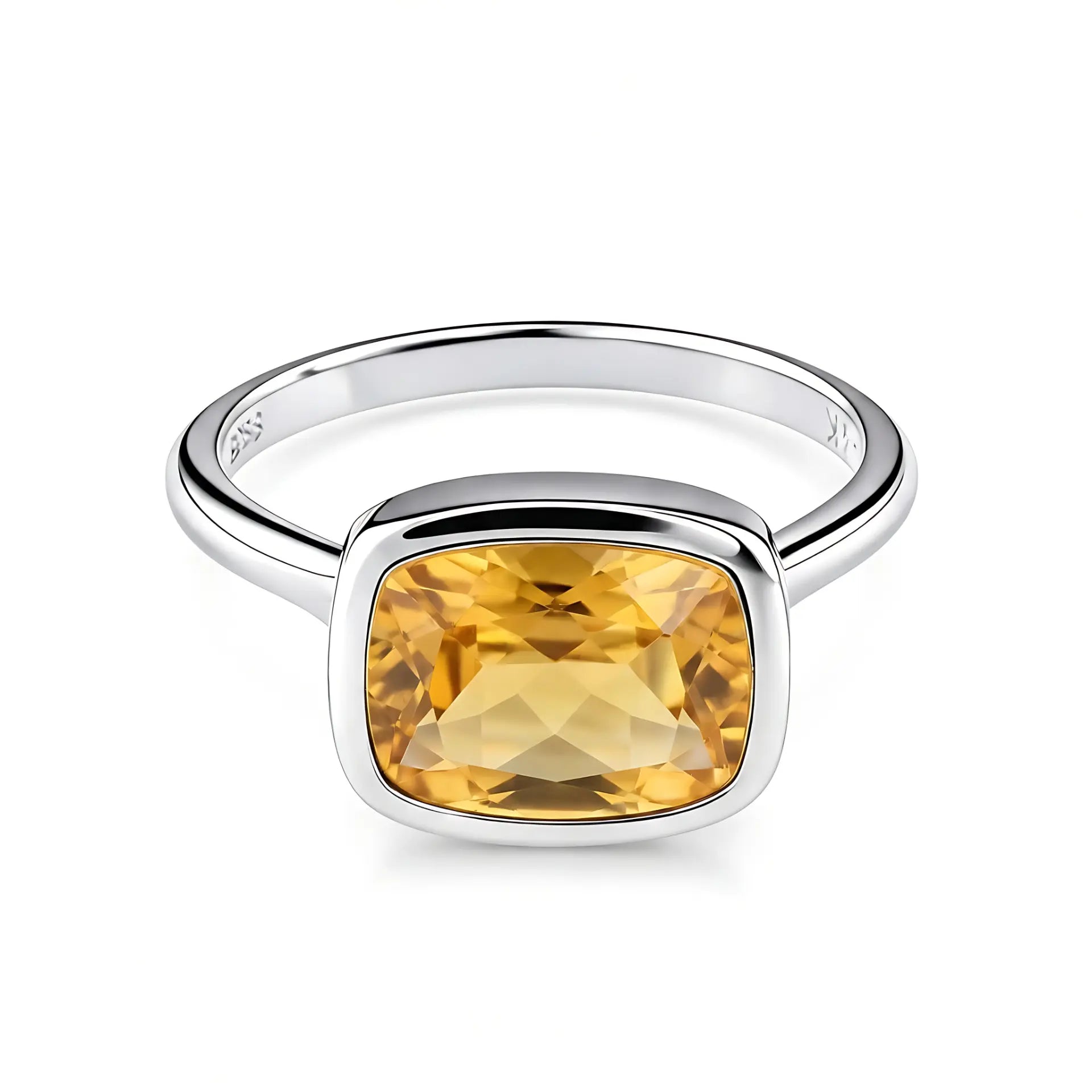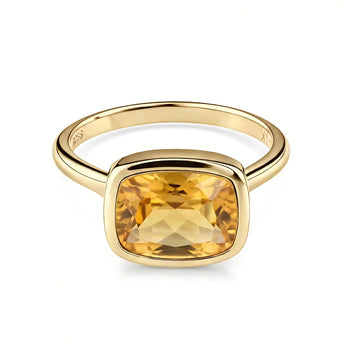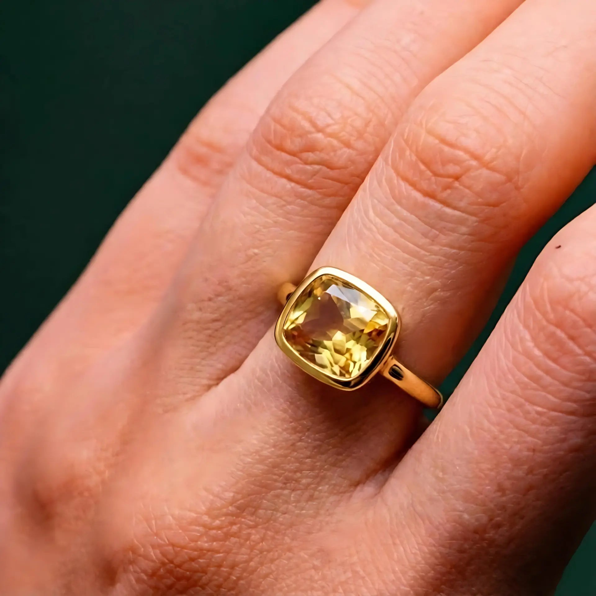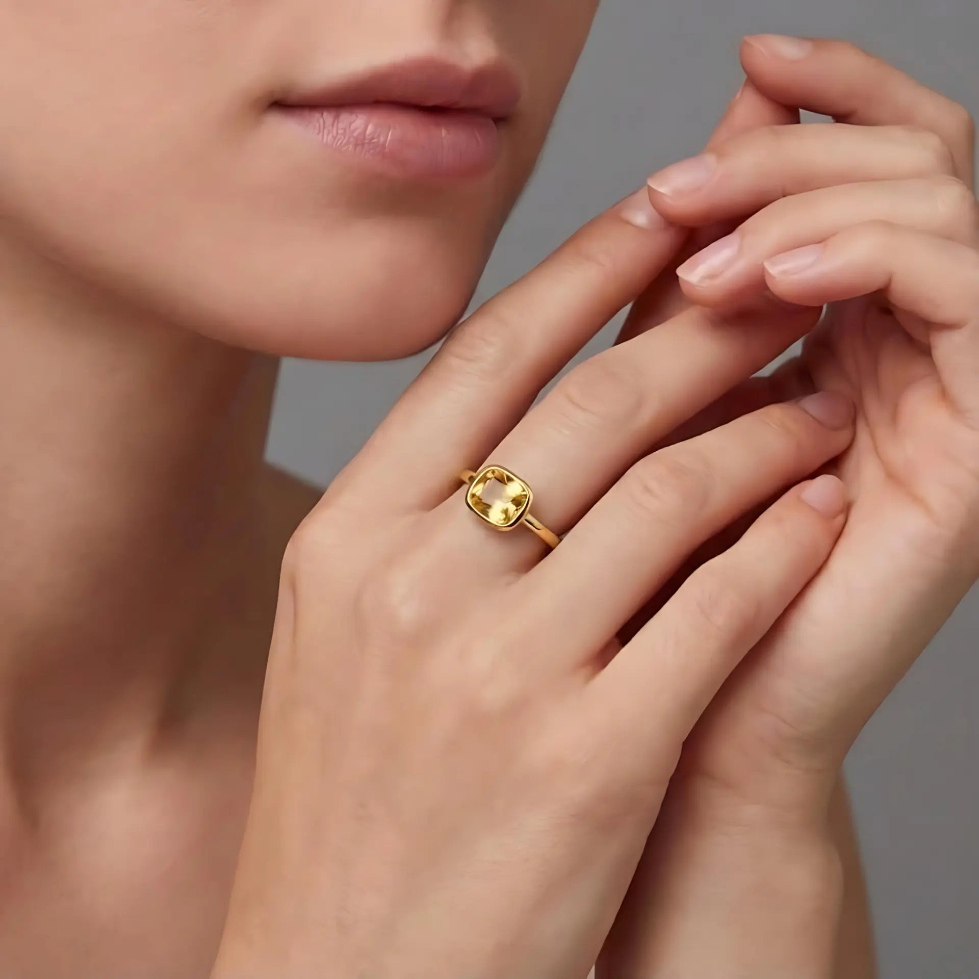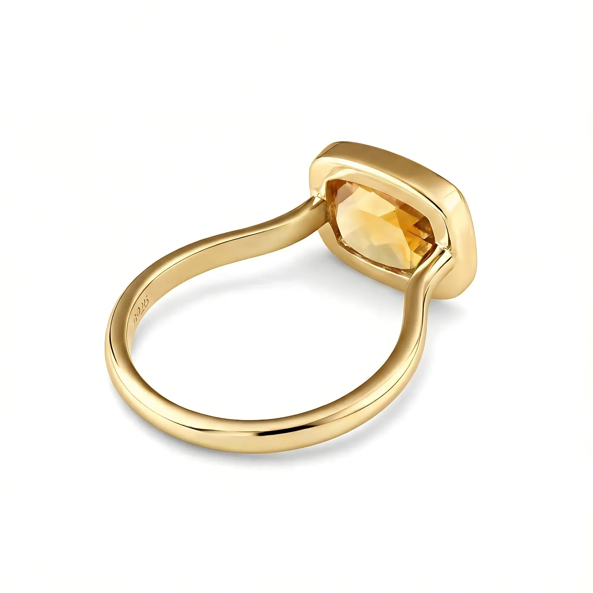 Our warm, luminous ring, crafted with a cushion-cut and centered around a citrine, gently exudes a golden abundance. Whether you're embarking on new plans or seeking a more fulfilling life, this ring will be your comforting companion. The crystal's energy is securely held within the bezel setting. It brings you a soft yet unwavering strength of abundance.