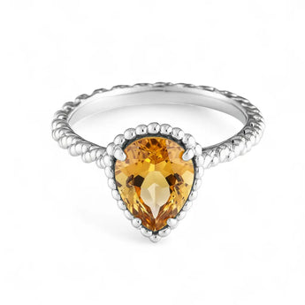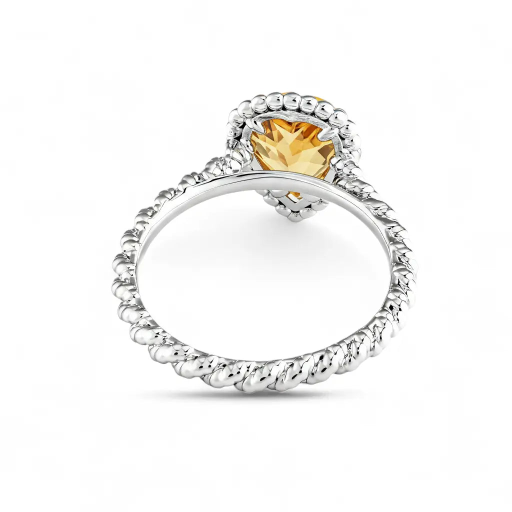 The light on this citrine ring exudes warmth, not dazzling, but gently illuminating the soul. The pear cut allows light to flow at every angle. The twisted band gently wraps, like the marks of time, or the trajectory of abundant life.