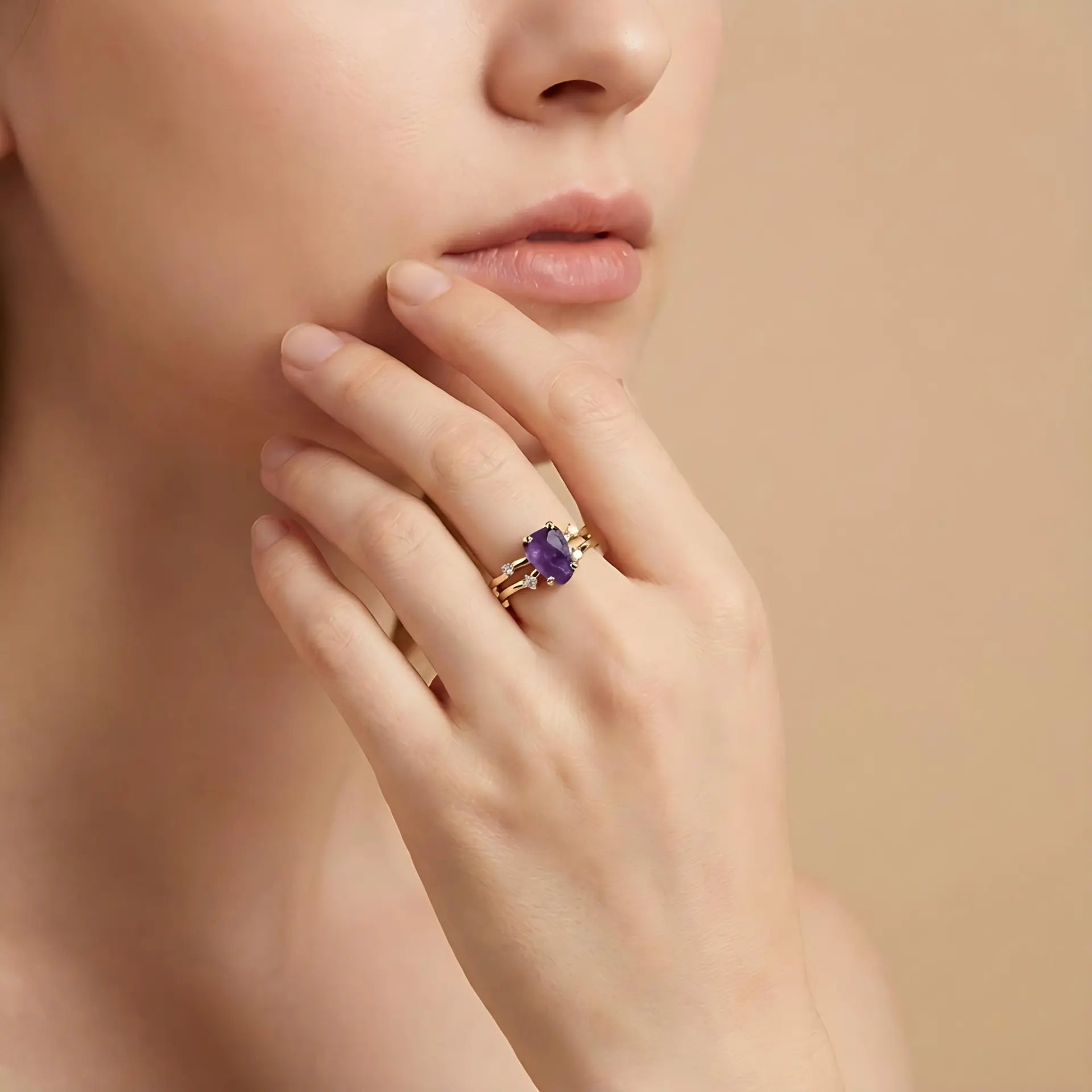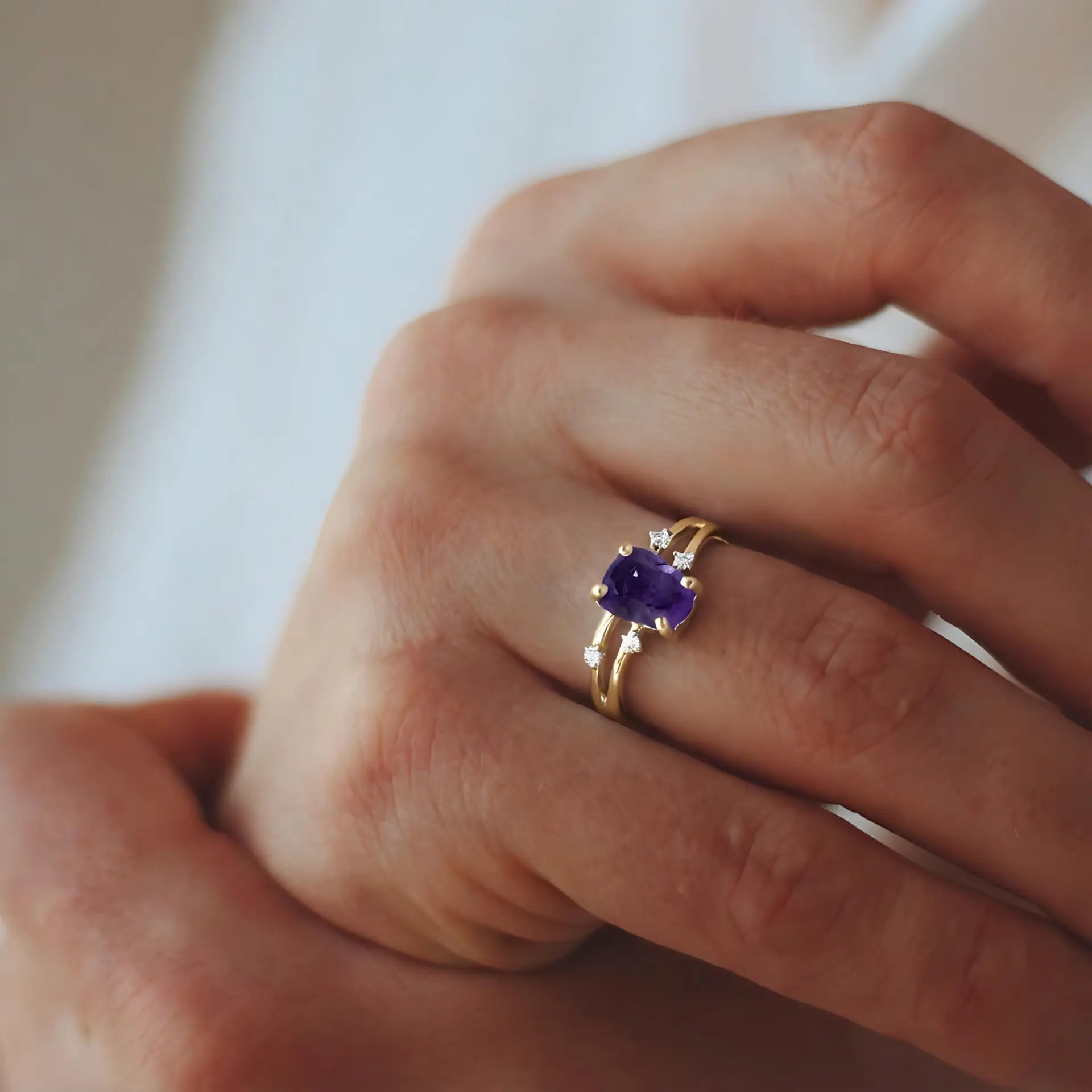The raw amethyst sits like a small, quiet sanctuary, held gently by the double band. Its soft purple lines settle under the light, easing the rhythm of the heart. Small zircon accents add a gentle brightness. Amethyst symbolizes tranquility, offering calm support that helps you steady yourself and return to your own pace.