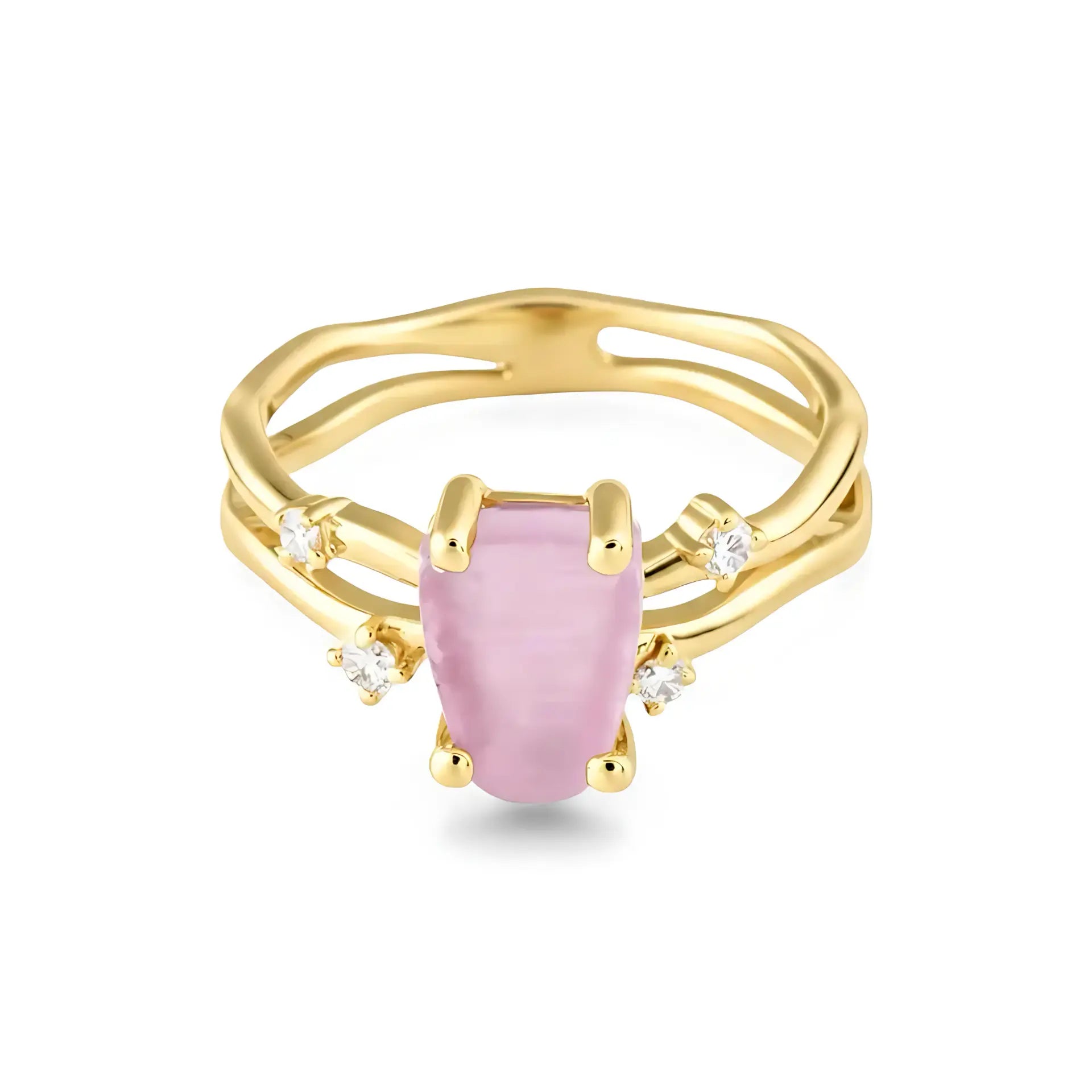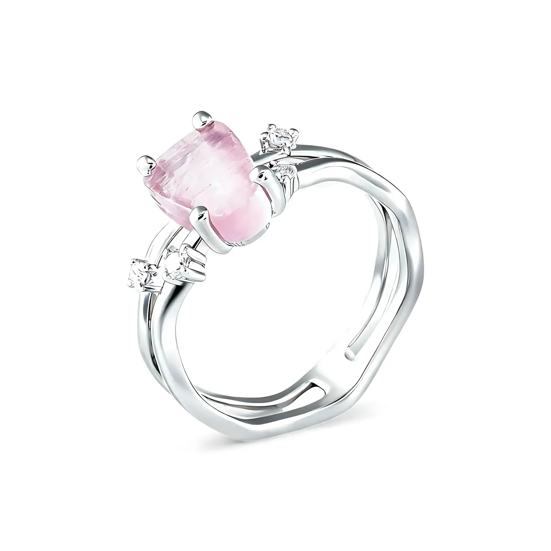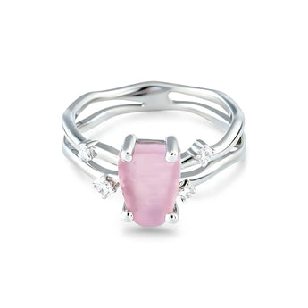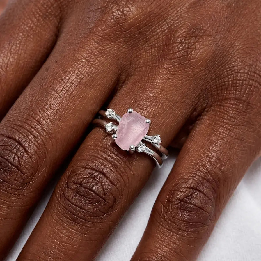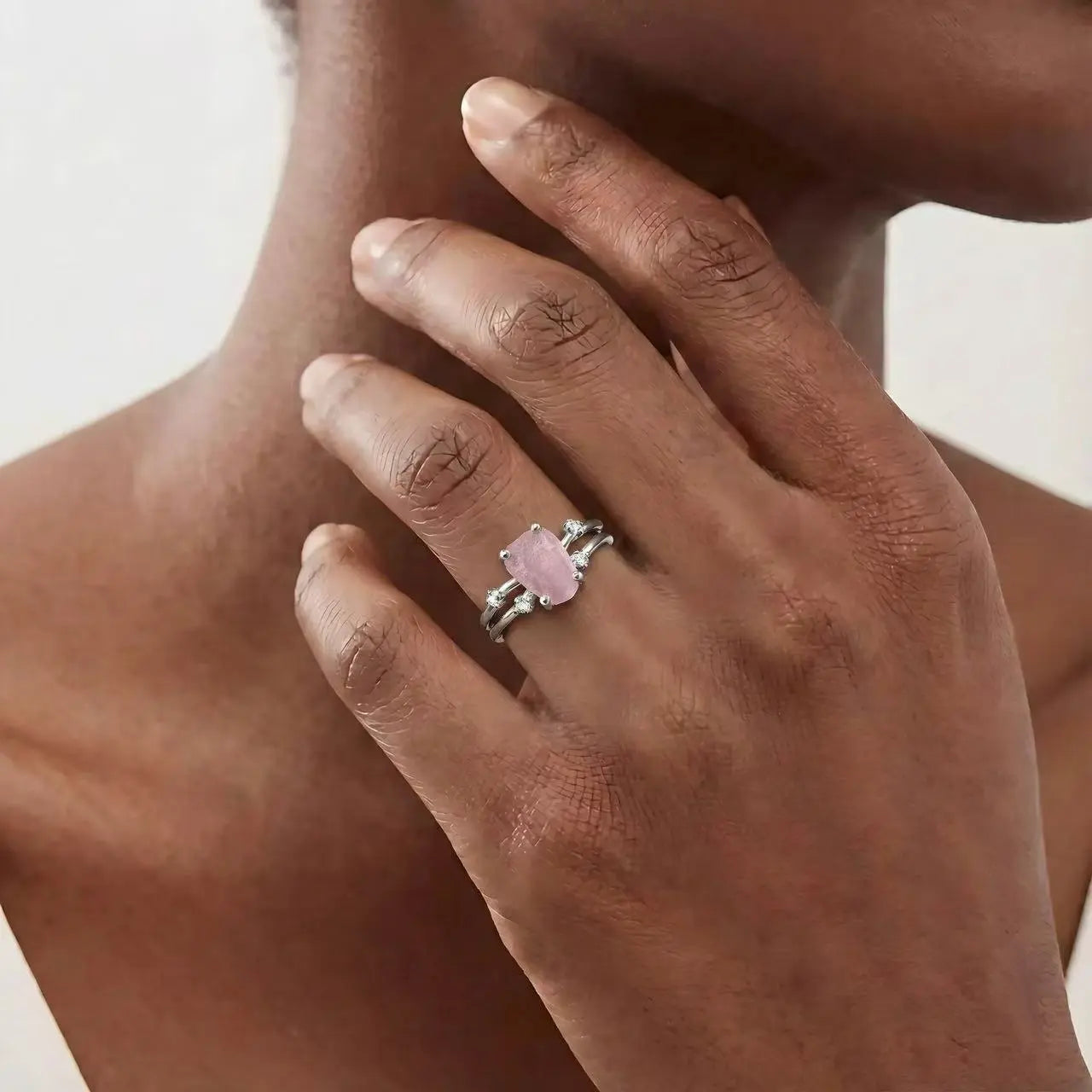 The soft pink of the raw rose quartz feels like a gentle breath held within the double band. Its delicate texture quietly turns your attention inward. Small zircon accents add lightness and grace. Rose quartz symbolizes self-love, offering a calm presence that helps you untangle your emotions and hold yourself with kindness.