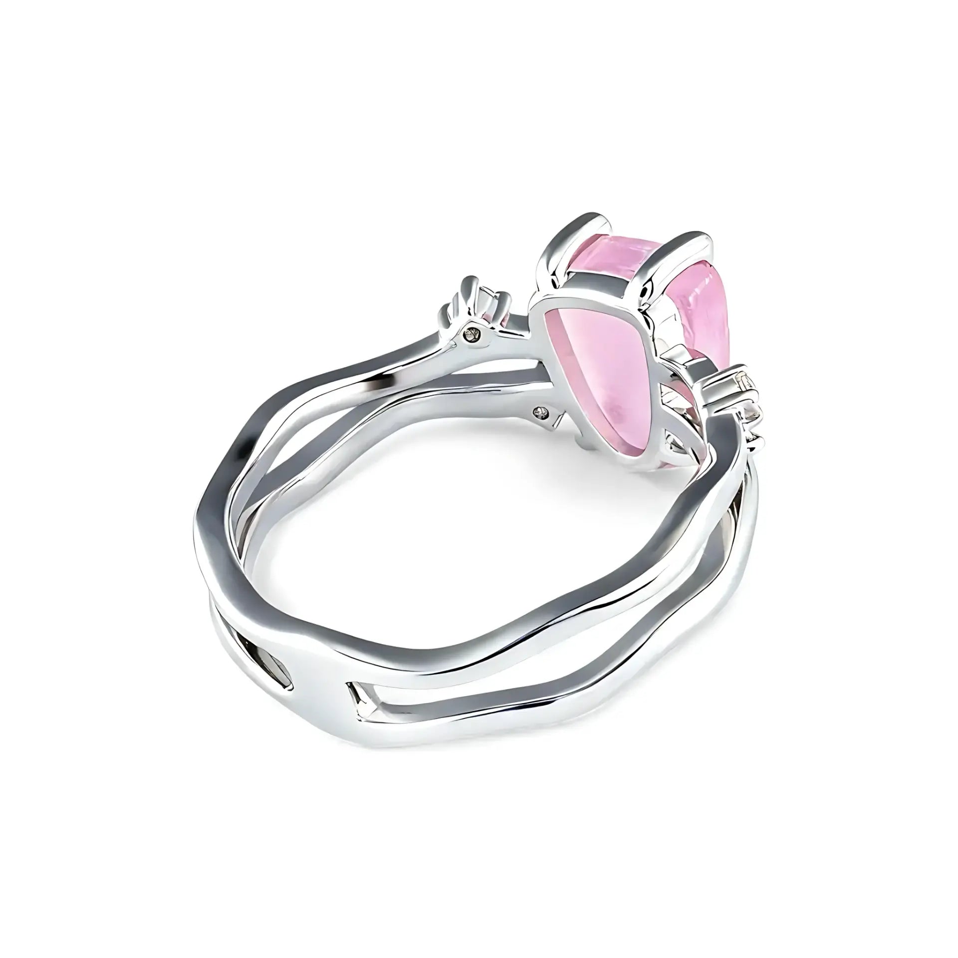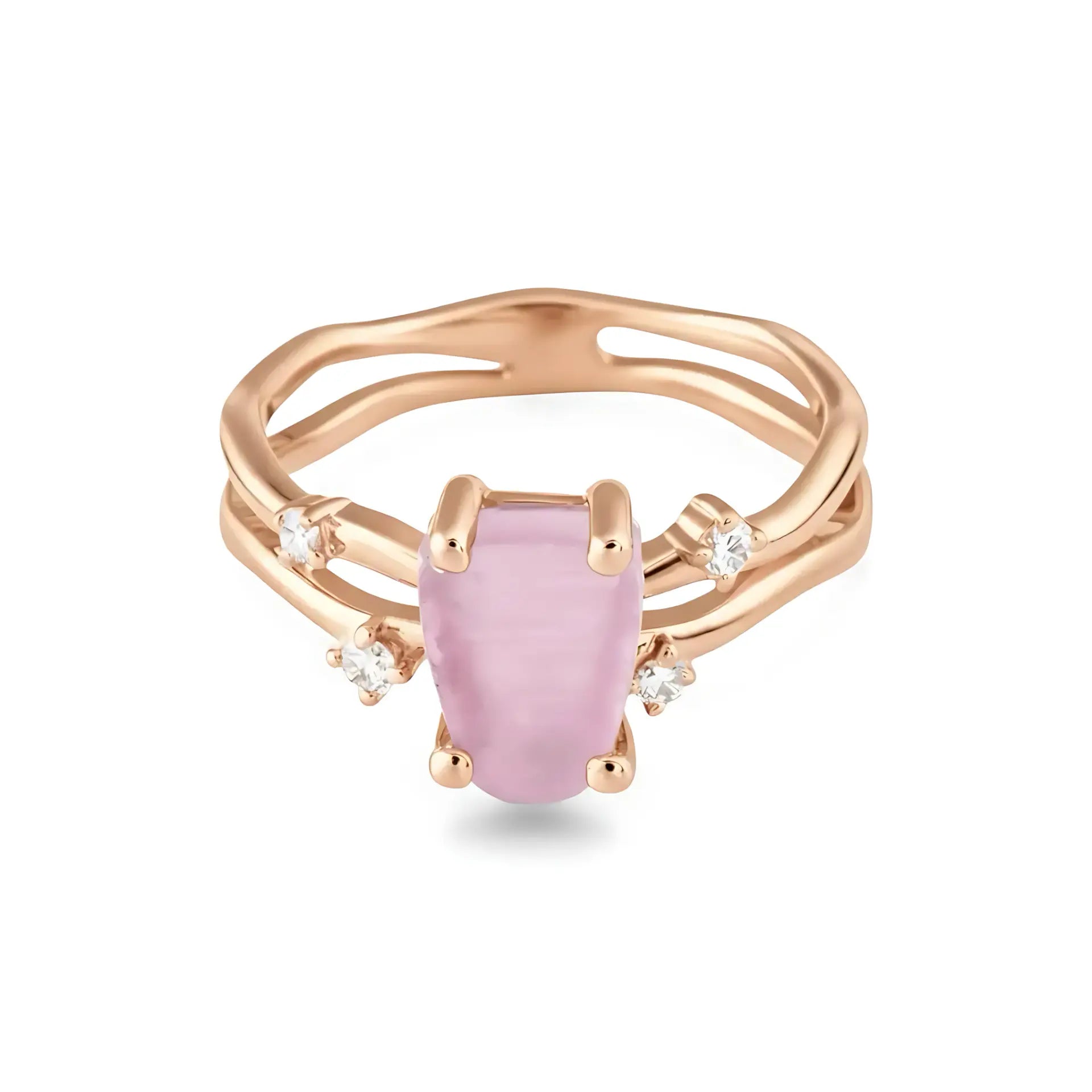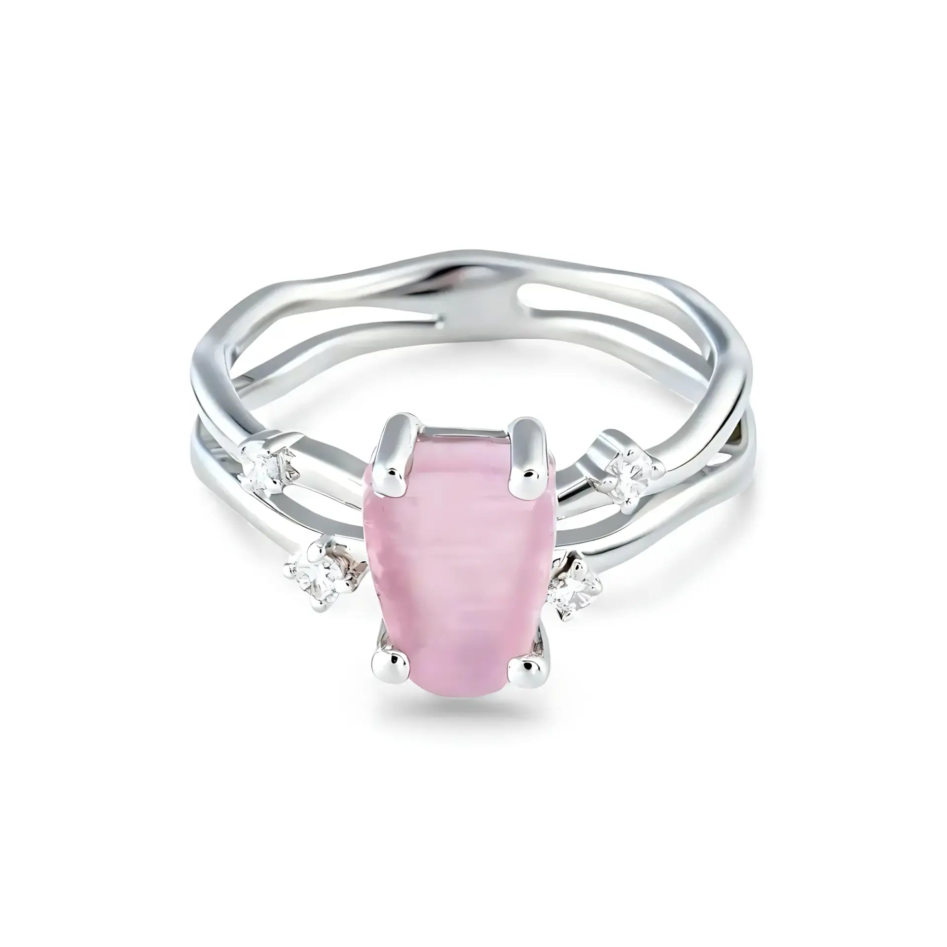 The soft pink of the raw rose quartz feels like a gentle breath held within the double band. Its delicate texture quietly turns your attention inward. Small zircon accents add lightness and grace. Rose quartz symbolizes self-love, offering a calm presence that helps you untangle your emotions and hold yourself with kindness.