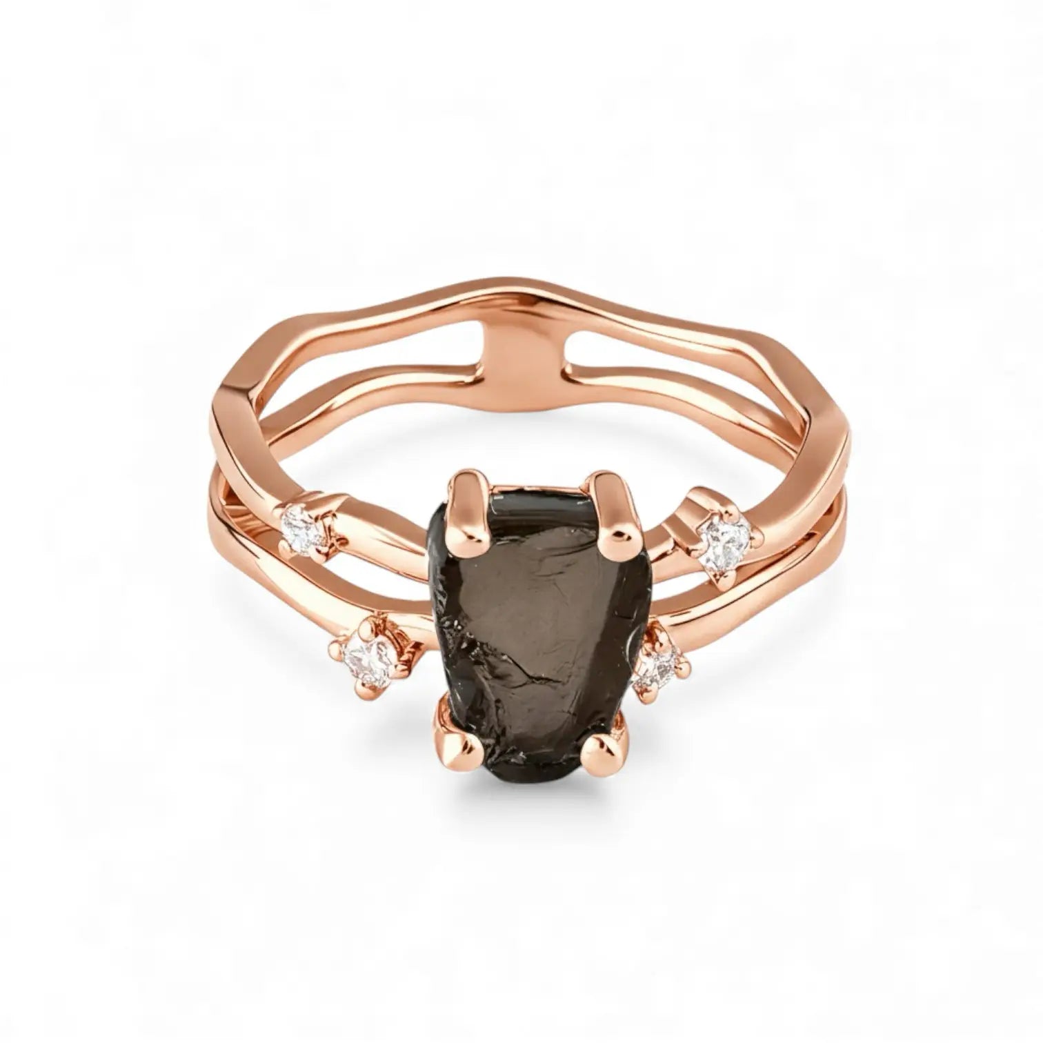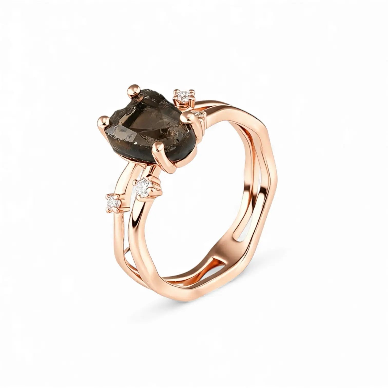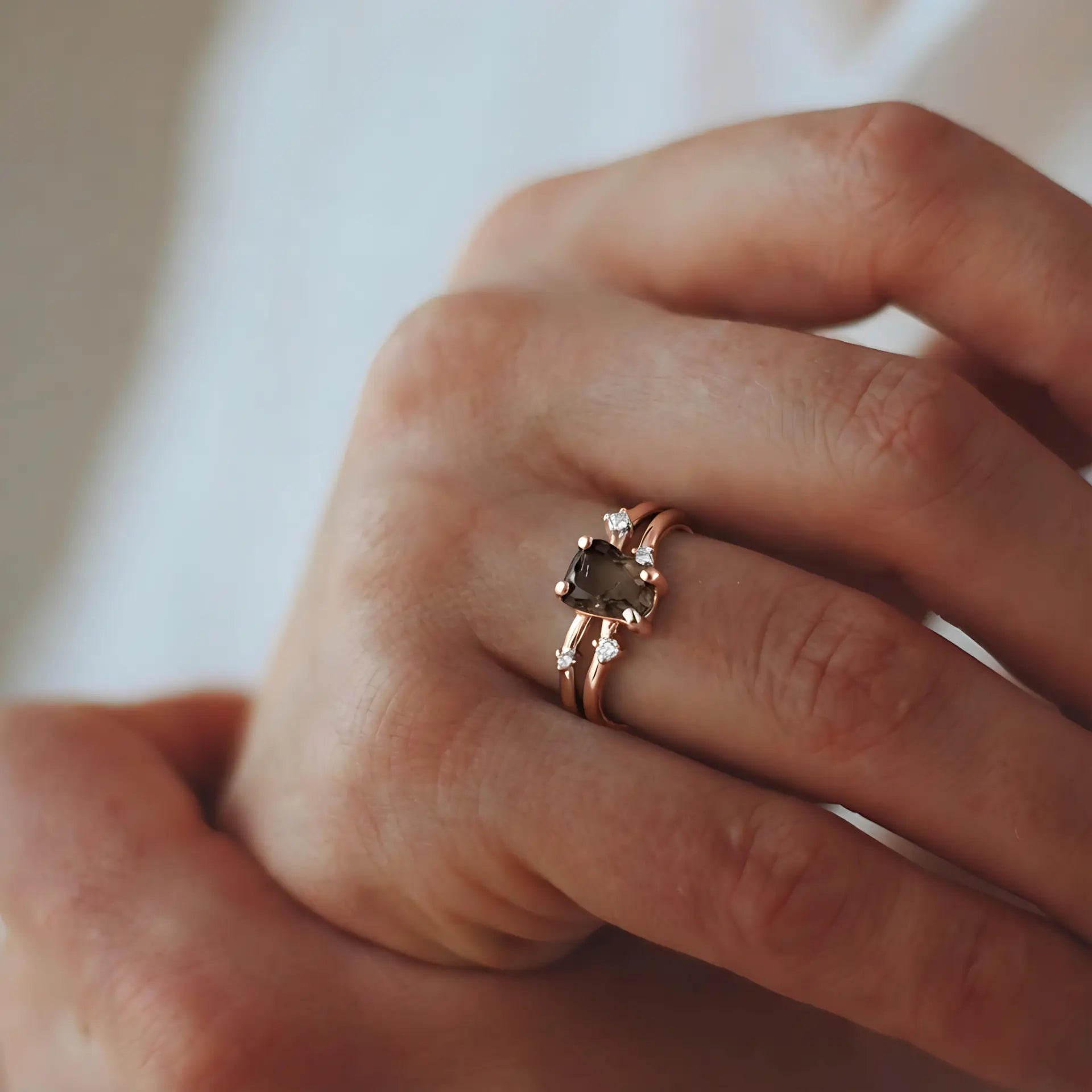 The raw smoky quartz sits on the double band like a quiet ember, dark yet softly lit from within. Its warm brown tone feels grounded, creating a calm contrast with the bright zircon beside it. The flowing lines of the band add a subtle rhythm. Smoky quartz symbolizes grounding energy, offering a steady presence that helps you feel anchored and clear in your own space.