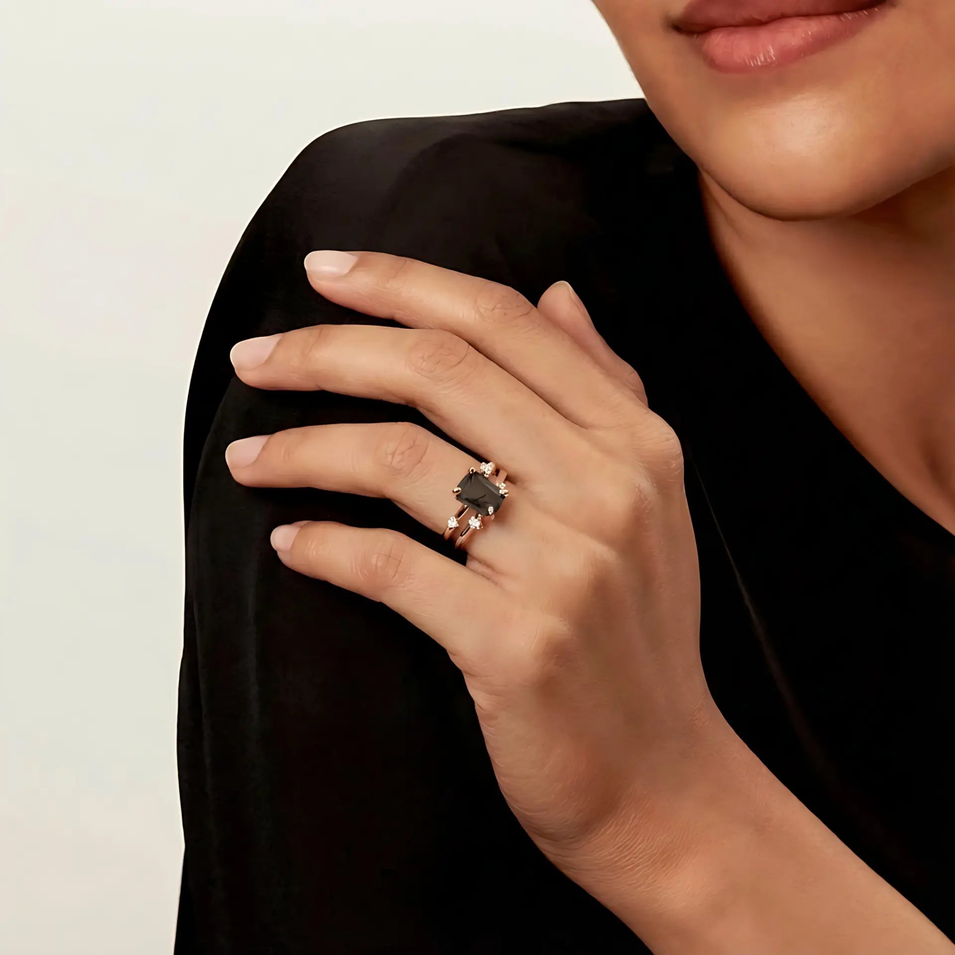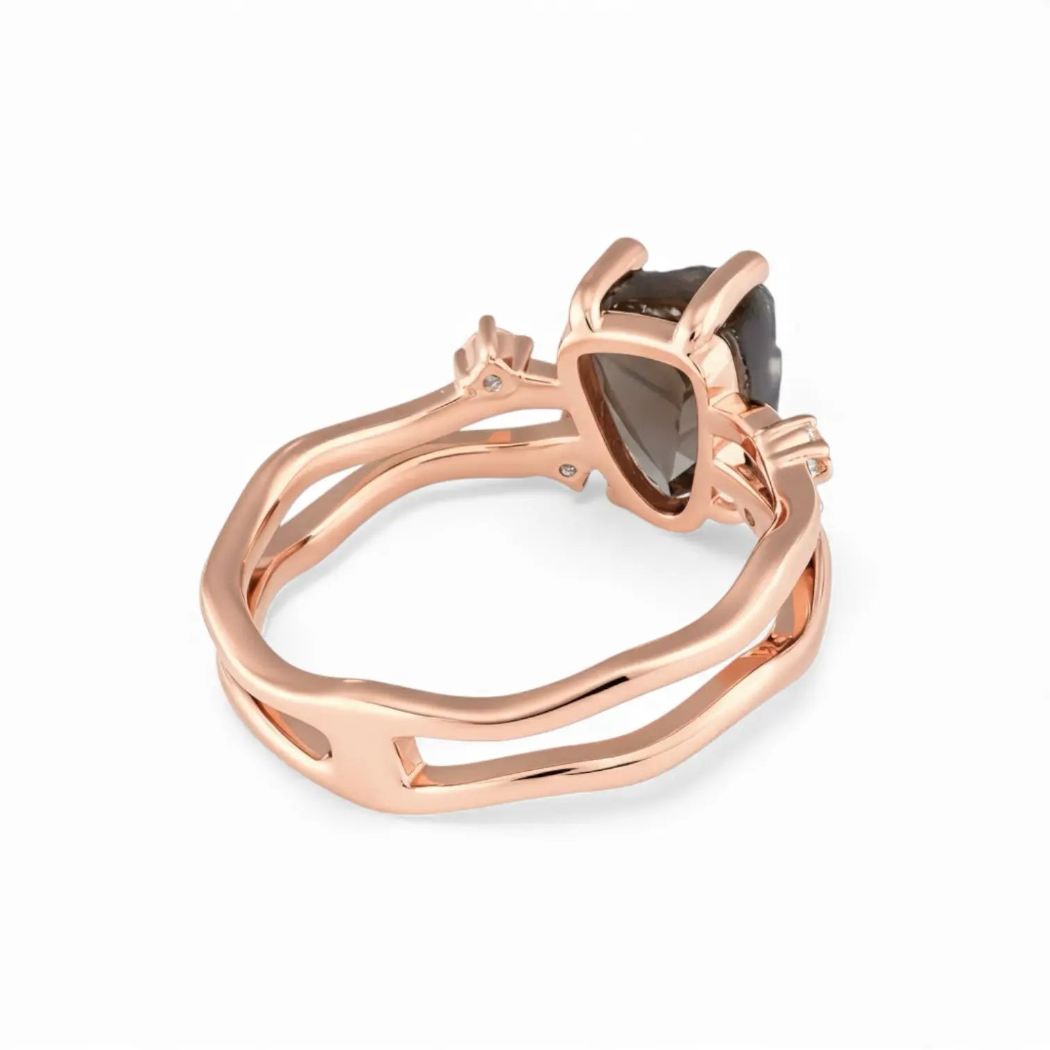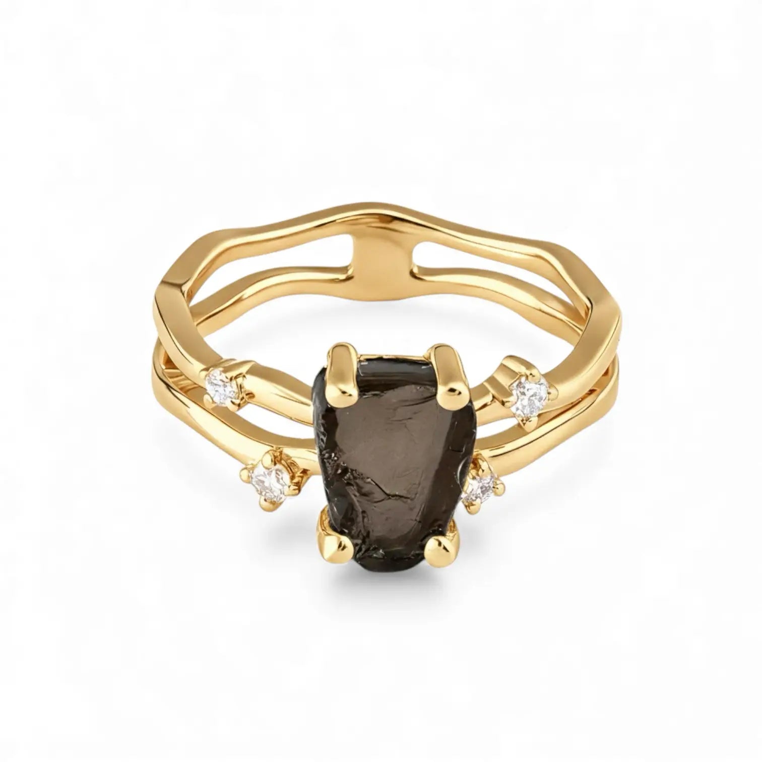 The raw smoky quartz sits on the double band like a quiet ember, dark yet softly lit from within. Its warm brown tone feels grounded, creating a calm contrast with the bright zircon beside it. The flowing lines of the band add a subtle rhythm. Smoky quartz symbolizes grounding energy, offering a steady presence that helps you feel anchored and clear in your own space.