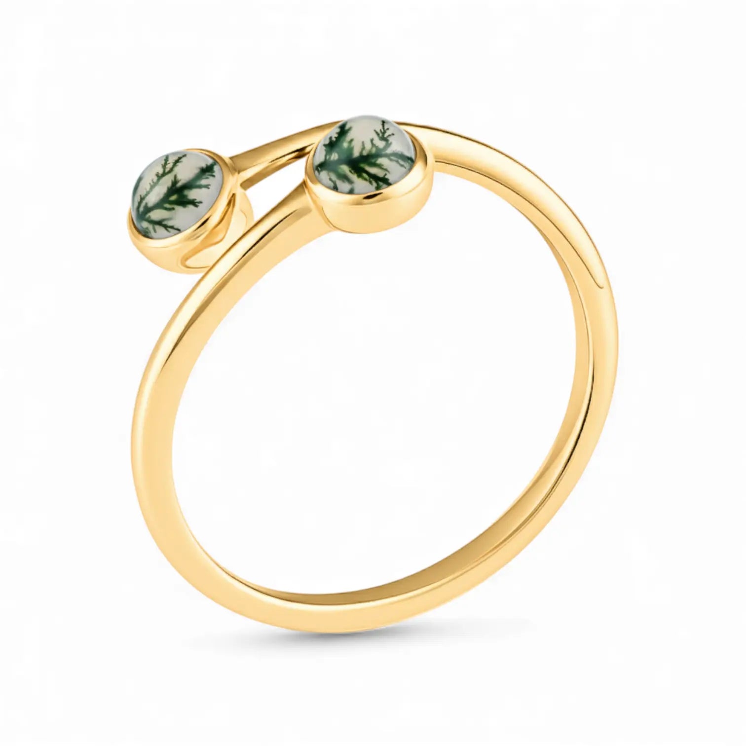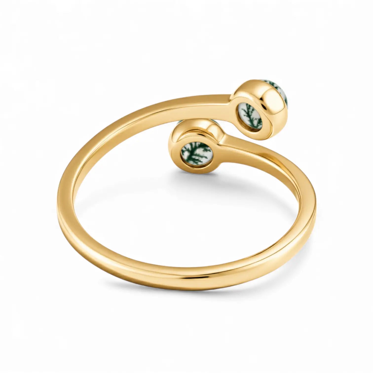 This moss agate double cabochon ring from the Twins Collection is like bringing nature to your finger. Moss-like patterns appear inside the translucent stone. In the light, they resemble tiny branches and leaves. The double cabochons sharpen the green patterns, as if life is quietly growing within. Let the rhythm of slow growth settle into your life. It will stay with you, capturing the moments in which you grow without noticing.