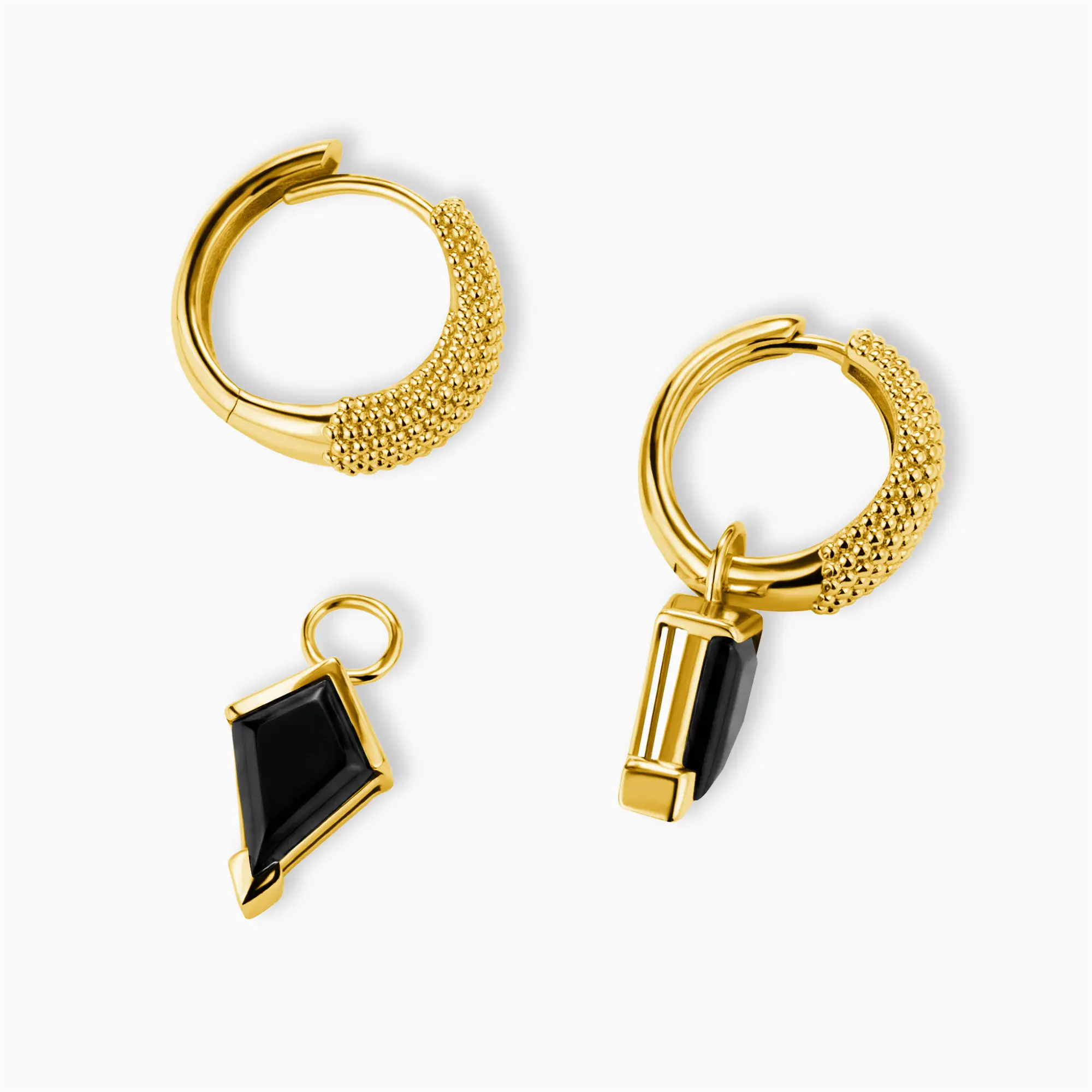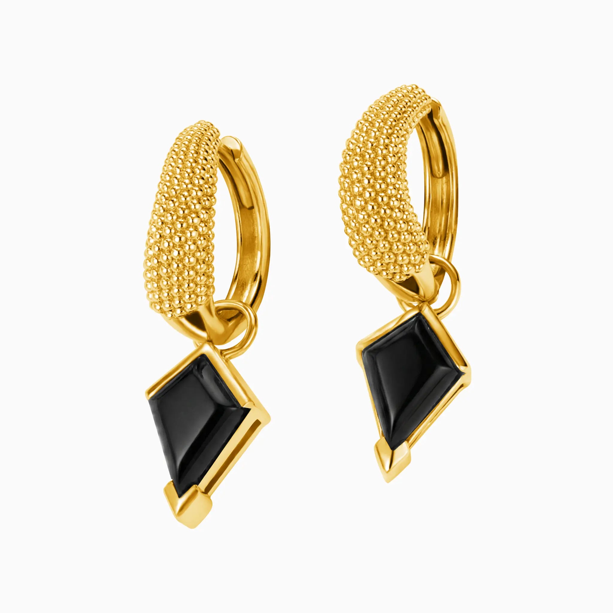 Show your inner strength with these architectural kite-cut earrings. The interplay between granulated hoops and the sharp geometry of Black Onyx creates a look of bold sophistication. More than a design statement, Black Onyx is a stone of Willpower, empowering you to stay focused and resilient. A perfect balance of modern art and personal power.