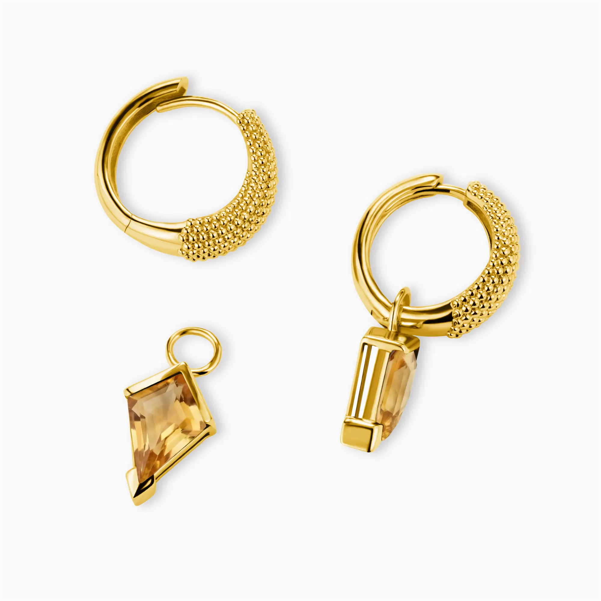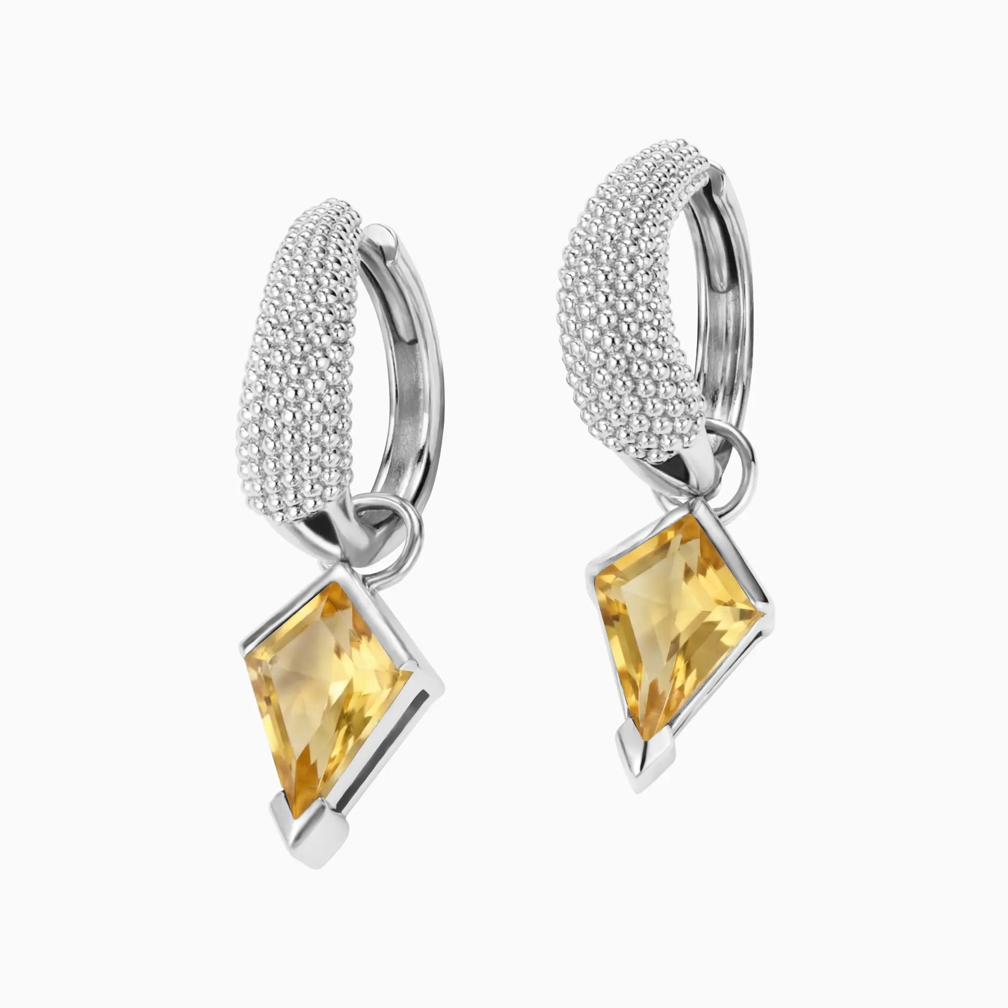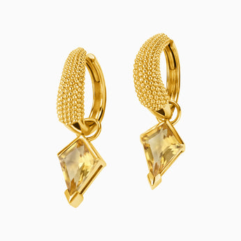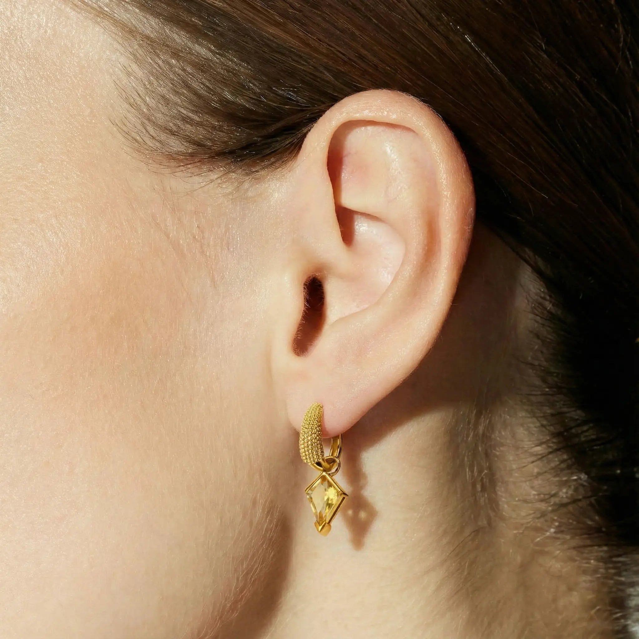 Embrace the golden glow of our Citrine Kite Charm Hoops. These earrings feature intricately textured gold bands paired with a striking, sharp angled kite cut citrine. Known as the stone of abundance, citrine reflects the warmth of a setting sun. Its unique geometric design blends modern edge with timeless elegance, inviting prosperity into every moment.