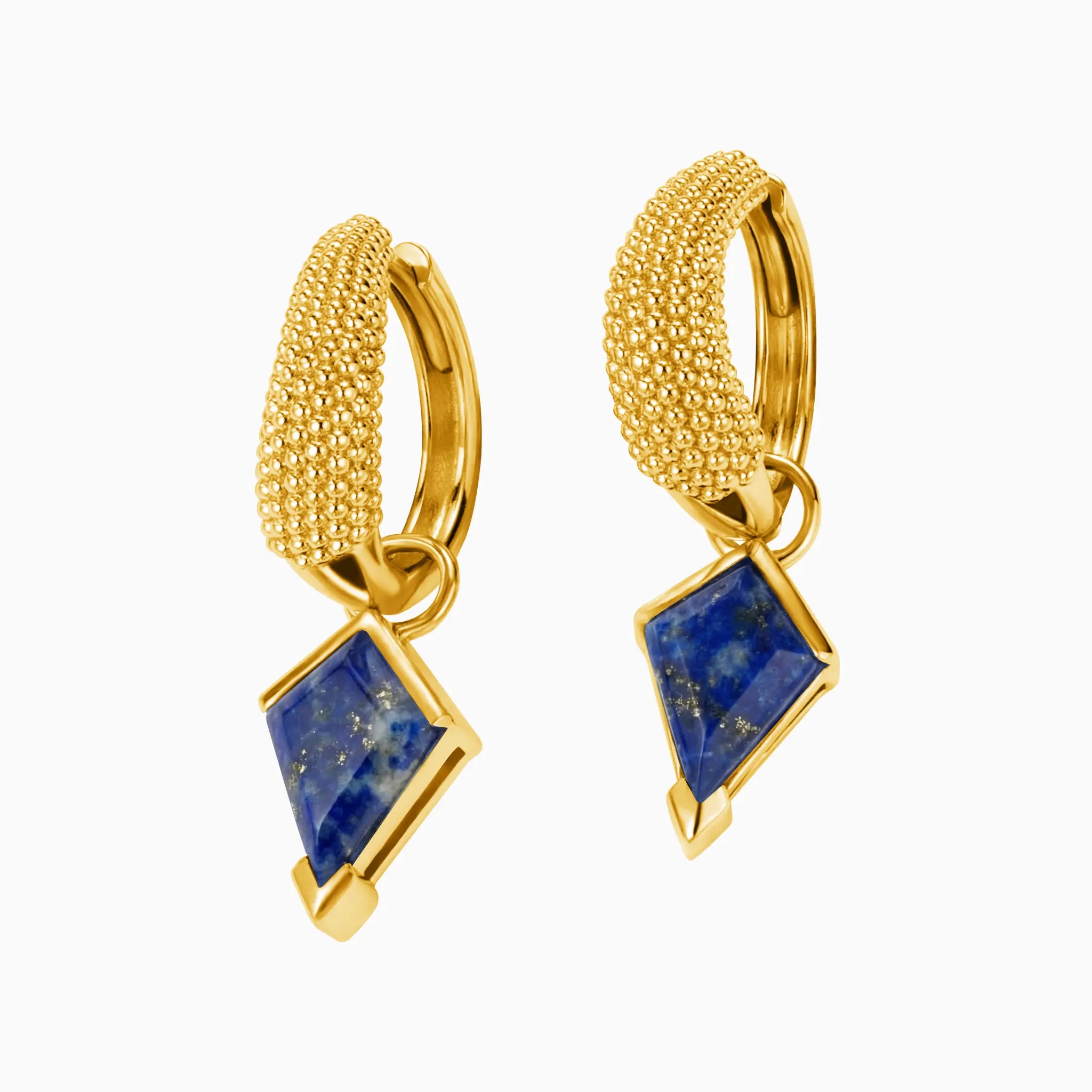 Capture the essence of a starlit sky. These crafted hoops feature a delicate granulated texture, cradling striking kite-shaped Lapis Lazuli drops. Long revered as the stone of Wisdom, Lapis encourages clarity and inner truth. The unique geometric design balances modern artistry with a soulful, ancient depth. A silent, elegant companion for the thoughtful spirit.