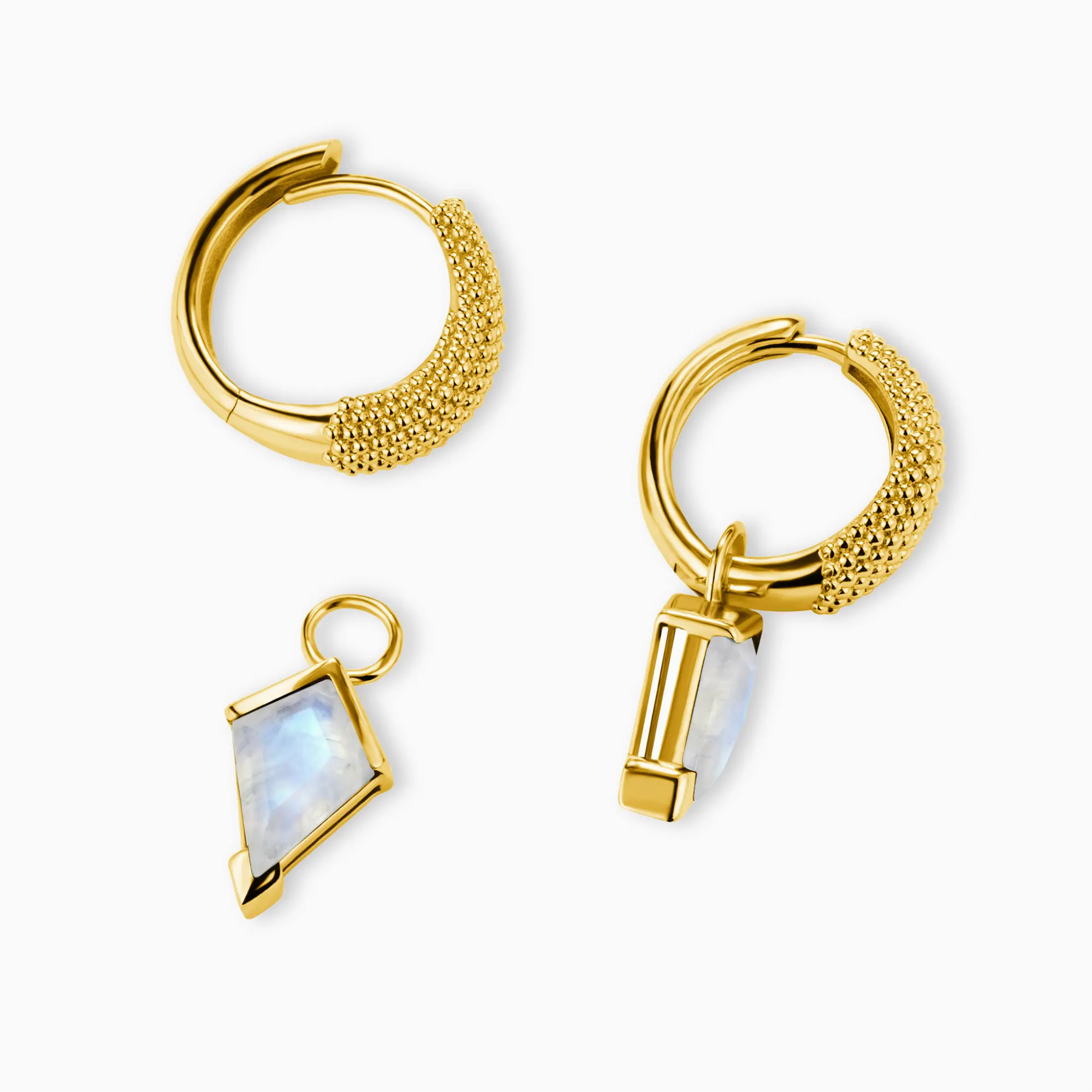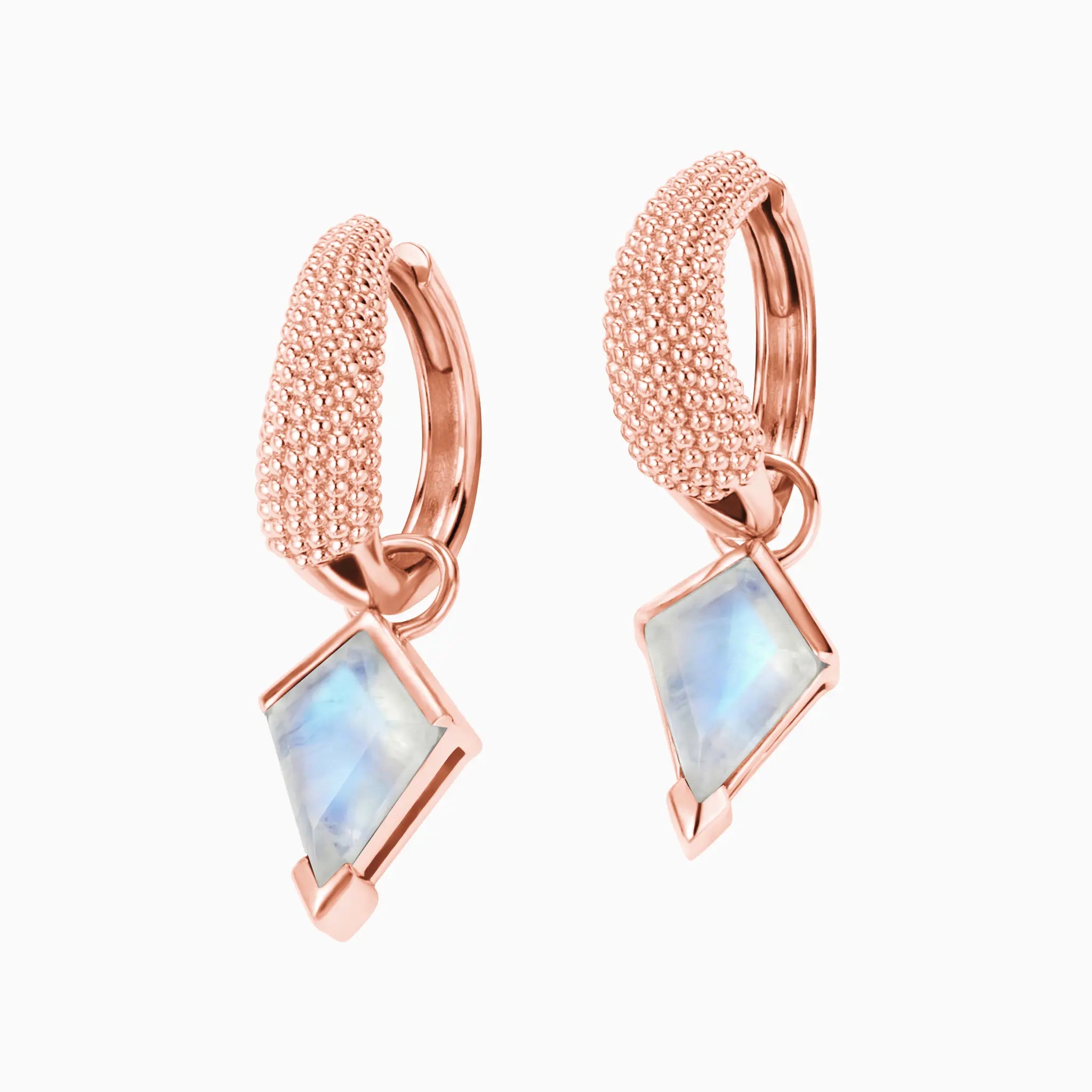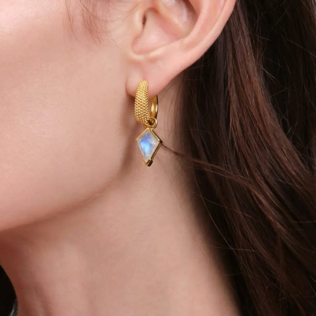 Luminous kite-shaped Moonstones dangle from intricately beaded hoops, creating a striking interplay of light and shadow. The rich, granulated texture of the frames offers a bold contrast to the smooth, ethereal glow of geometric gems. Every movement reveals a shifting white and blue sheen, inviting you to trust your inner pulse. These pieces bridge the gap between tactile craft and modern elegance.
