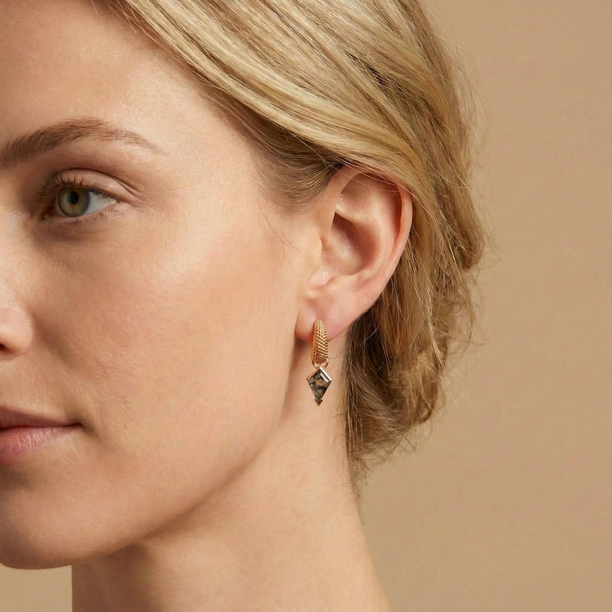 Channel your inner strength with our Valkyrie earrings. Featuring intricate granulation and a sharp kite cut moss agate, these pieces blend warrior elegance with natural growth. Moss Agate symbolizes grounding and renewal, mirroring the forest's soul. A striking, organic design for the modern spirit seeking power and peace.