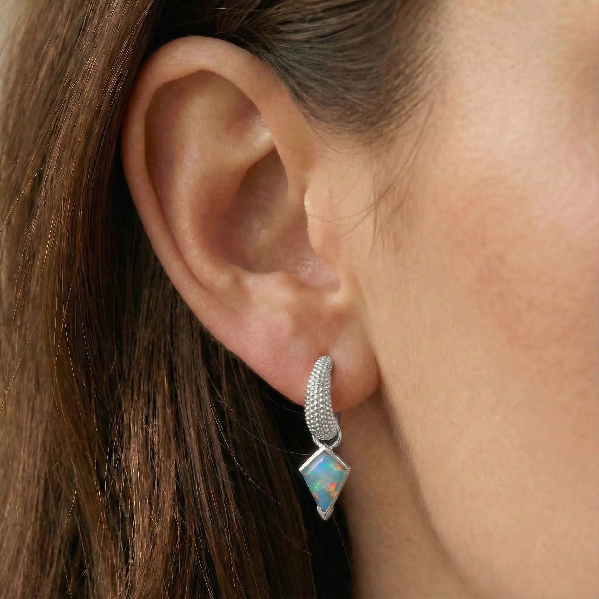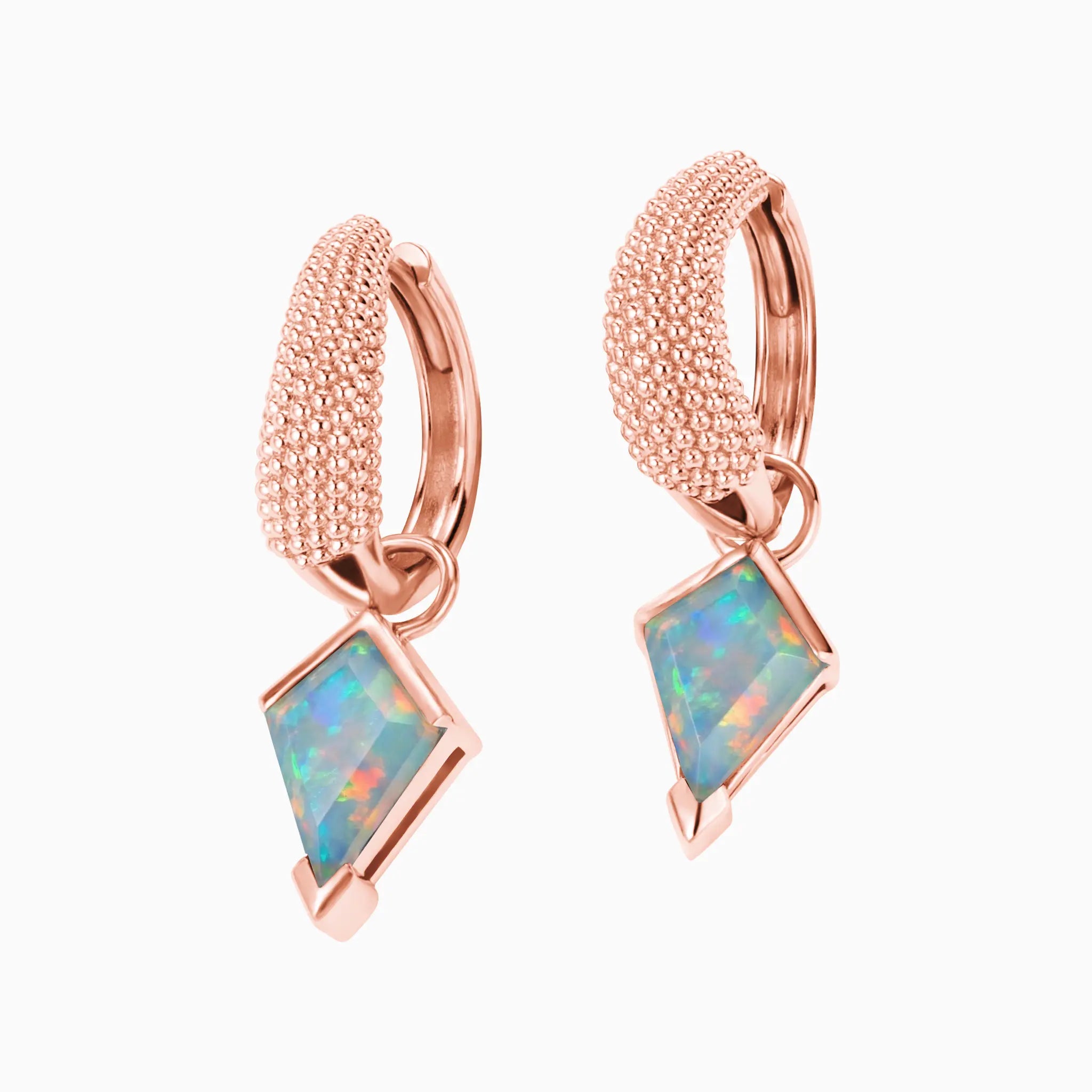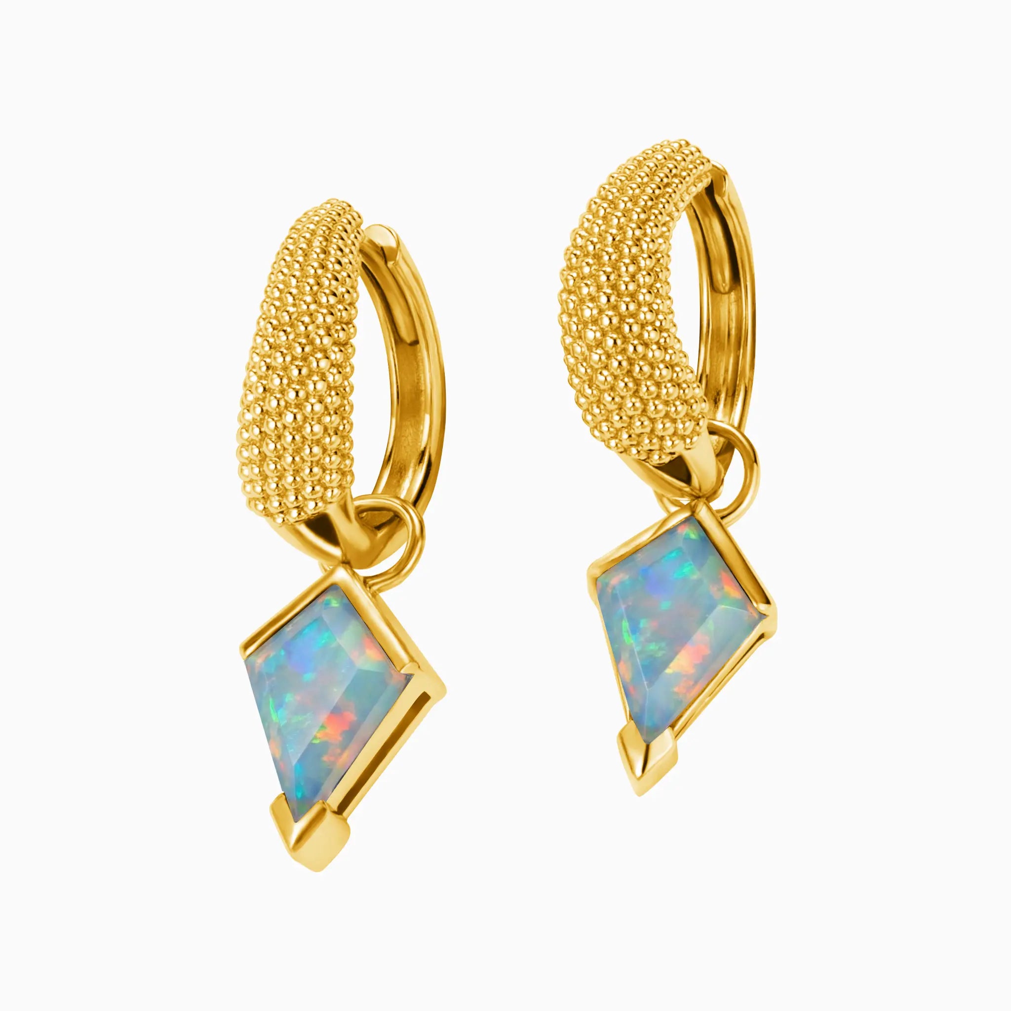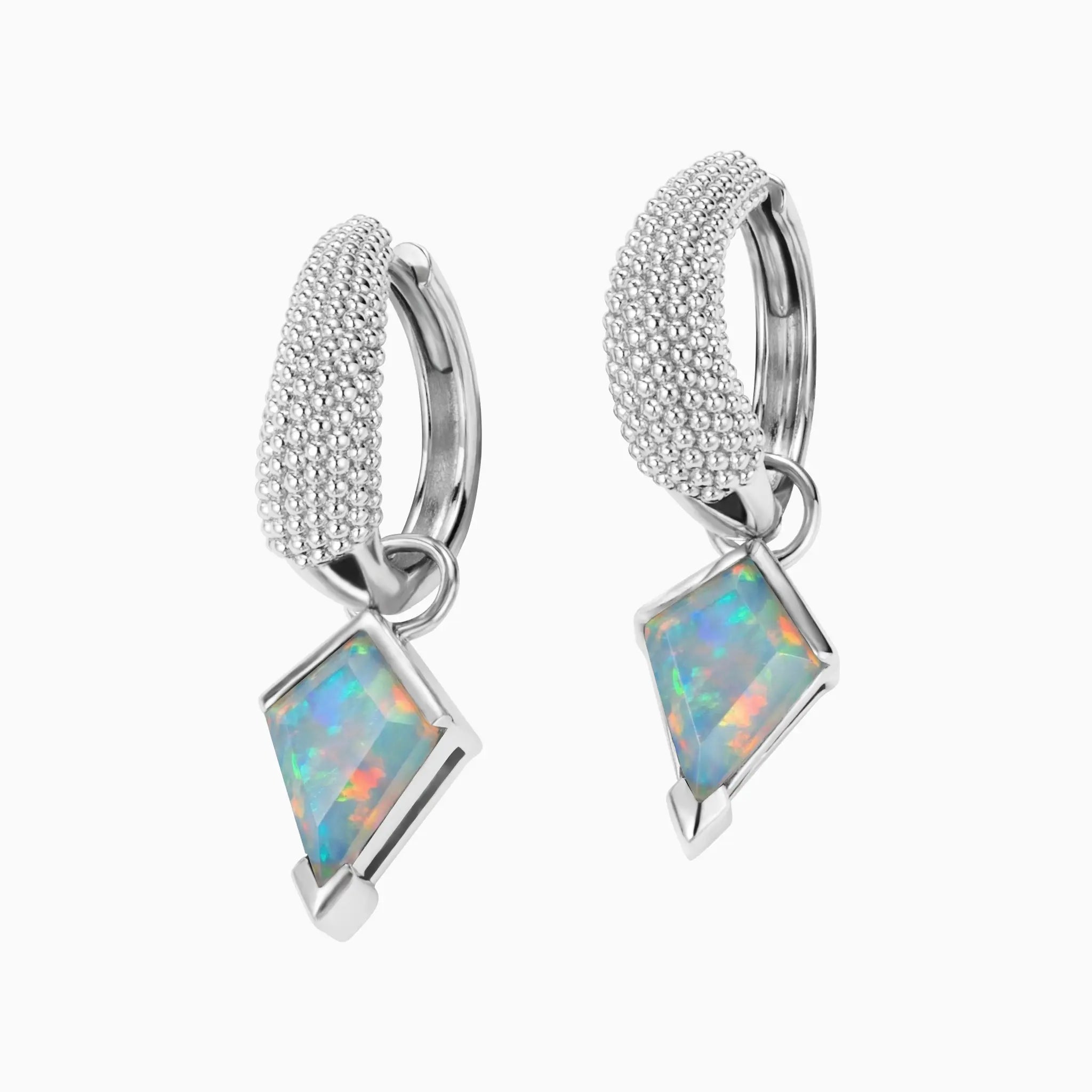Adorn your ears with the striking geometry of these kite-cut opal drops. Each iridescent stone captures a spectrum of light, channeling a radiant energy that mirrors a bright and optimistic spirit. The intricate beaded texture on the hoops adds a tactile, modern edge to the fluid play of color. These pieces frame your face with a glow of pure positivity and effortless architectural style.