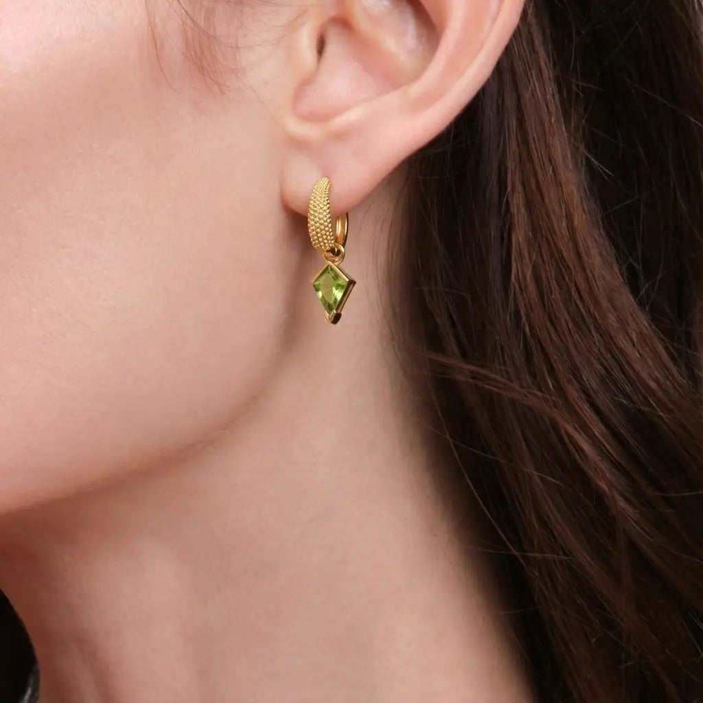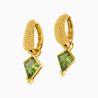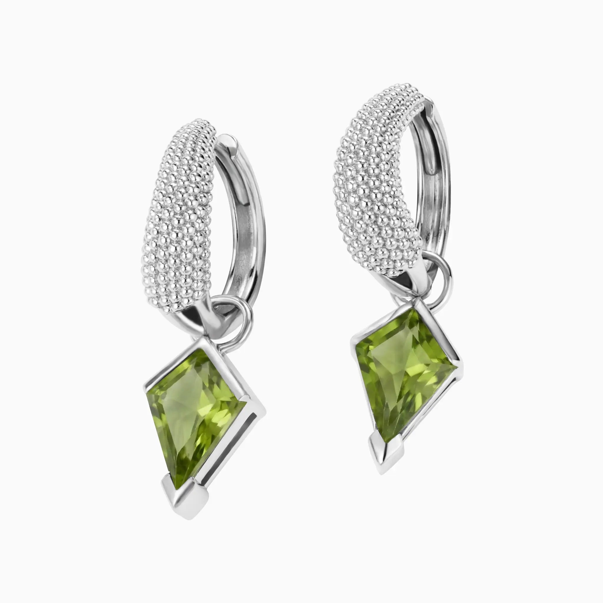 Gently swaying, these beaded hoops carry a sharp kite-cut peridot that pulses with life. The intricate texture creates a soft rhythm, guiding the gaze to the vibrant green core. This earring design is a tribute to the unseen threads that connect us, reflecting the quiet power of empathy, a heart that truly feels and understands the stories of others.