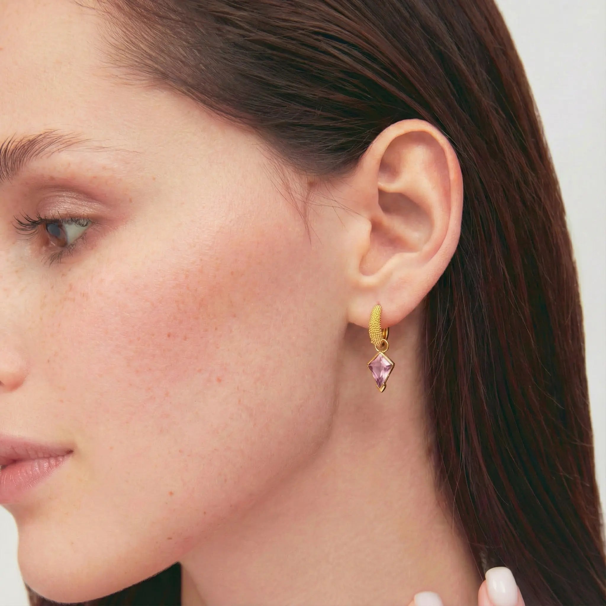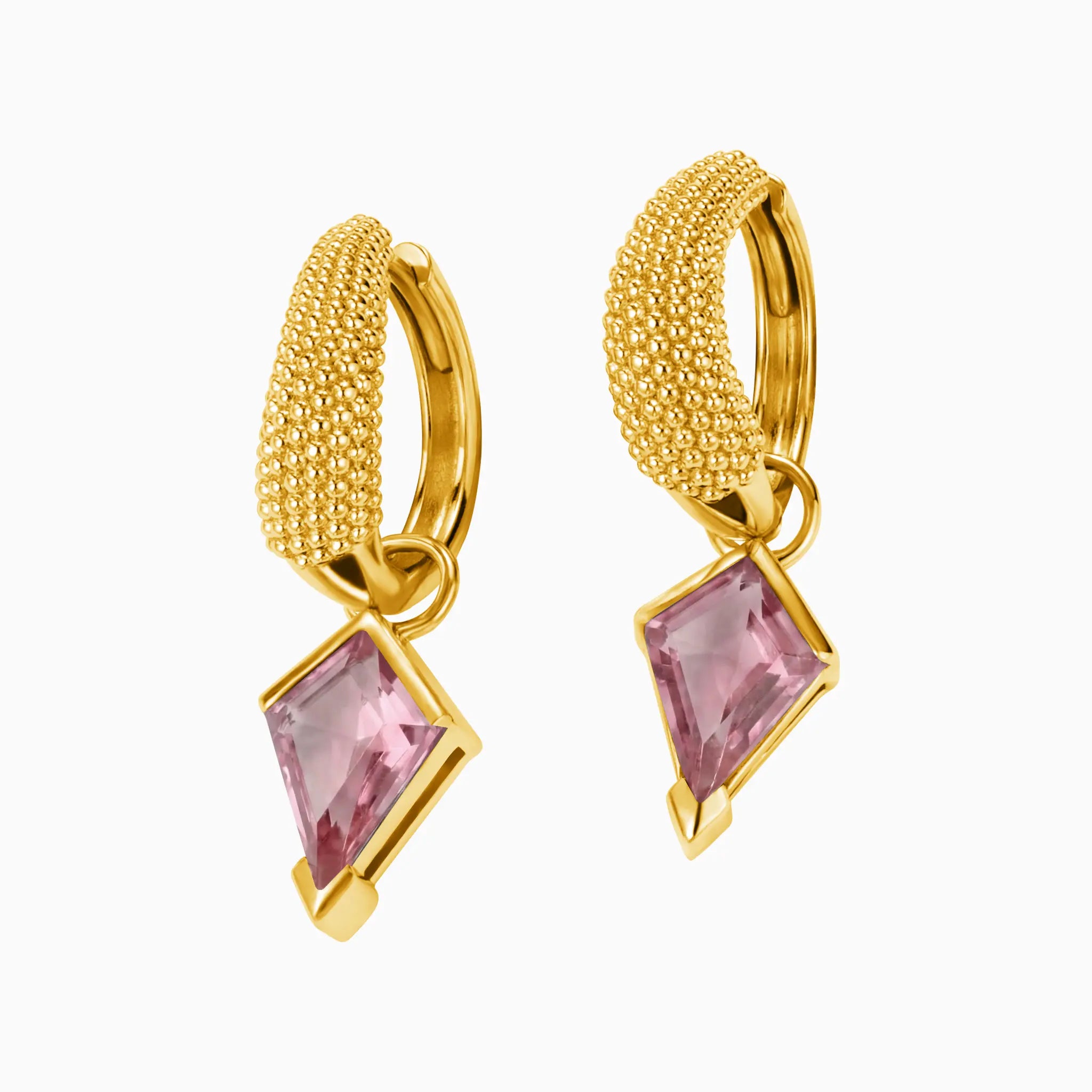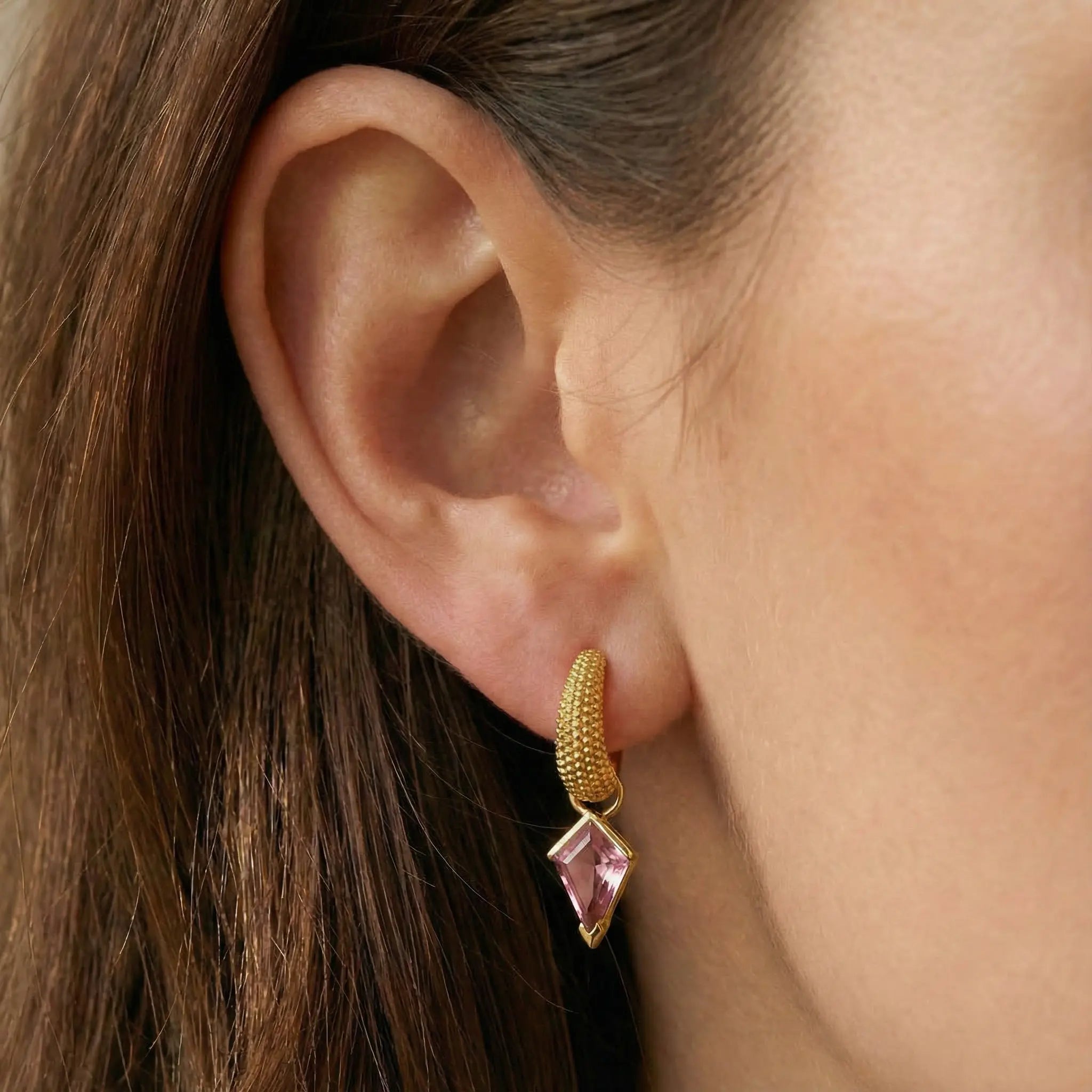 Adorn yourself with the soft glow of pink tourmaline, a gemstone celebrated for its connection to love and happiness. These earrings pair unique kite-cut stones with rich, beaded gold settings that feel both modern and timeless. Their fluid, organic design adds a touch of artistic flair, making them a meaningful gift or a soulful treat.