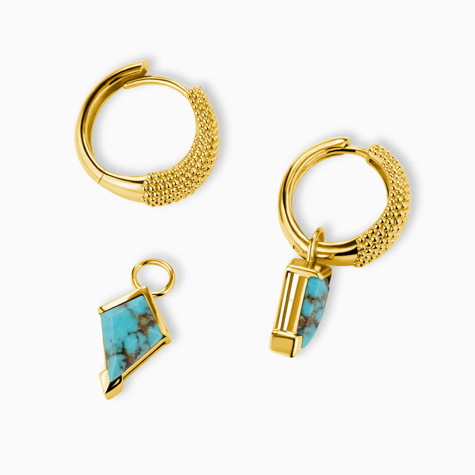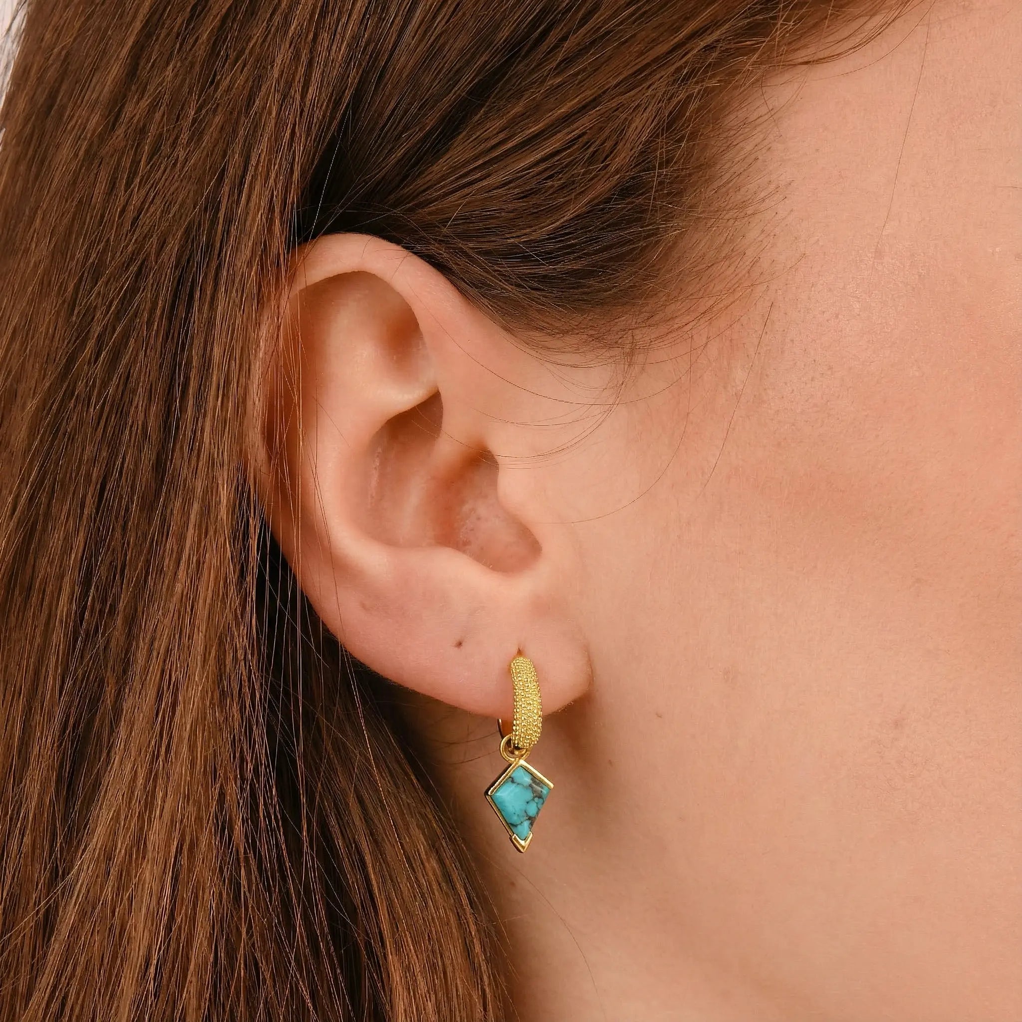 Radiate serenity and sophistication with these masterfully crafted drops. A textured gold arc meets the sharp lines of kite-cut turquoise, creating a visual dialogue between light and earth. Renowned for its restorative healing properties, the turquoise stone offers a protective embrace for the wearer. This pair transforms minimalist outfits into intentional statements of grace and inner peace.