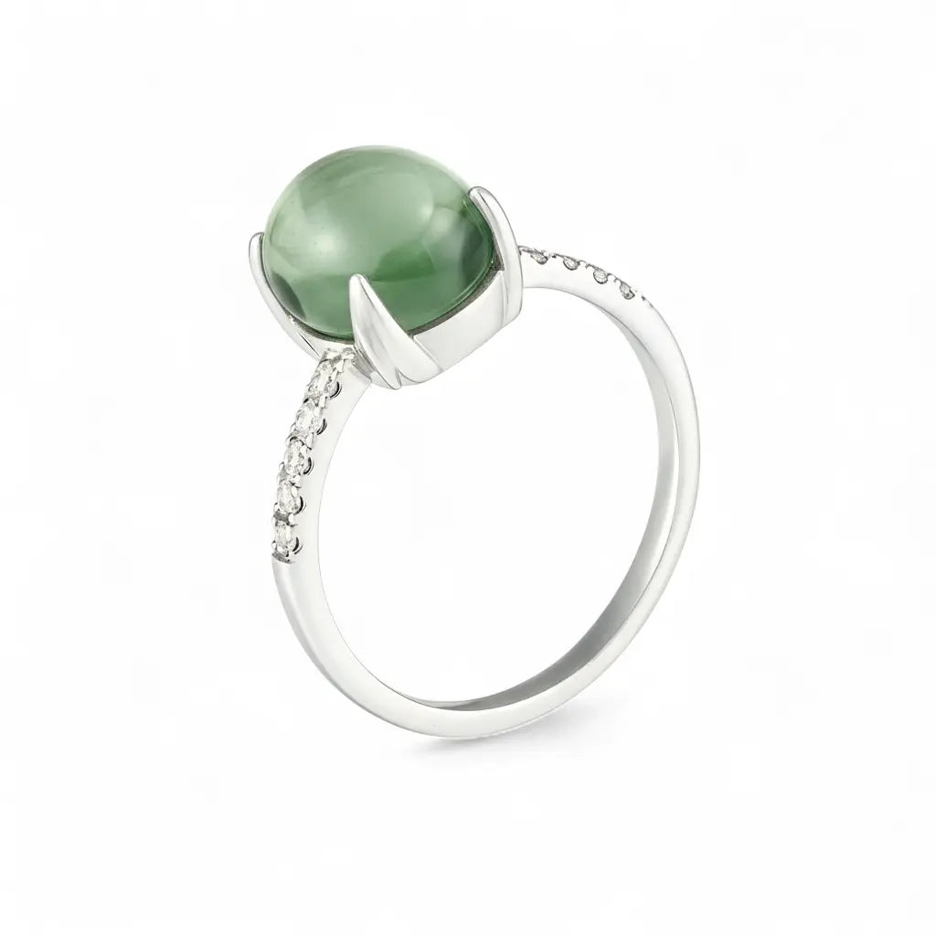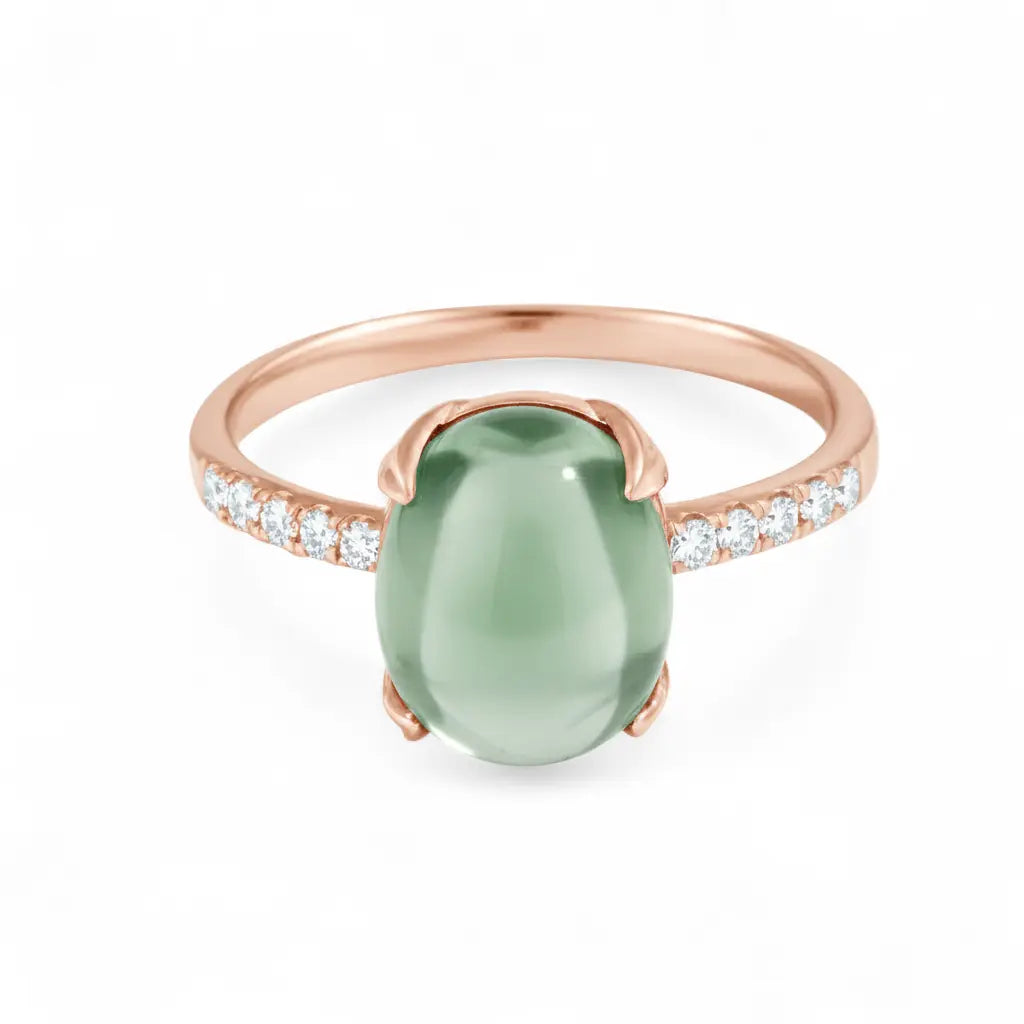 Look at our green amethyst cabochon-shaped ring! Such a soft, gentle green. Wearing it on your finger is like carrying the freshness of nature with you. The smooth, rounded shape of the cabochon shimmers delicately in the light and shadow. Even in the busiest moments, it gently nudges you to pause. Feel the harmony and comfort of your present surroundings.