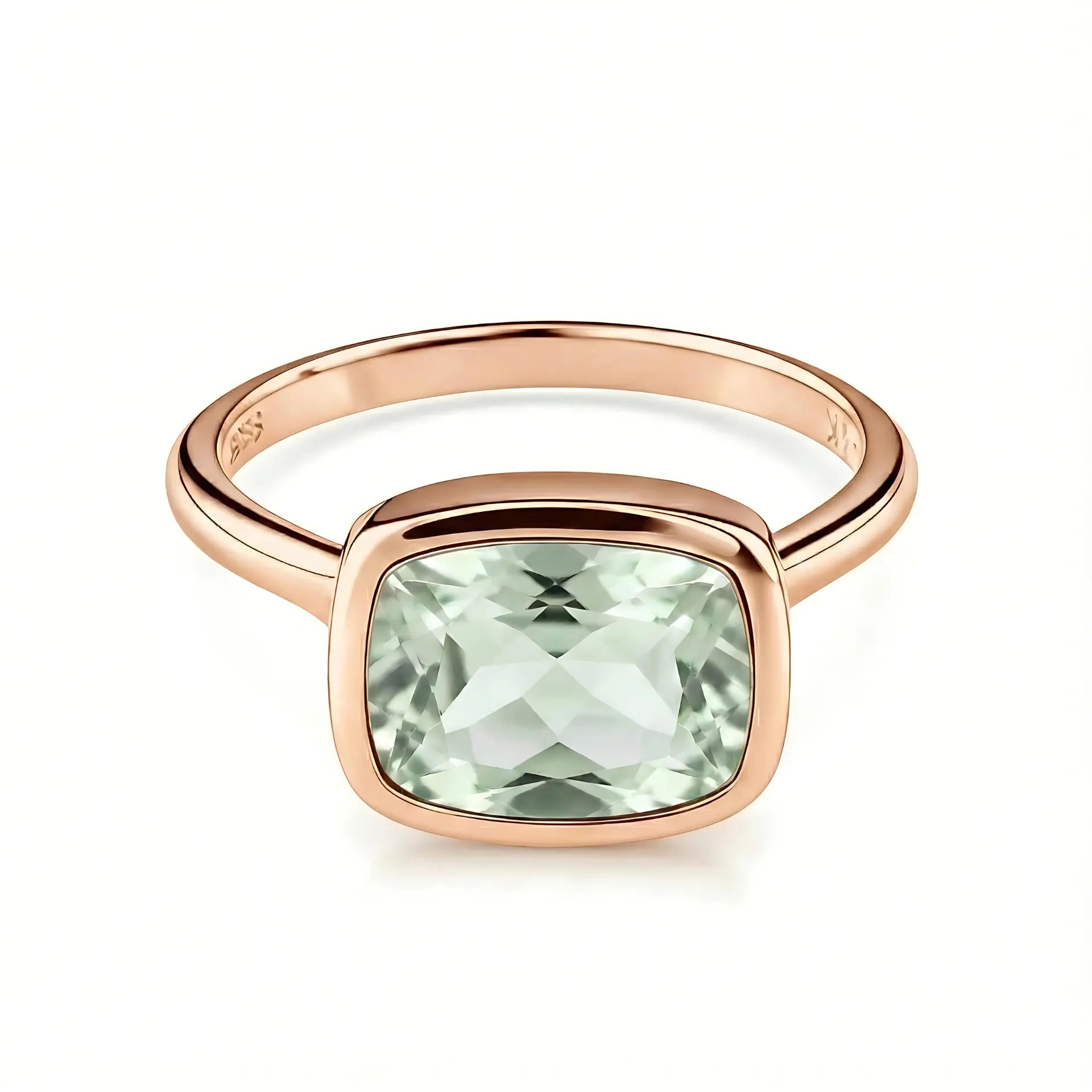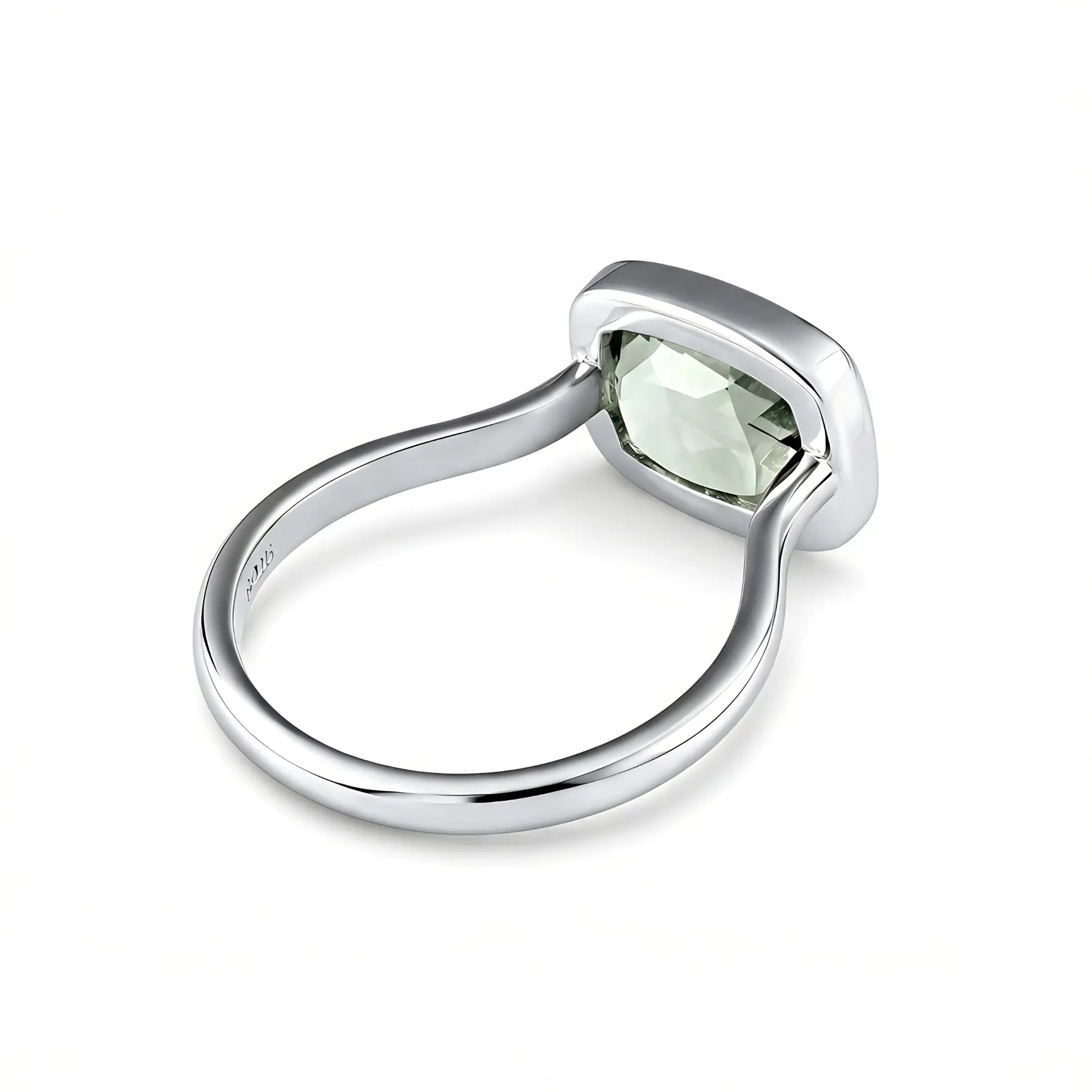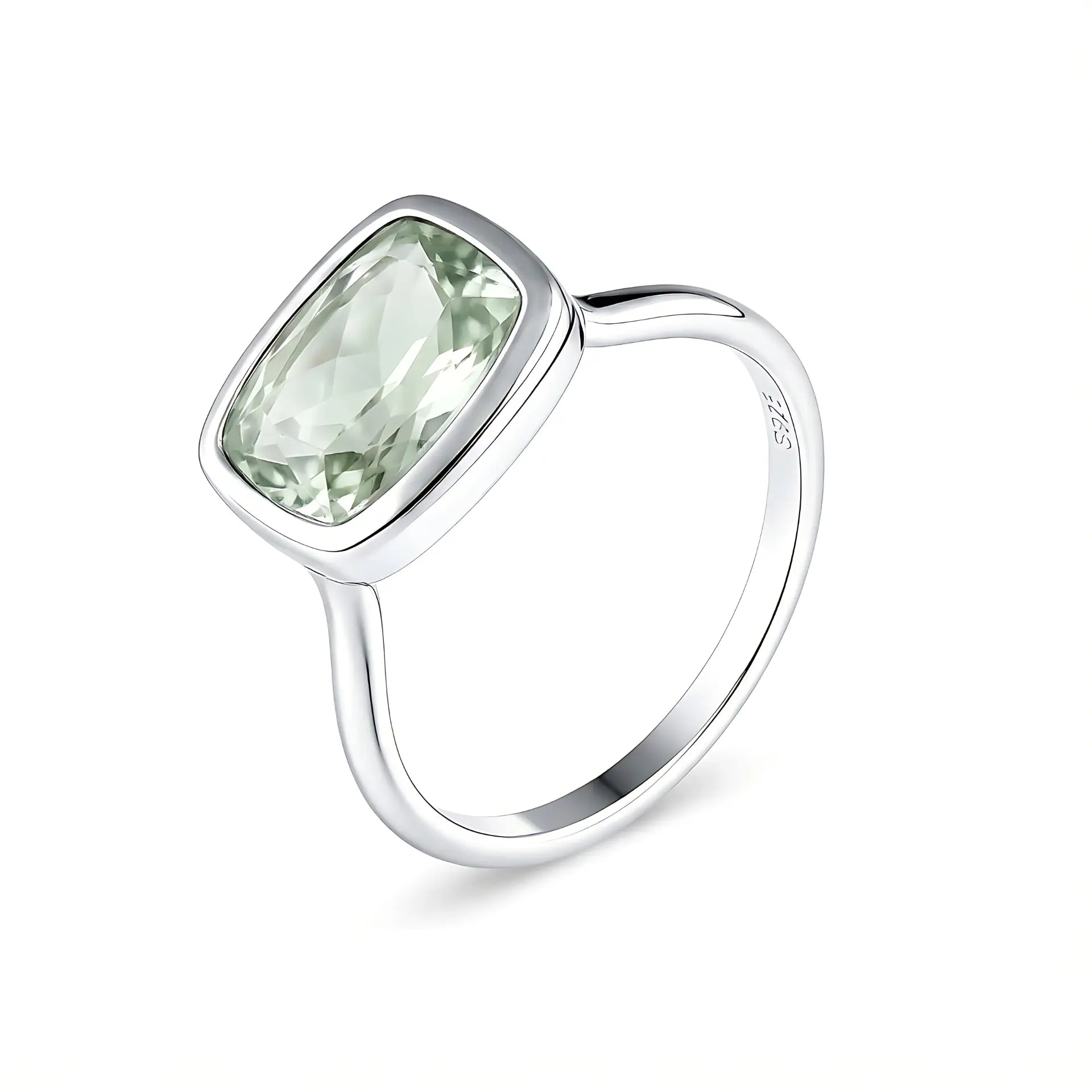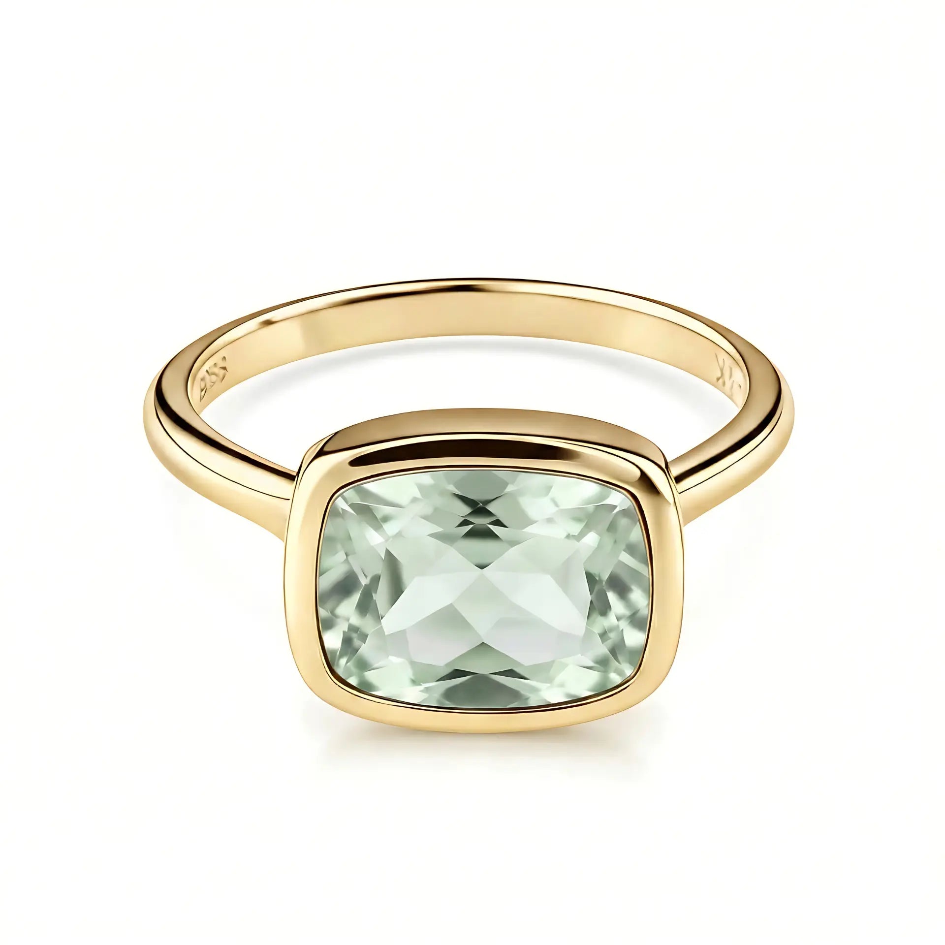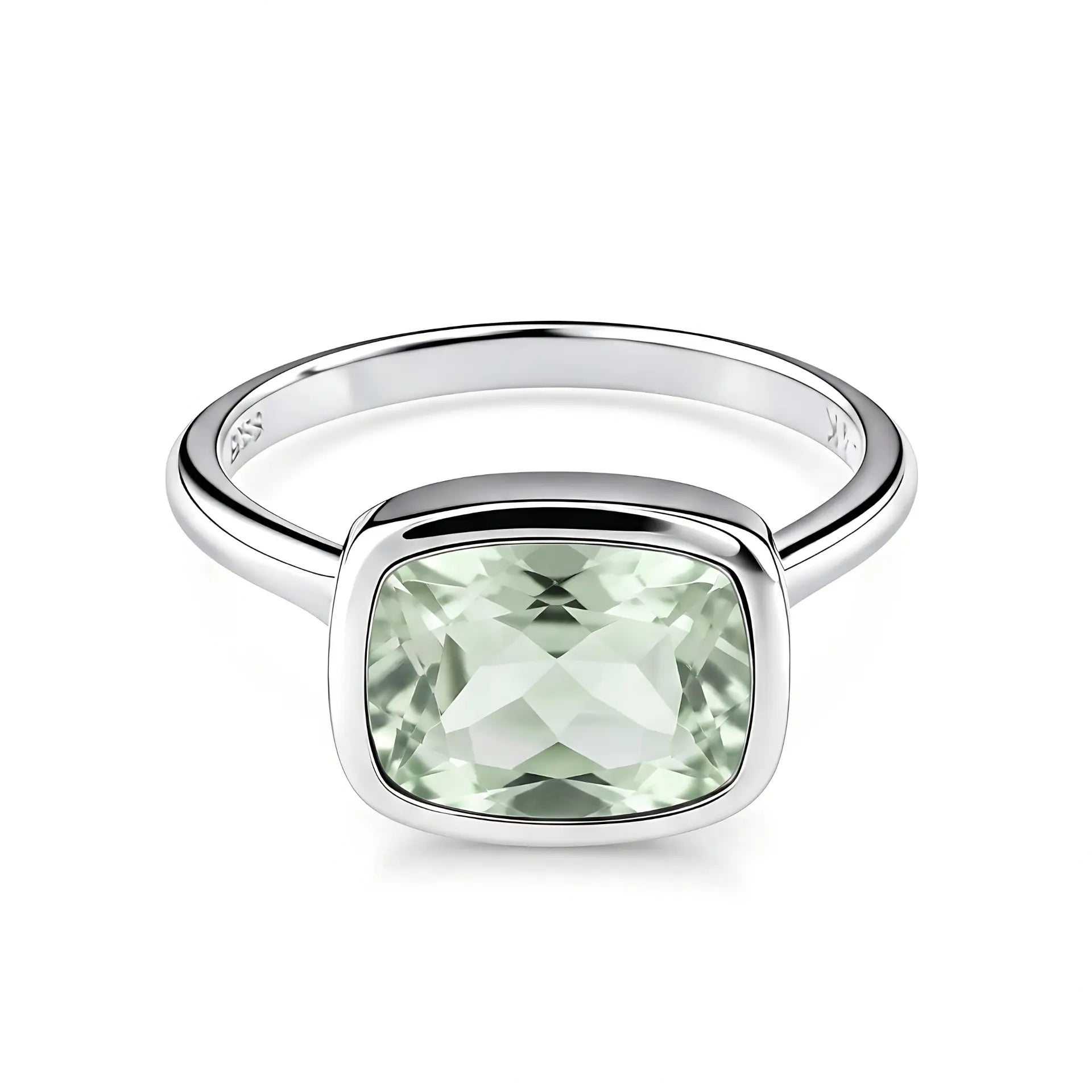 A soft touch of pale green settles on your finger, which brings your heart back into rhythm. The cushion-shaped green amethyst glows gently within its bezel setting and quietly smooths the tension inside you. This ring carries a sense of harmony that belongs only to you. Let it stay with you and guide your life back to a comfortable frequency.