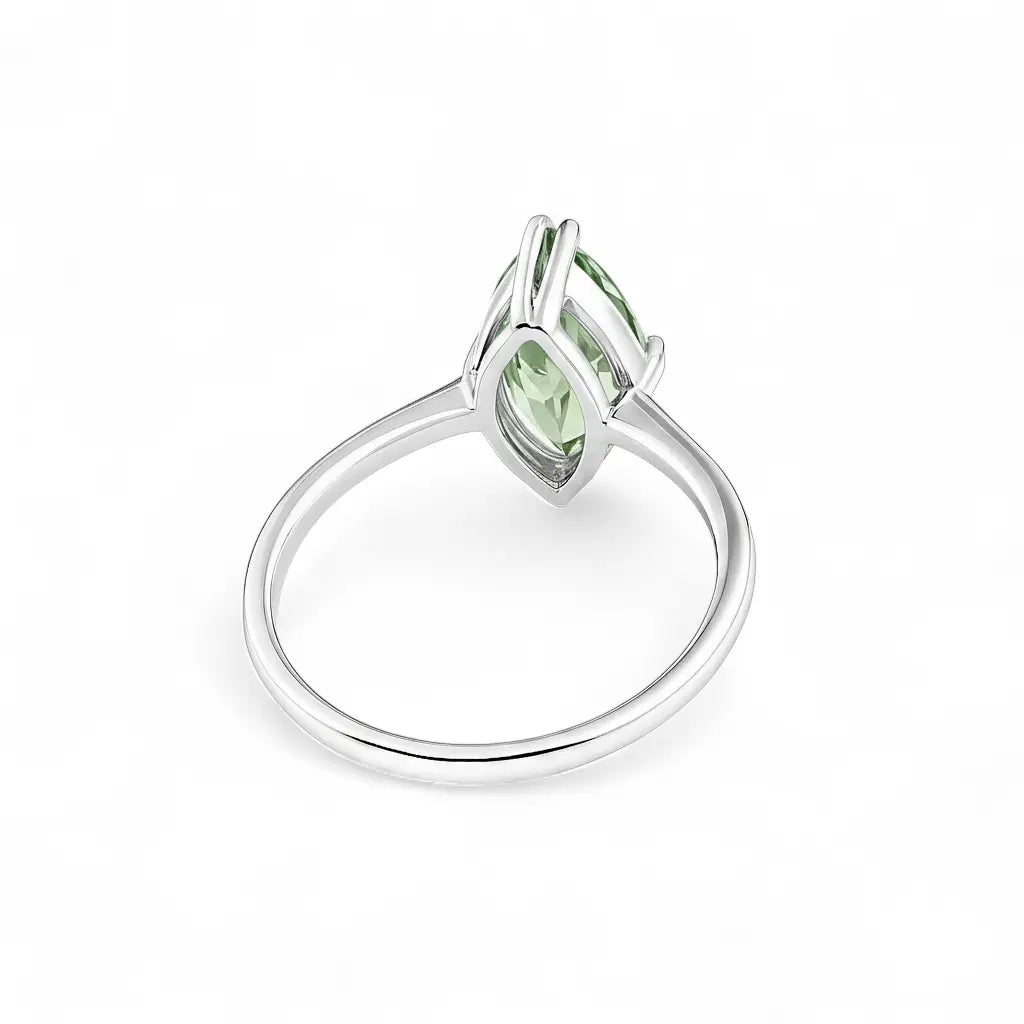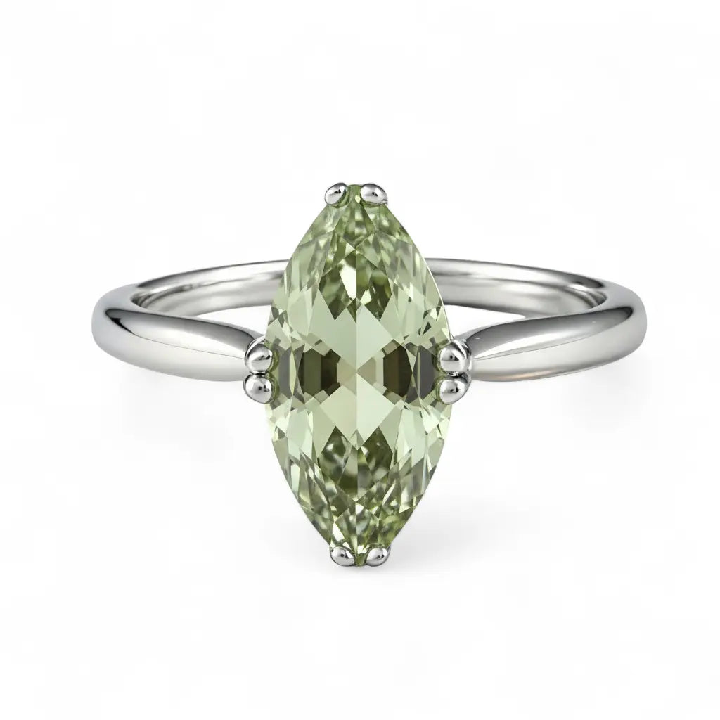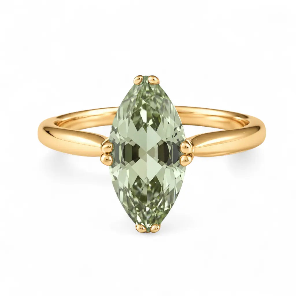 To radiate a soft, light green glow, this marquise-cut green amethyst ring brings you calm and grace. Feels like a gentle spring breeze that caresses the heart. This ring, in its play of light and shadow, embodies inner tenderness and strength. Its slender silhouette and refined lines highlight a simple, timeless charm. Worn alone or shared with a loved one, it whispers from the heart, expressing harmony and peace.