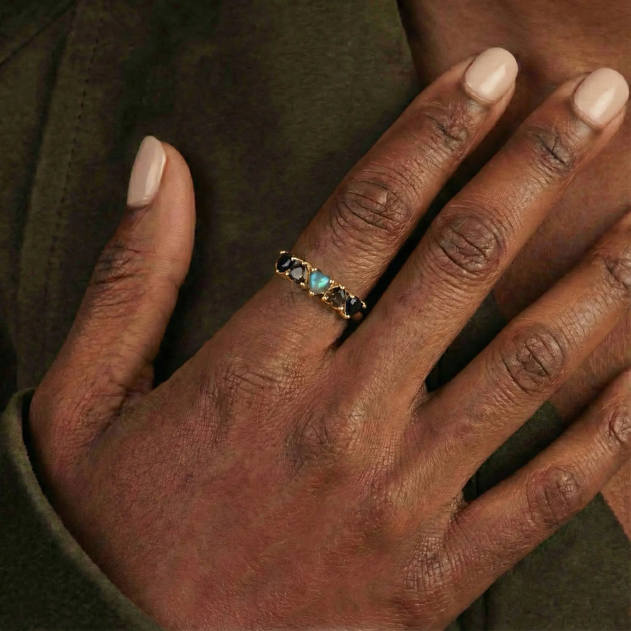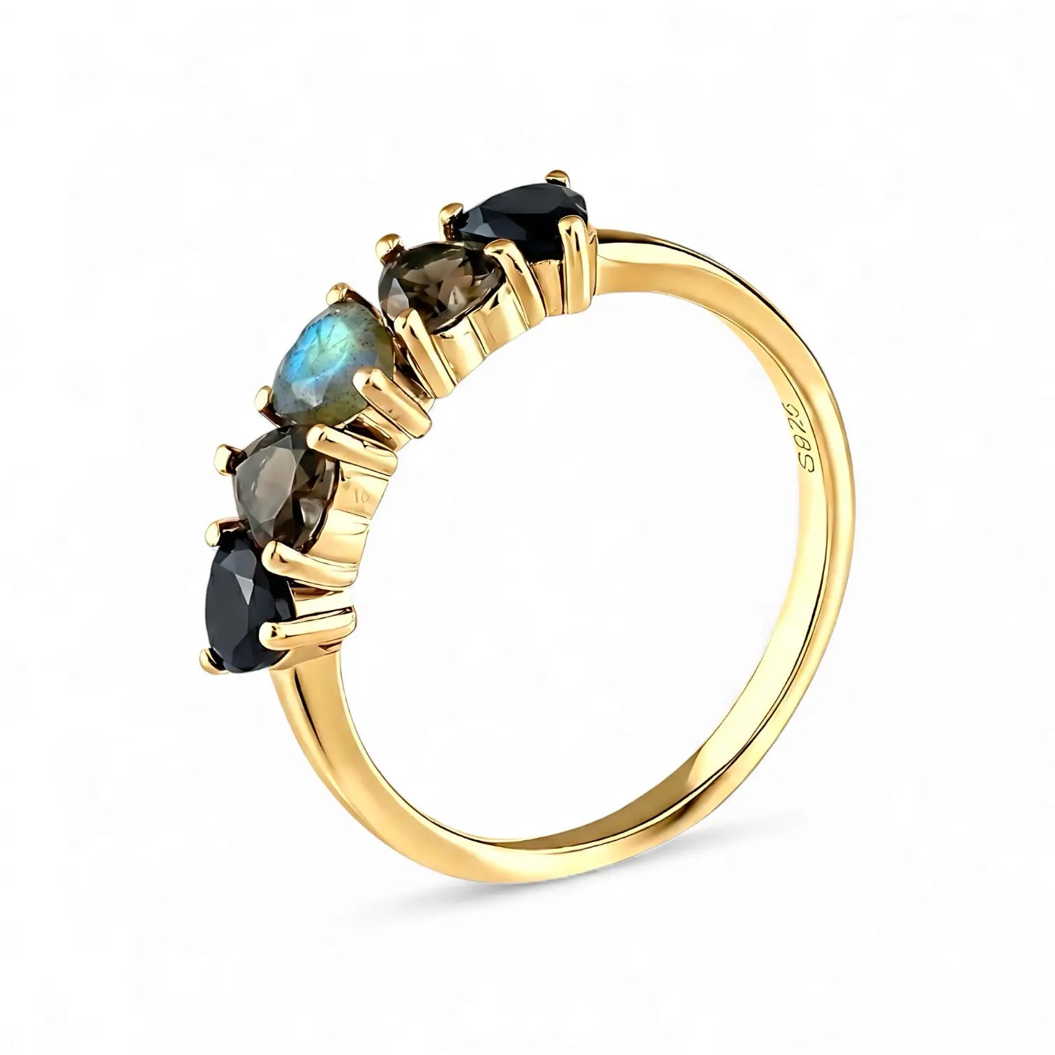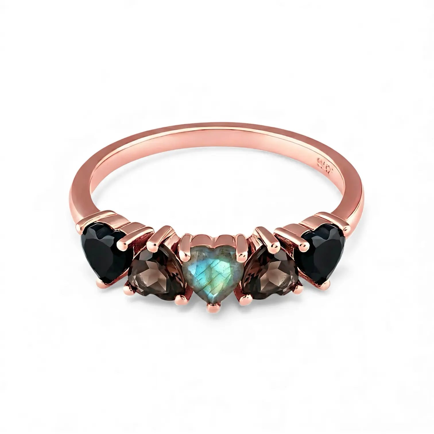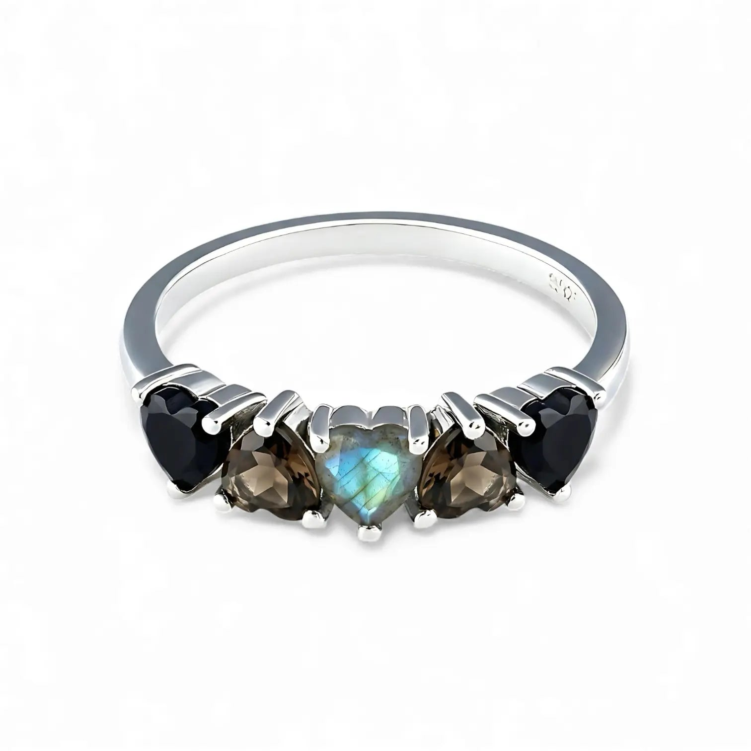 Like wrapping midnight stillness with a hint of aurora around your finger, this ring flows with a smooth band that links five heart shape stones. Grounded black onyx and misty smoky quartz rise gently toward labradorite’s shifting green glow. The deep to light rhythm feels less like color, more like a quiet breath, holding unspoken softness and steady strength in changing light.