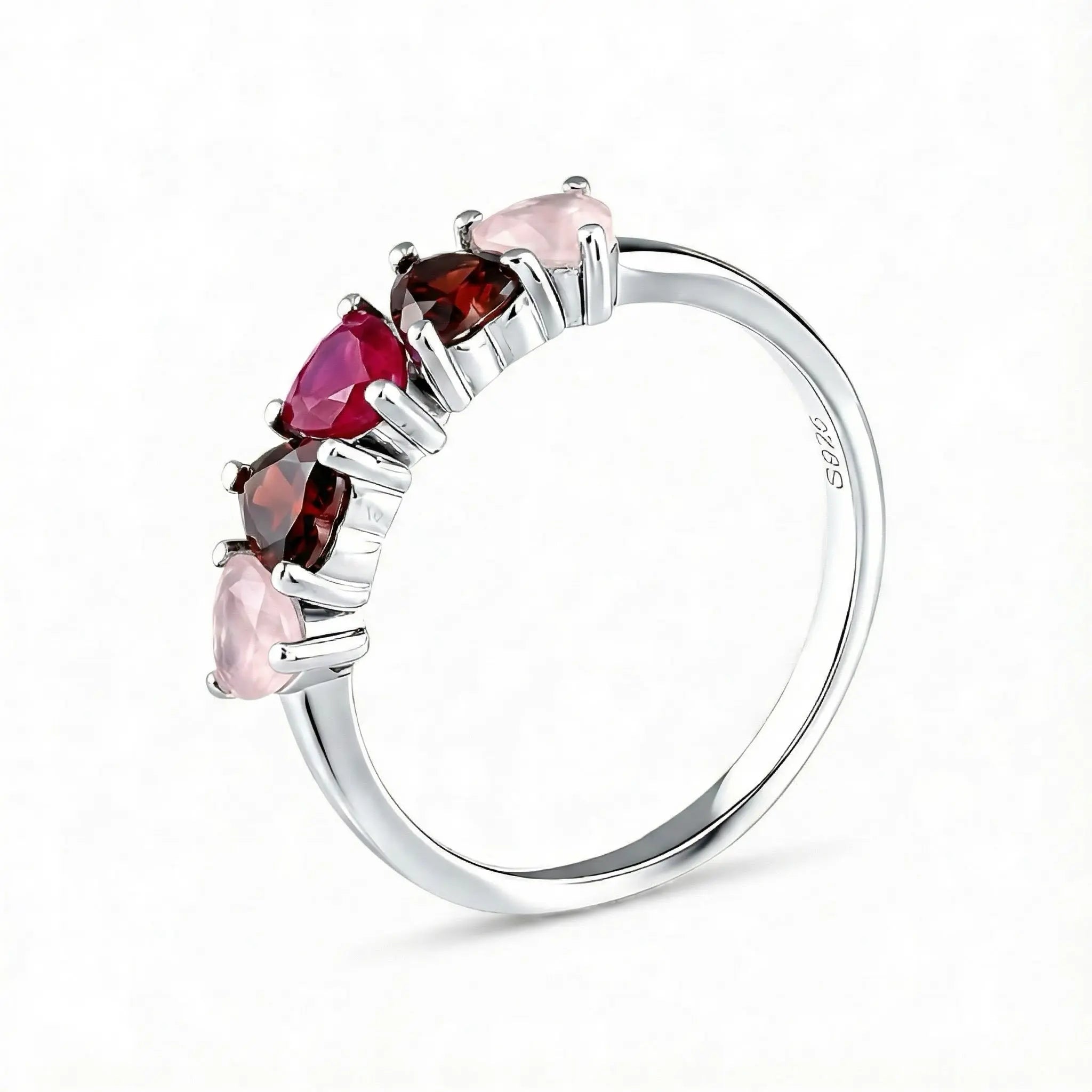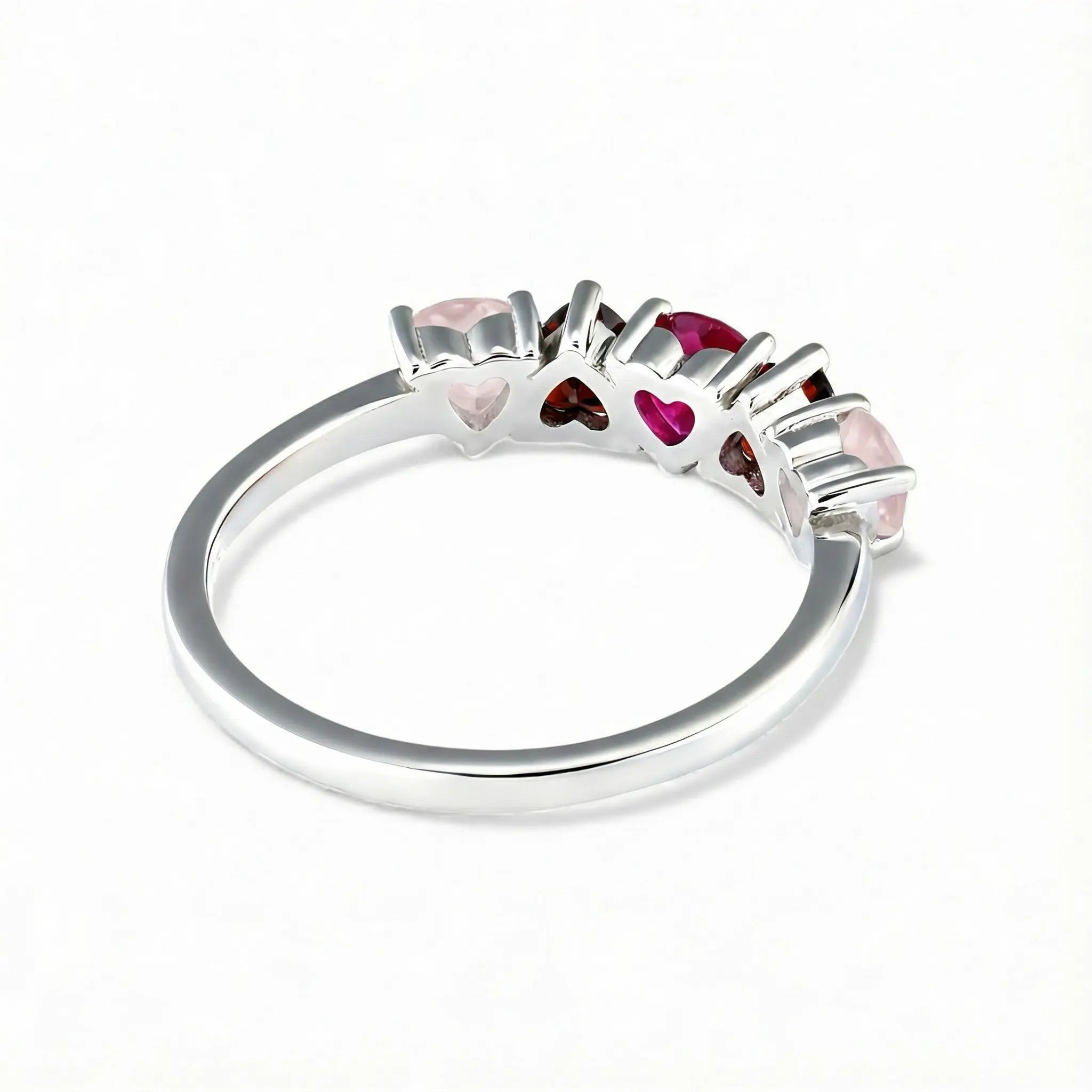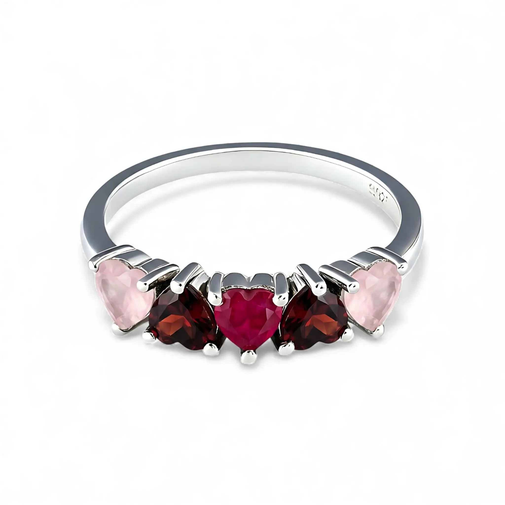 A quiet heartbeat rests on your finger as five heart shaped stones sweep along a silver band. Soft rose quartz fades into warm garnet and gathers in a vivid ruby at the center. This gentle gradient traces a path from self-kindness to rising passion, settling into a bright sense of vitality with every lift of your hand.