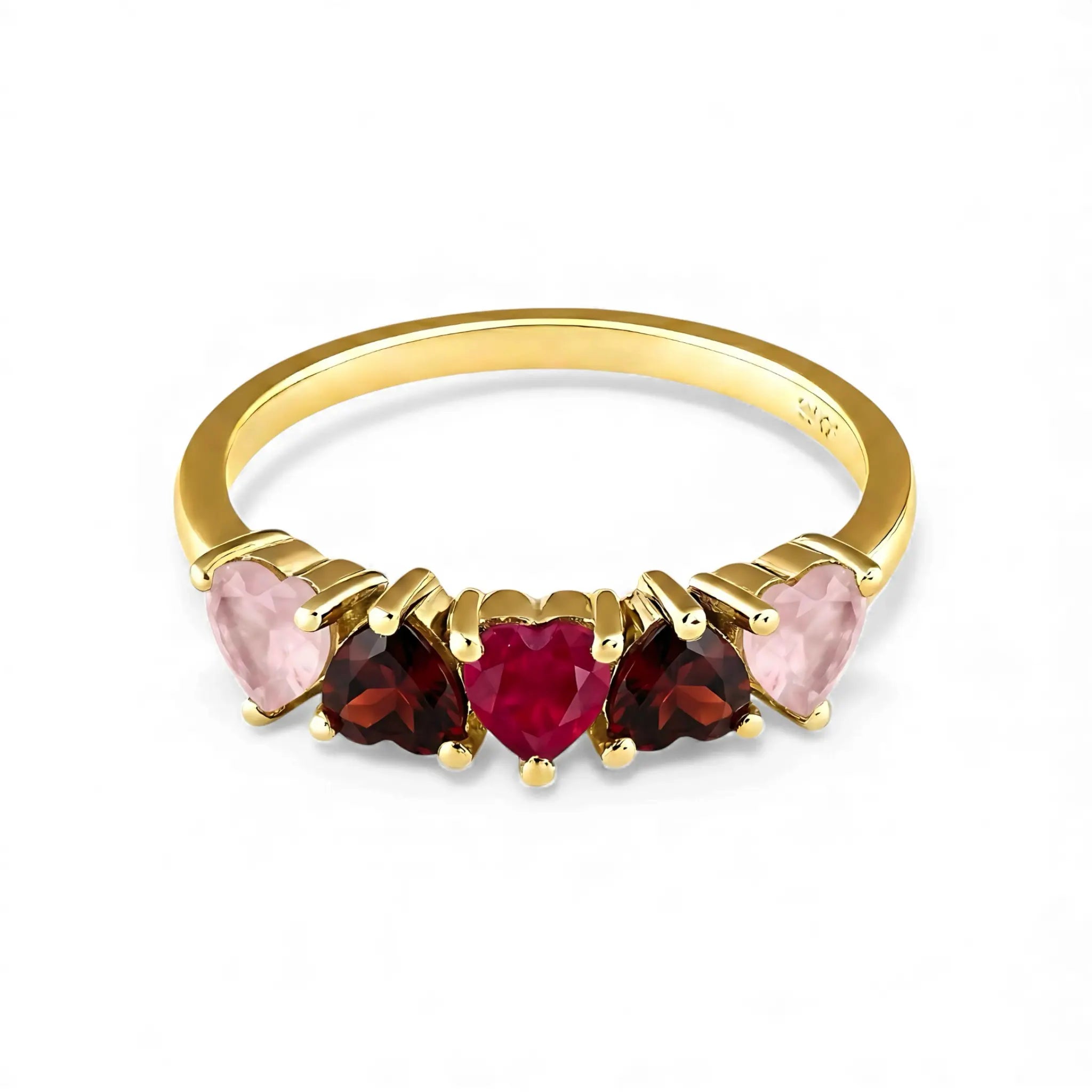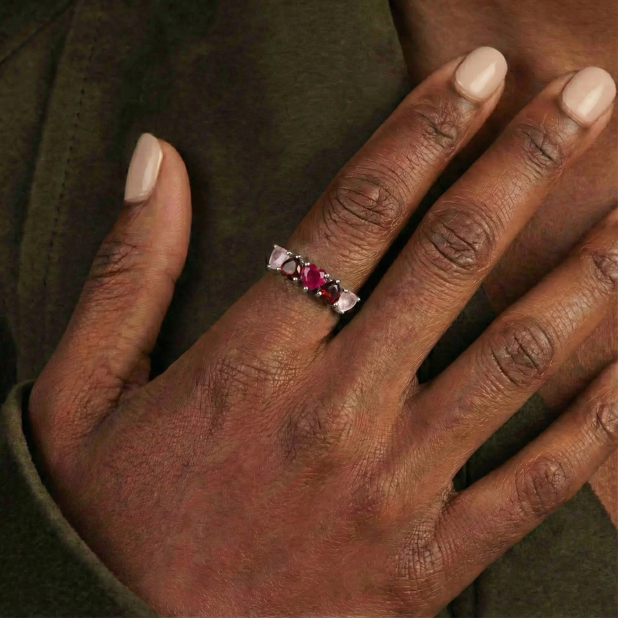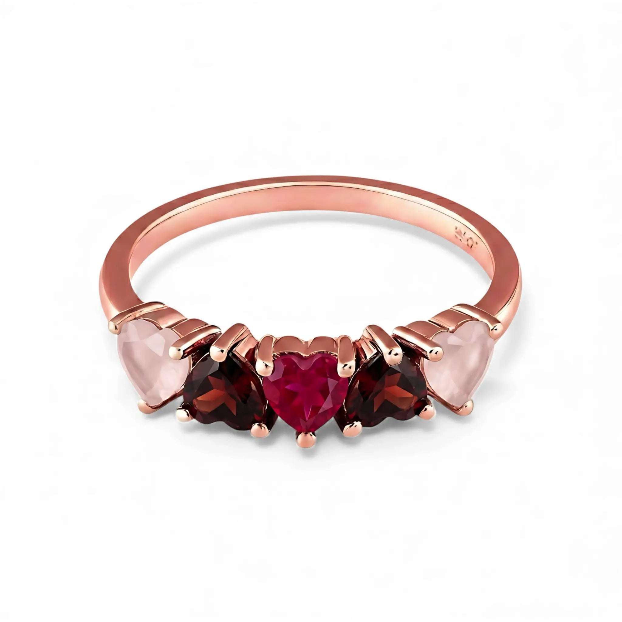 A quiet heartbeat rests on your finger as five heart shaped stones sweep along a silver band. Soft rose quartz fades into warm garnet and gathers in a vivid ruby at the center. This gentle gradient traces a path from self-kindness to rising passion, settling into a bright sense of vitality with every lift of your hand.