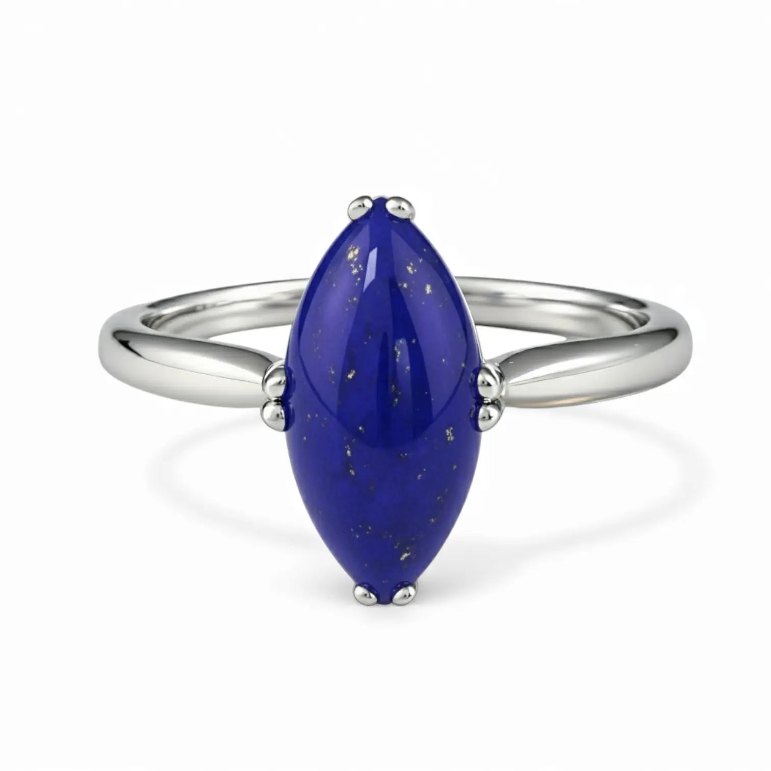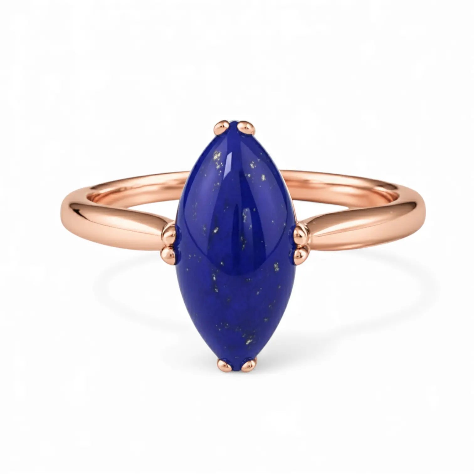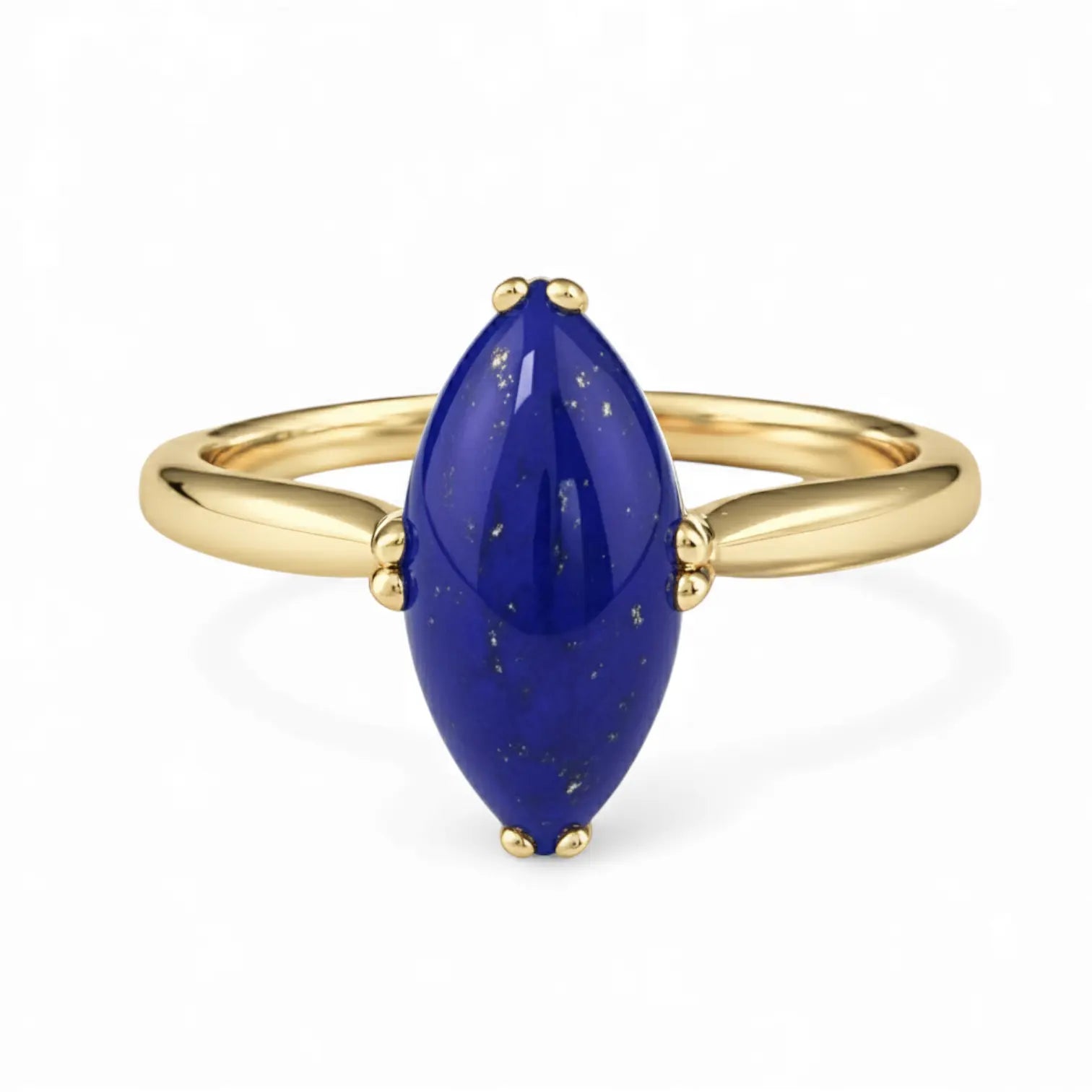 Our Lapis Lazuli Marquise Ring glows in deep blue. Delicate golden lines shimmer across its surface, like stars on a quiet night. Lapis lazuli carries the calm of wisdom and the light of insight, guiding the mind to clarity and the heart to peace. With its clean band and refined stone, it suits any occasion and carries an easy sense of confidence.