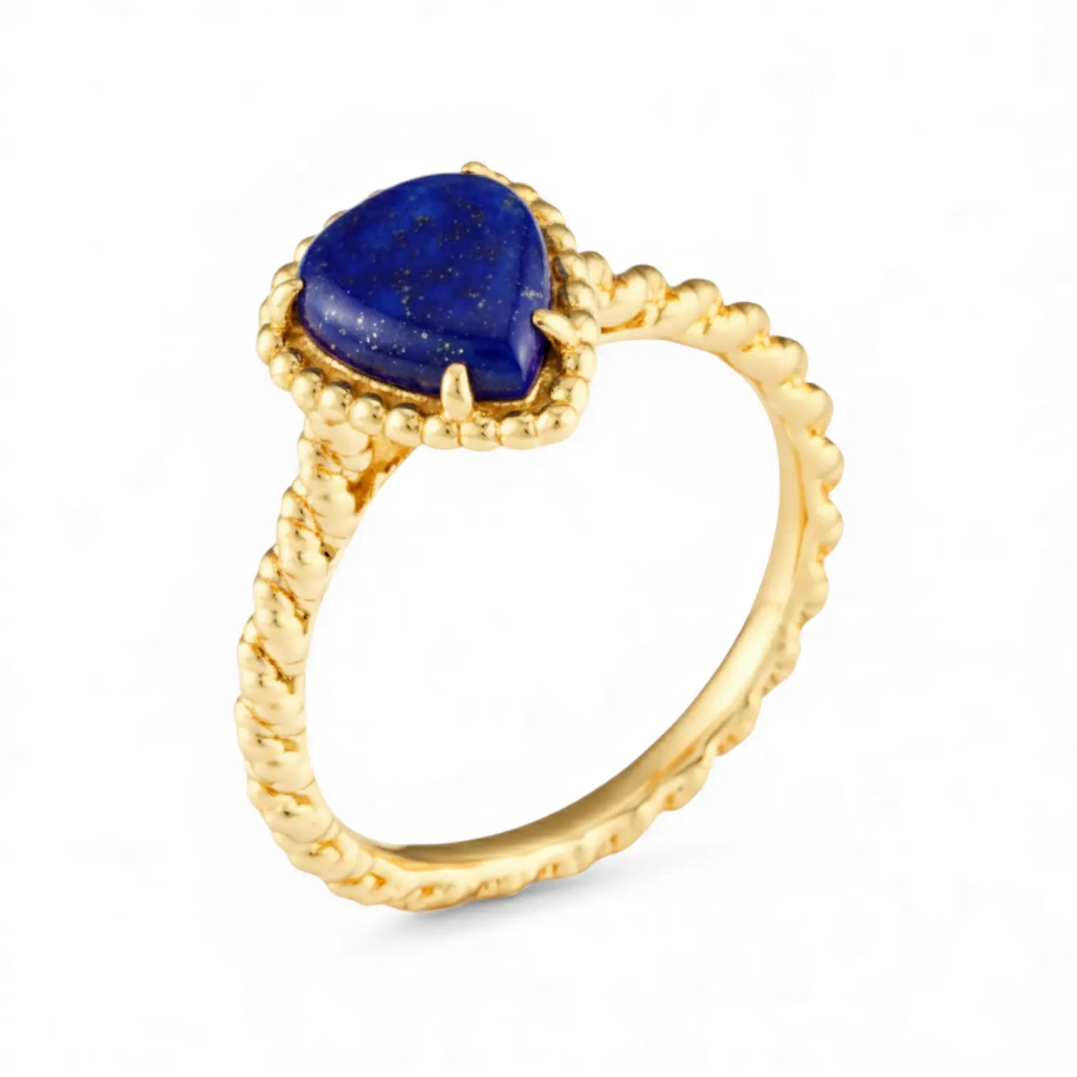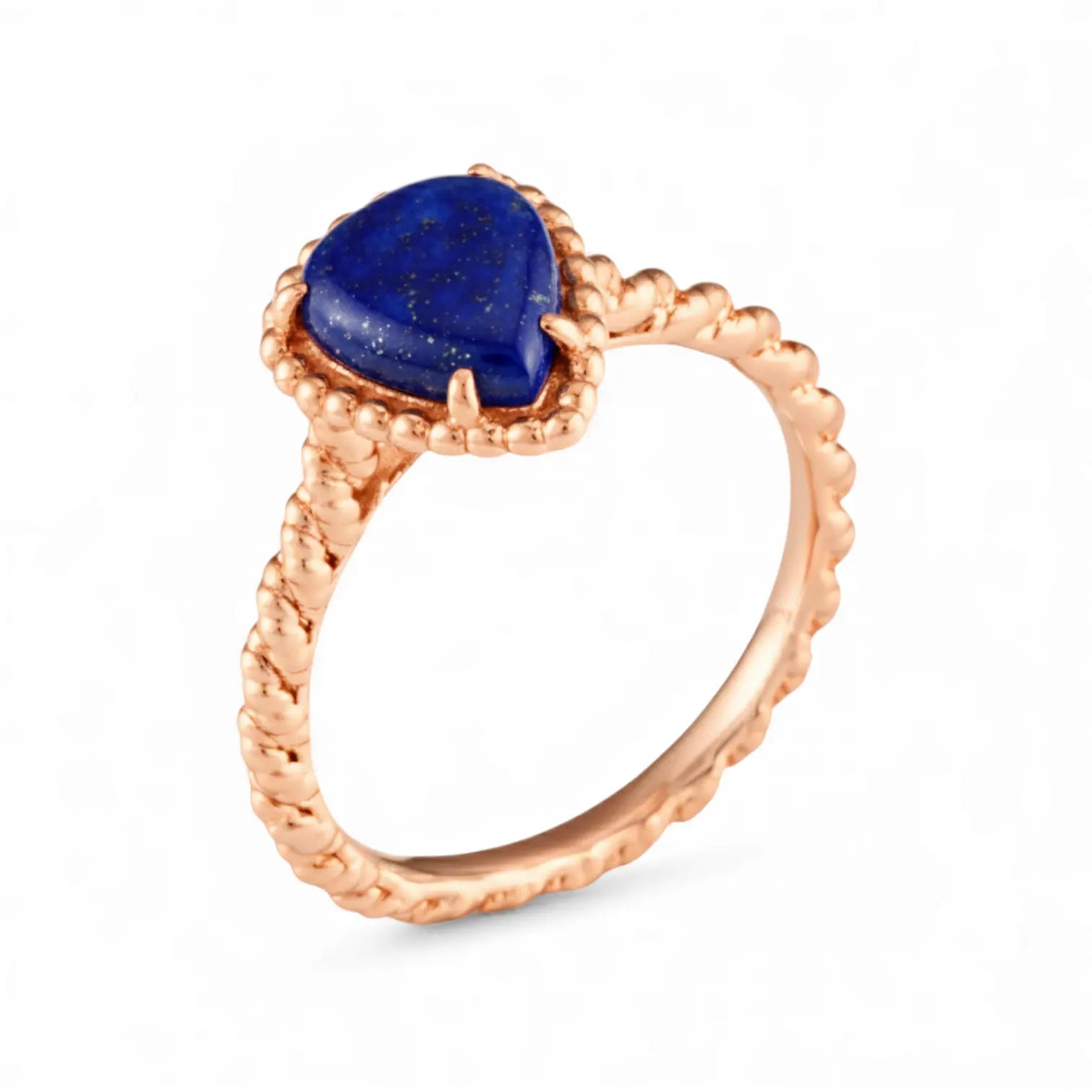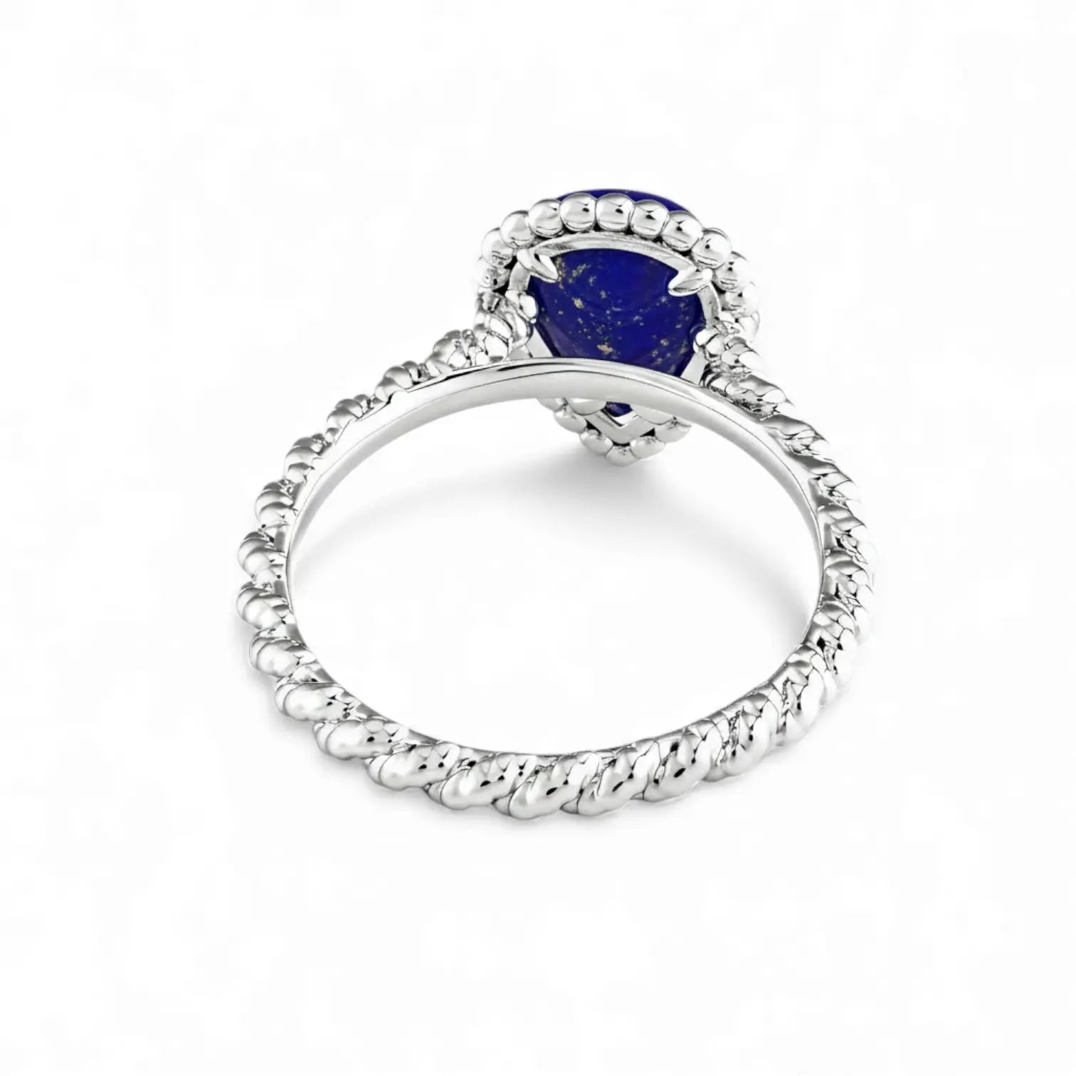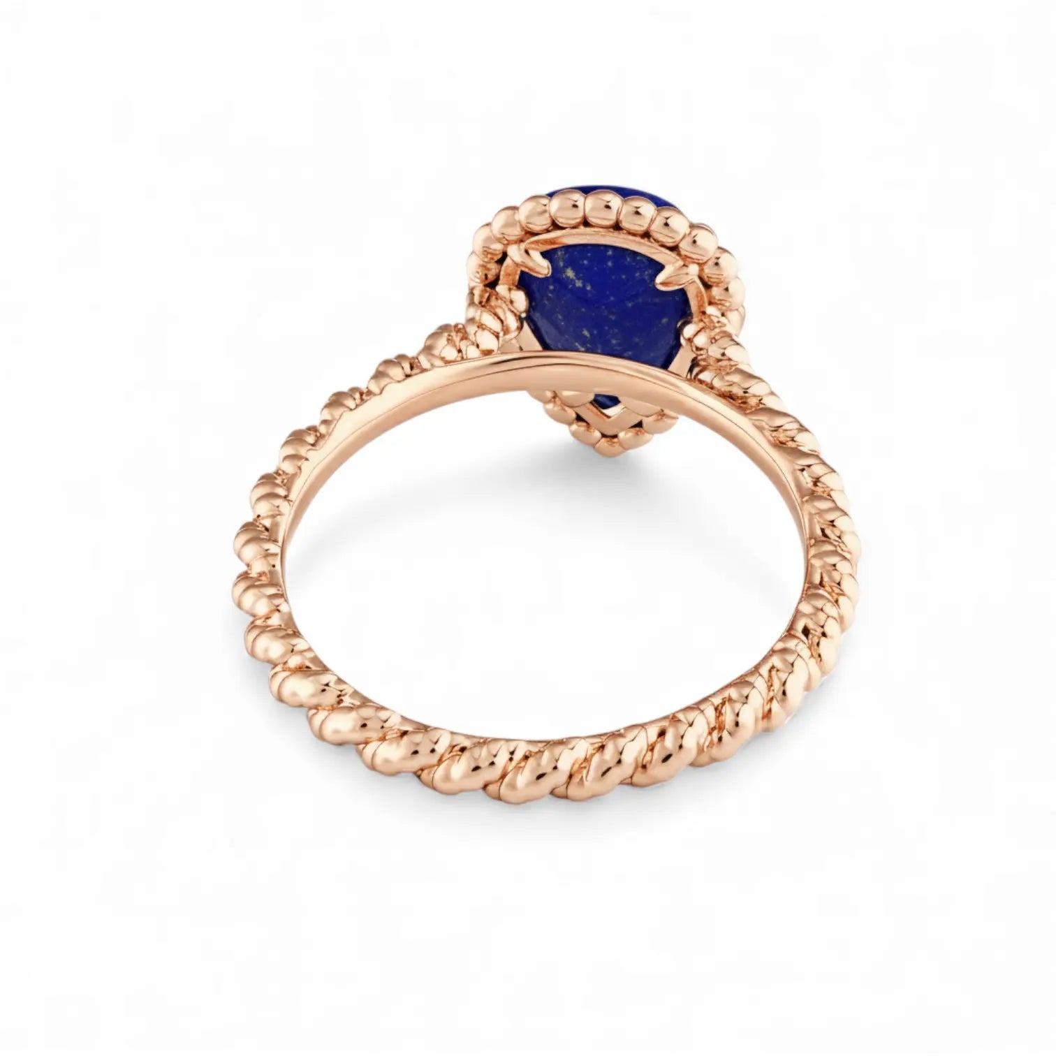 The deep blue lapis lazuli has an almost inky depth, and light creates sharp refractions across its pear-cut facets. The twisted band adds a softer rhythm to the composition.