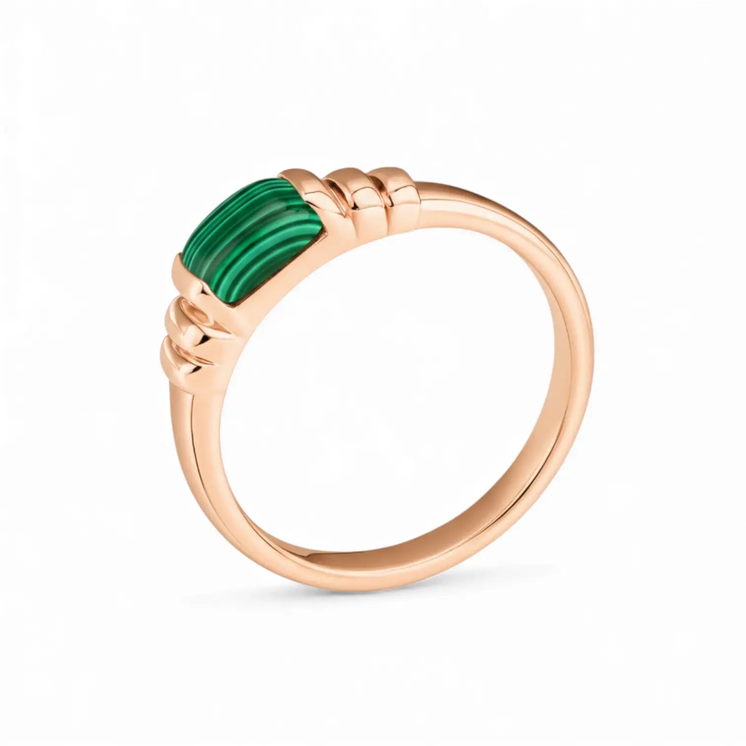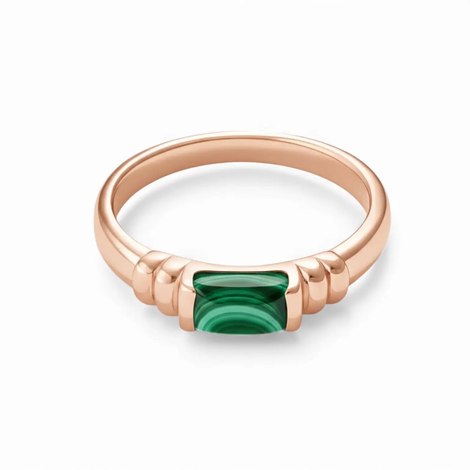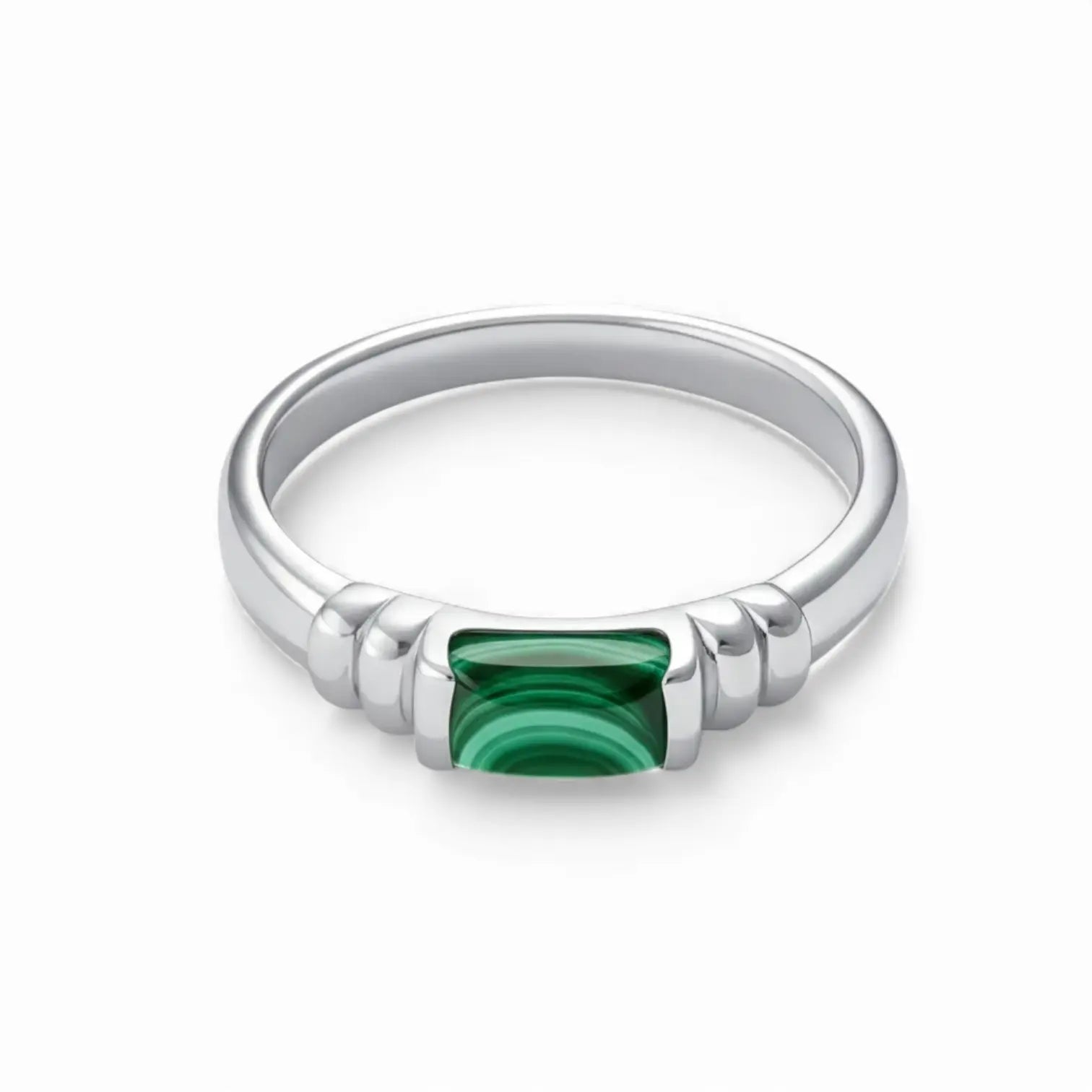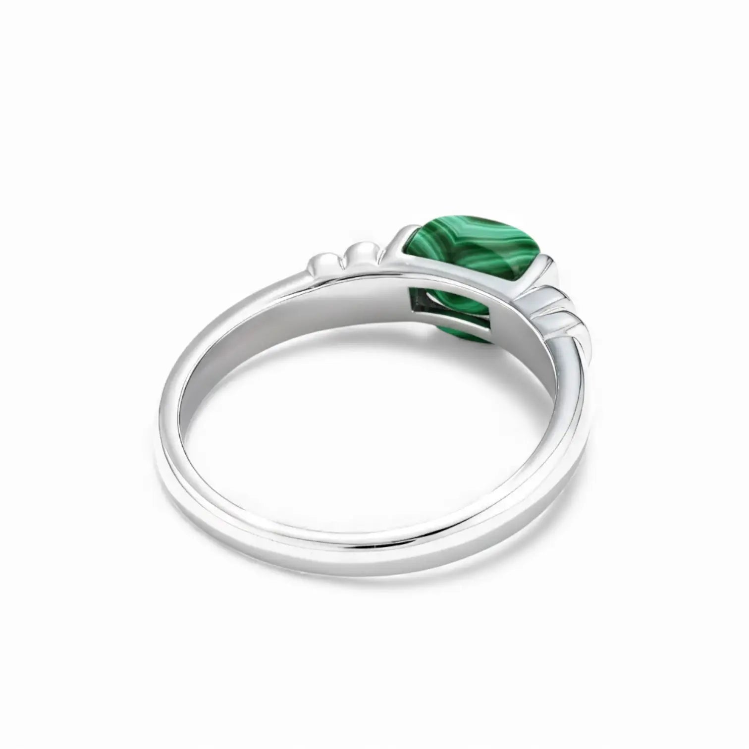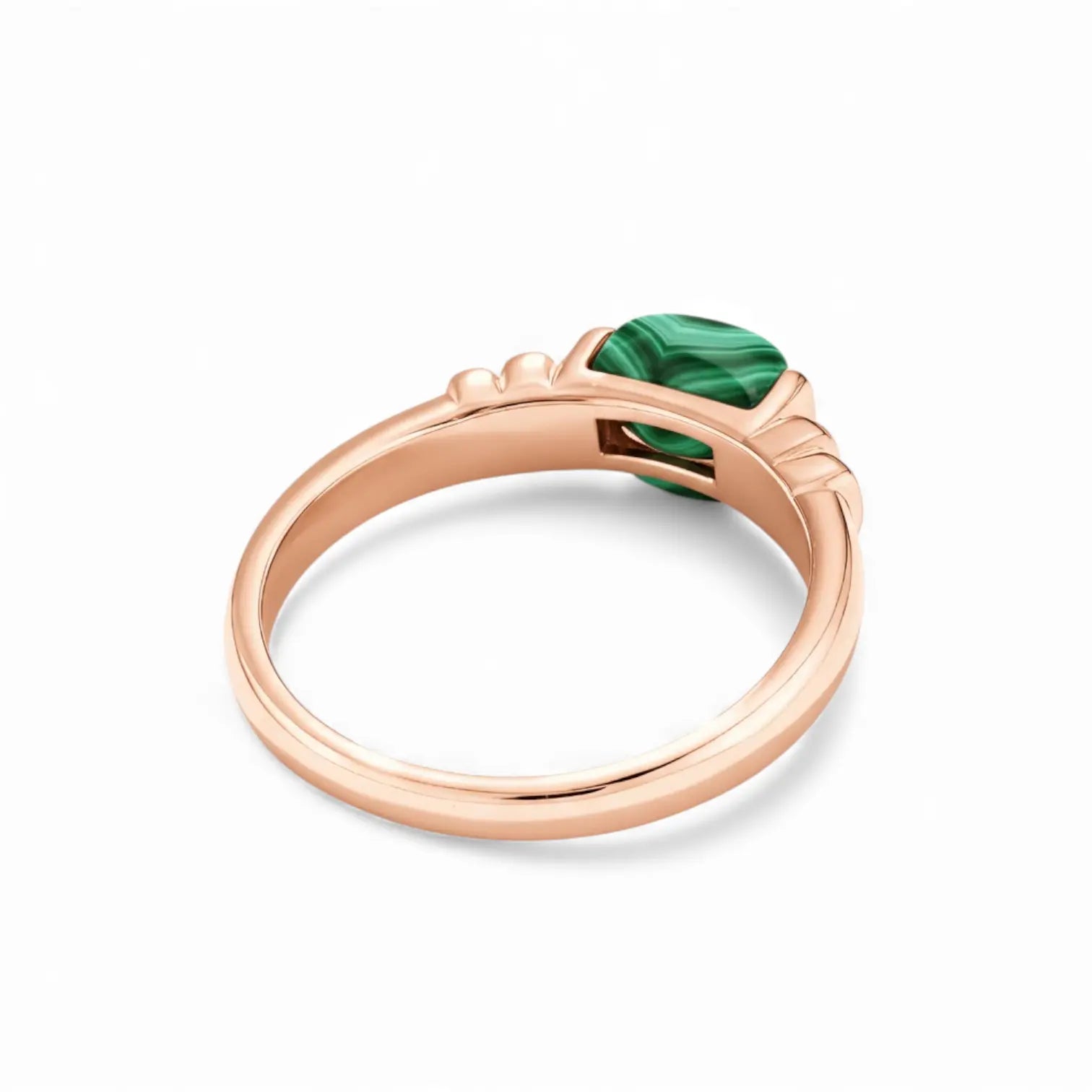 The deep green malachite rests quietly at the center of the ring, its layered patterns like a slow, moving landscape, calm yet full of strength. The ring feels steady and smooth, with clean lines that offer a sense of grounding. Malachite is a stone of protection, giving the heart clarity and a quiet courage not easily shaken.
