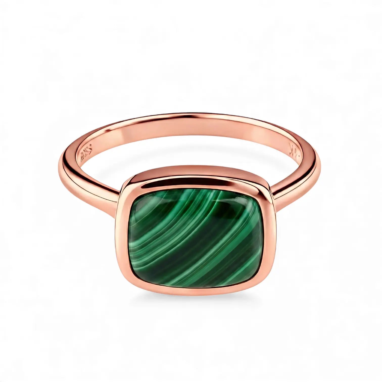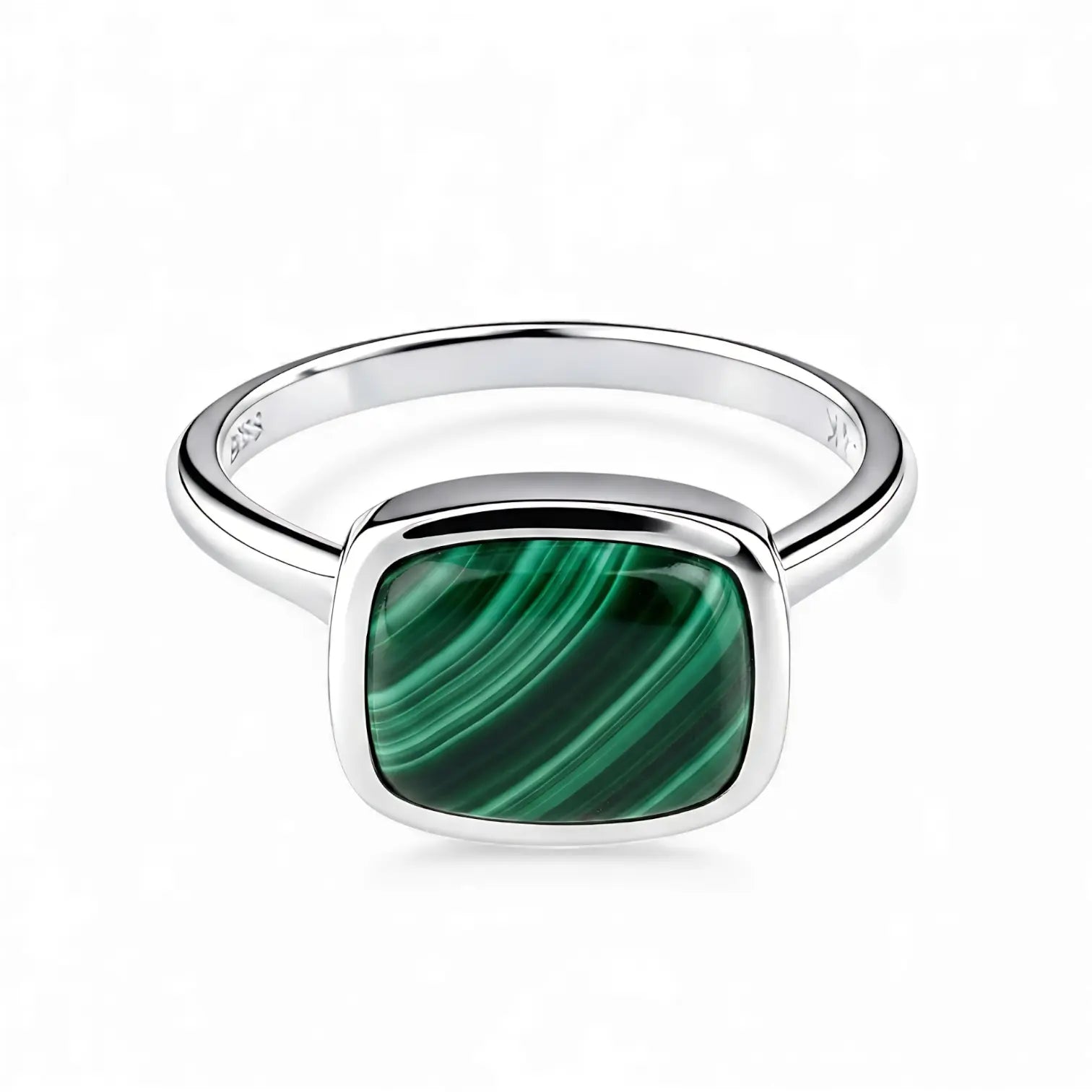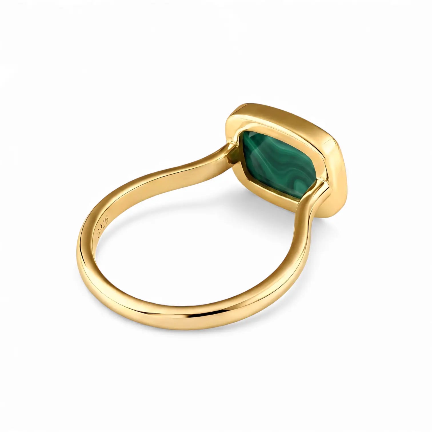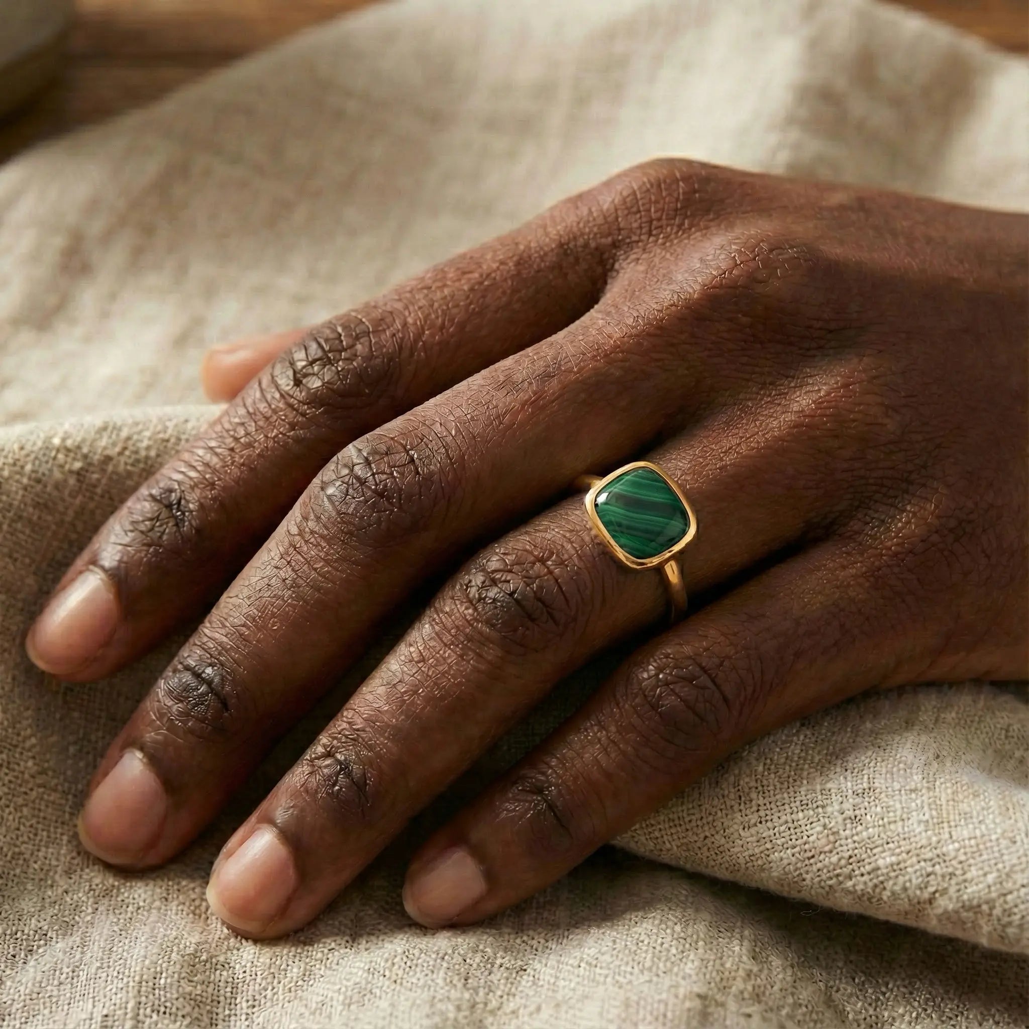 Please take a look at this malachite ring from our Pure Hush collection. The cushion-shaped gemstone features swirling patterns of deep and dark green, securely held within a bezel-set band. It's your protective armor, shielding you from negative energy. Wear this protective power with you, and move forward with courage.