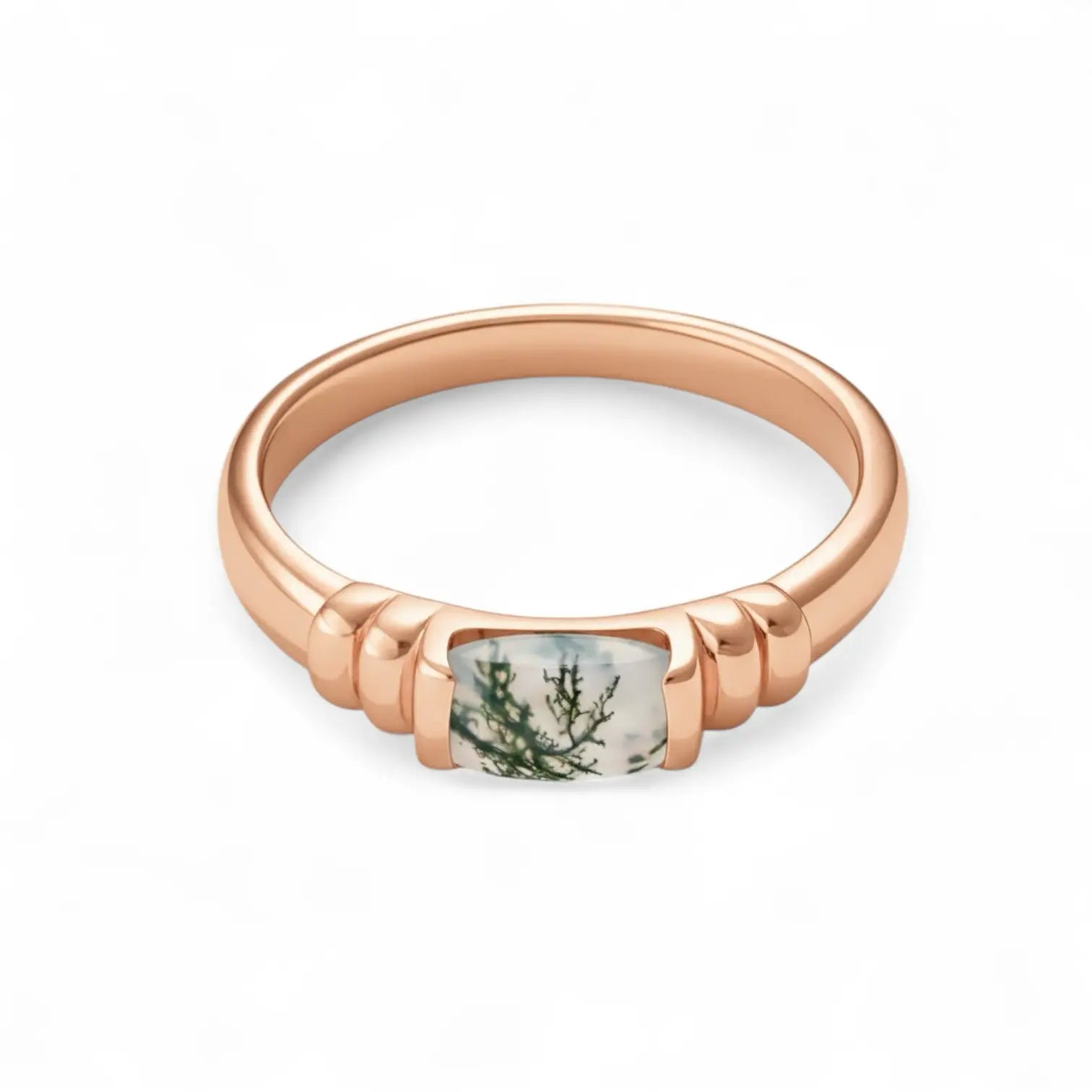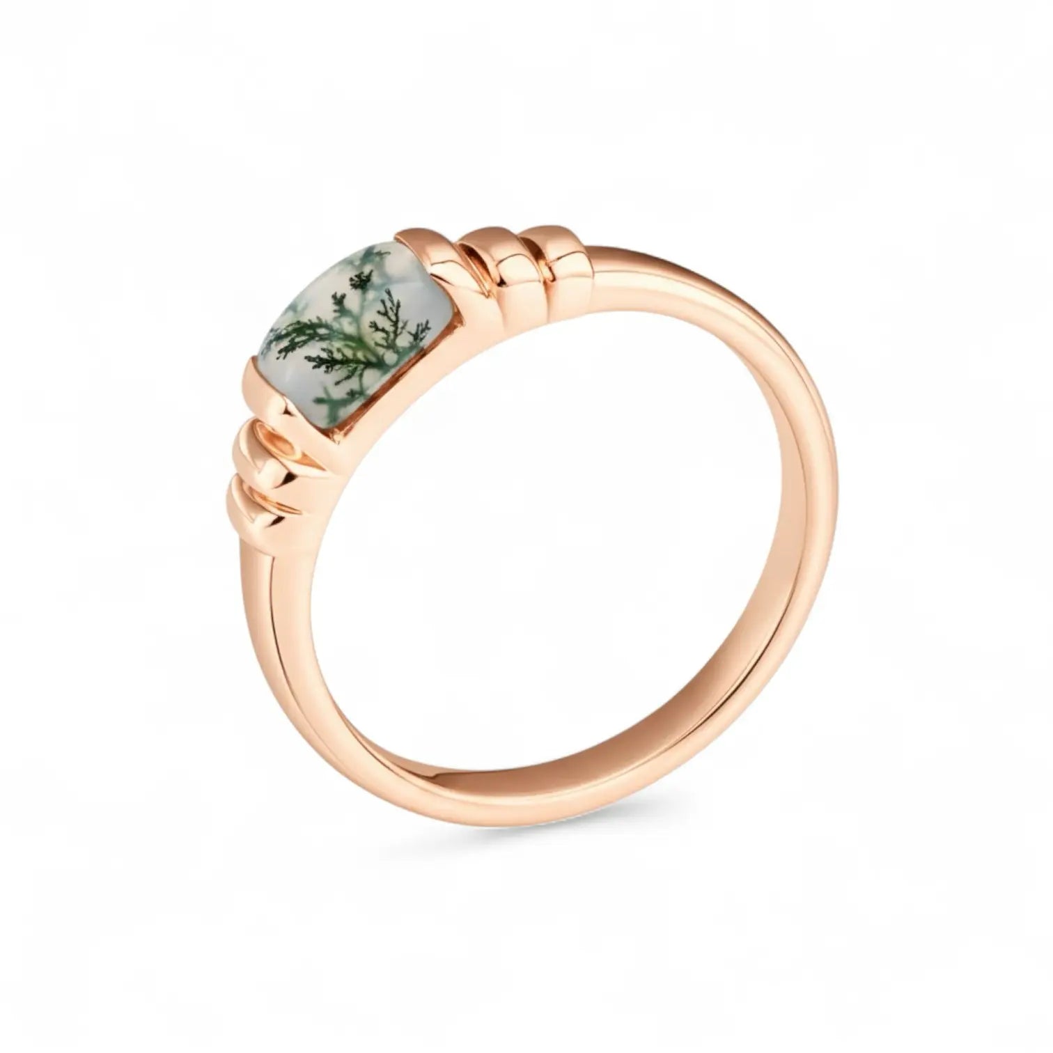 Feel the vitality of this moss agate baguette ring. The clean geometric shape holds a soft, clear green, as if a touch of early spring rests on your hand. Within the crystal, moss-like patterns unfold gently, whispering the meaning of growth. The ring is more than jewelry; it offers steady courage and a fresh spark in everyday life.