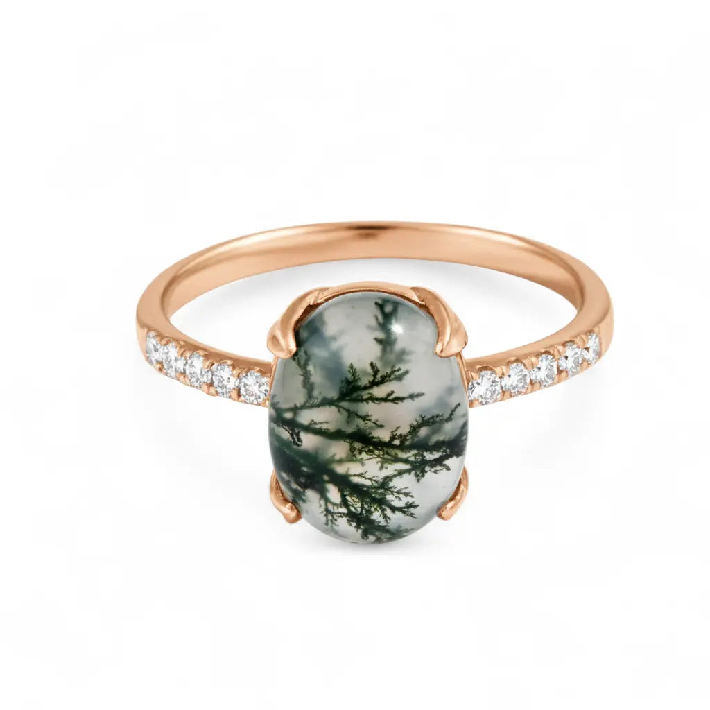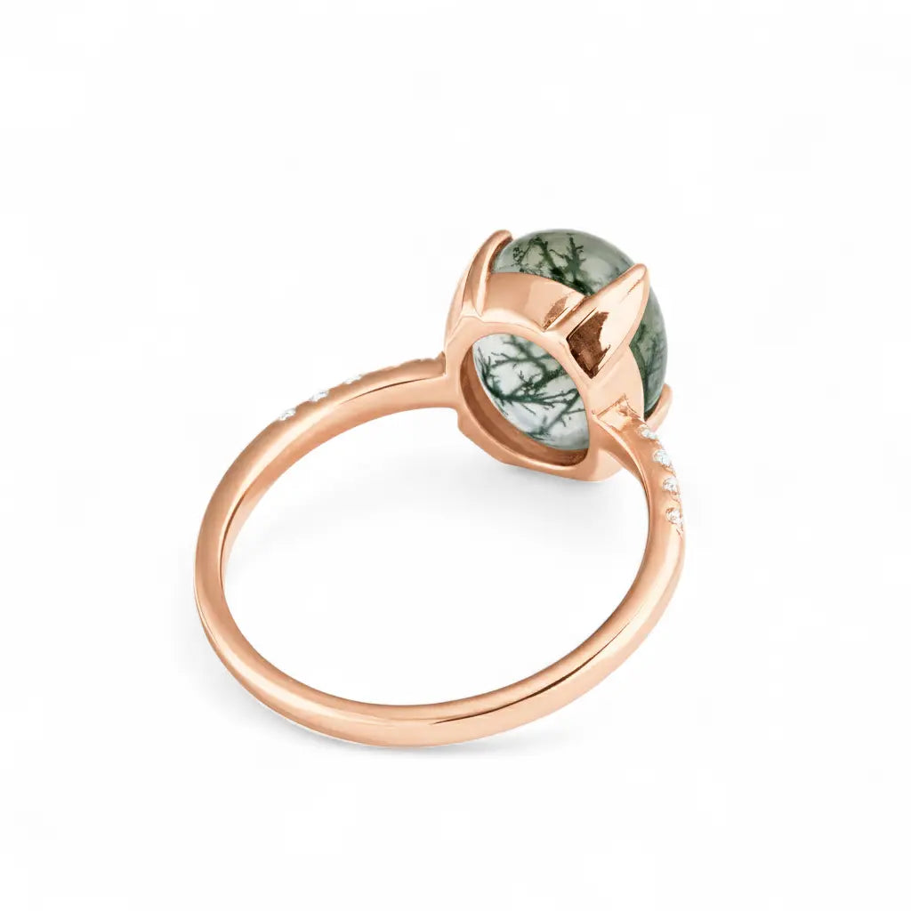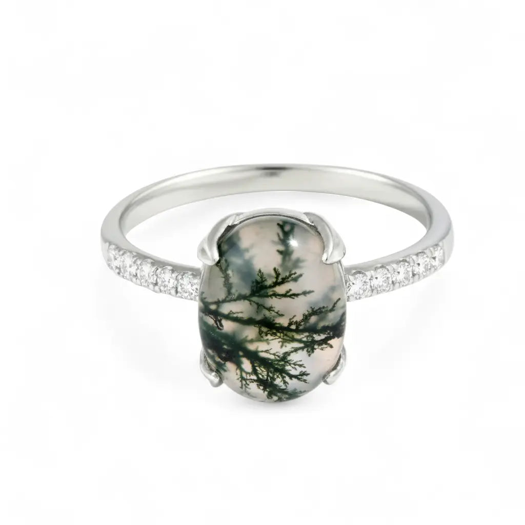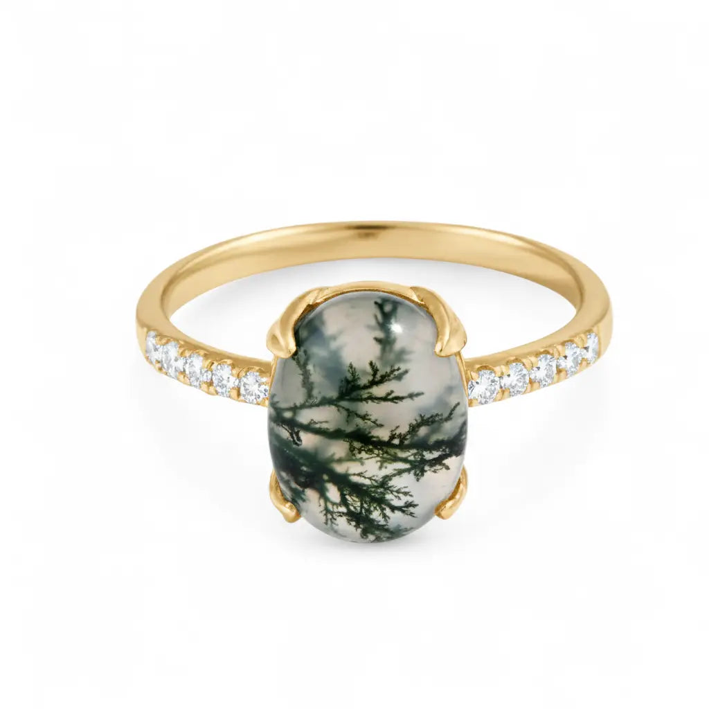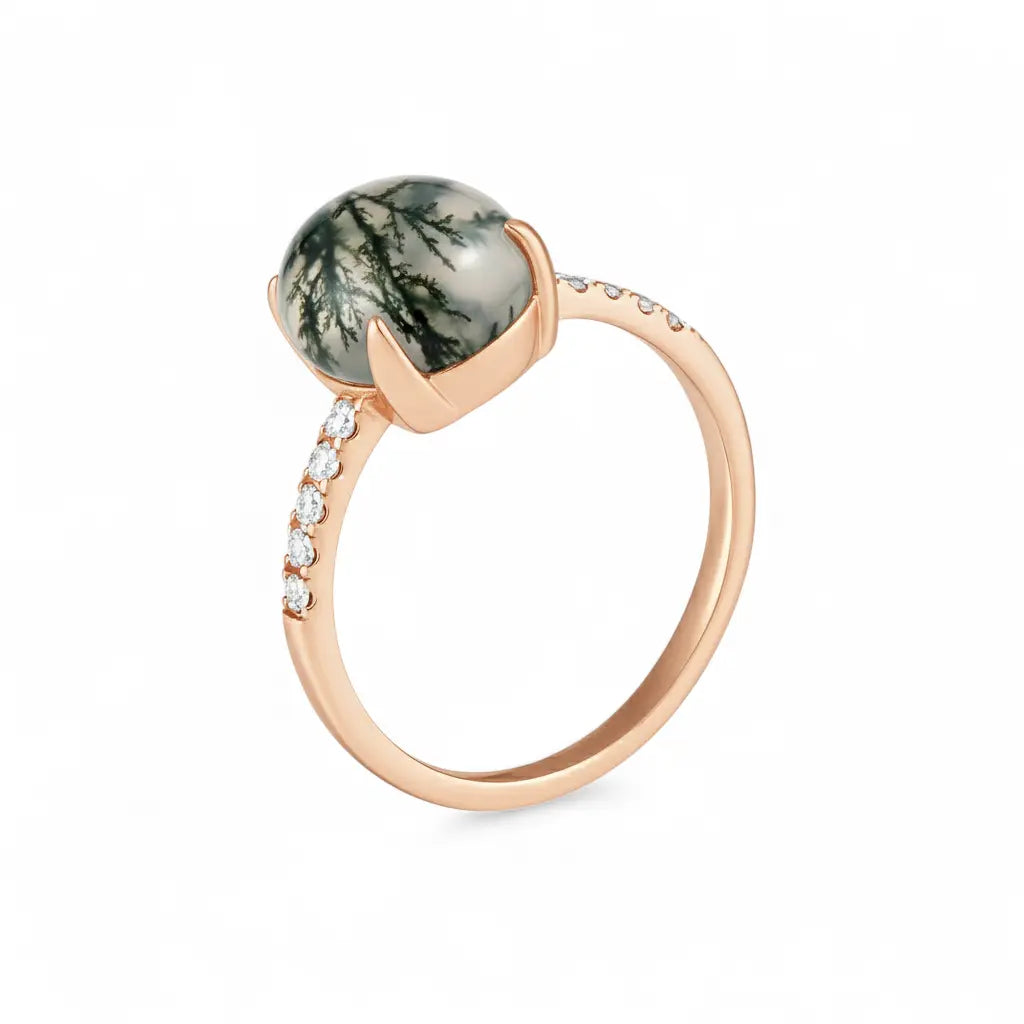 With the translucent green veins, this Moss Agate Cabochon Ring evokes the vitality of nature. In soft light, the texture of moss agate is like a forest nourished by spring rain. Its delicate band outlines soft lines. It evokes the energy of stability and growth. Each wear of this ring is a renewal of spirit.