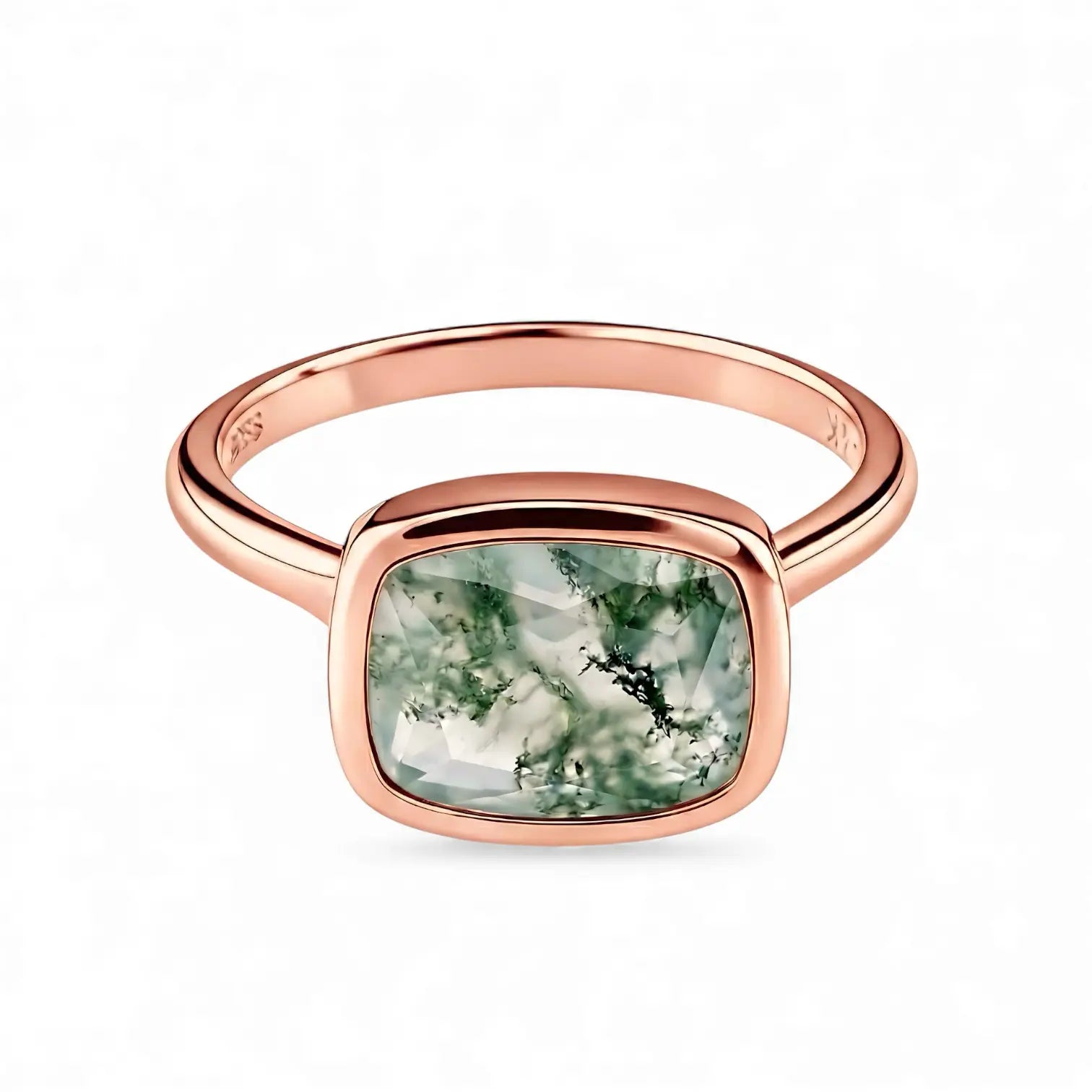 Gently place a small patch of real forest between your fingers. This cushion-cut moss agate, delicately bezel-set, reveals a breathable green within, like moss quietly growing after the rain. Slip this ring softly onto your finger. Let each day feel like spring itself replying to you.