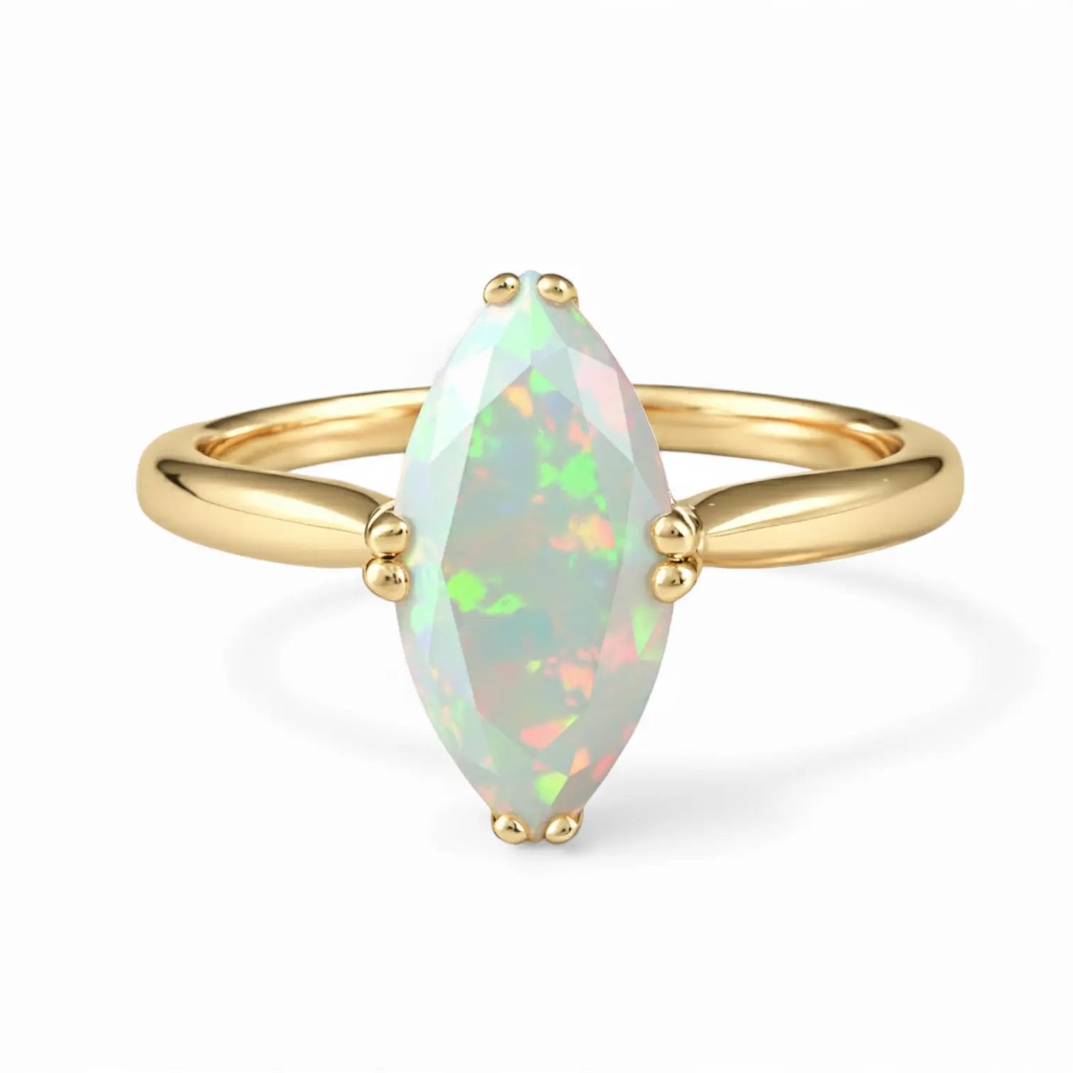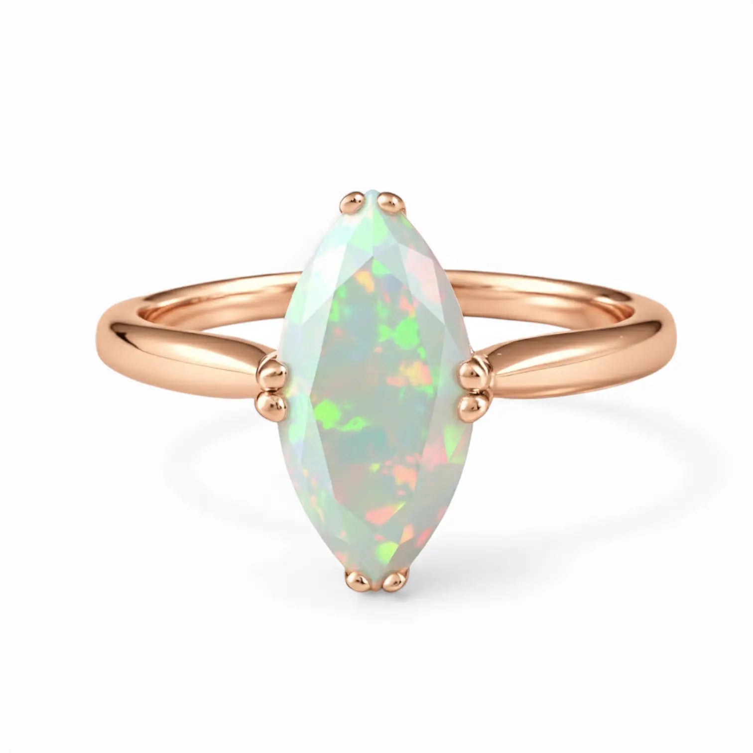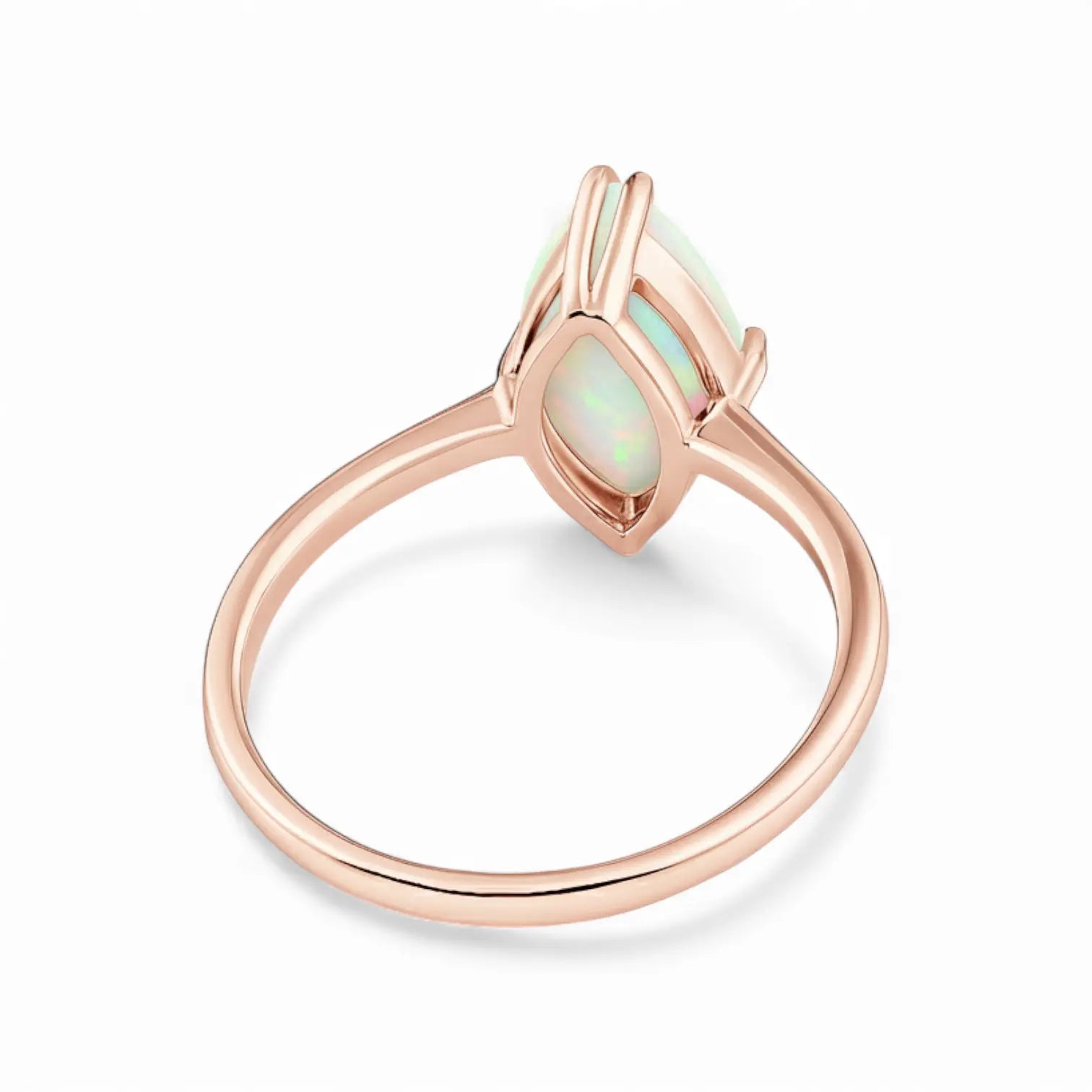 When the light changes, this opal marquise ring shows a new side, gentle hues that feel like morning light resting on your skin. Hints of blue, pink, and gold drift over a milky white gem. Each subtle gleam reminds you that even imperfection can shine. Make it yours, and let every ordinary moment catch a hint of magic in its light.