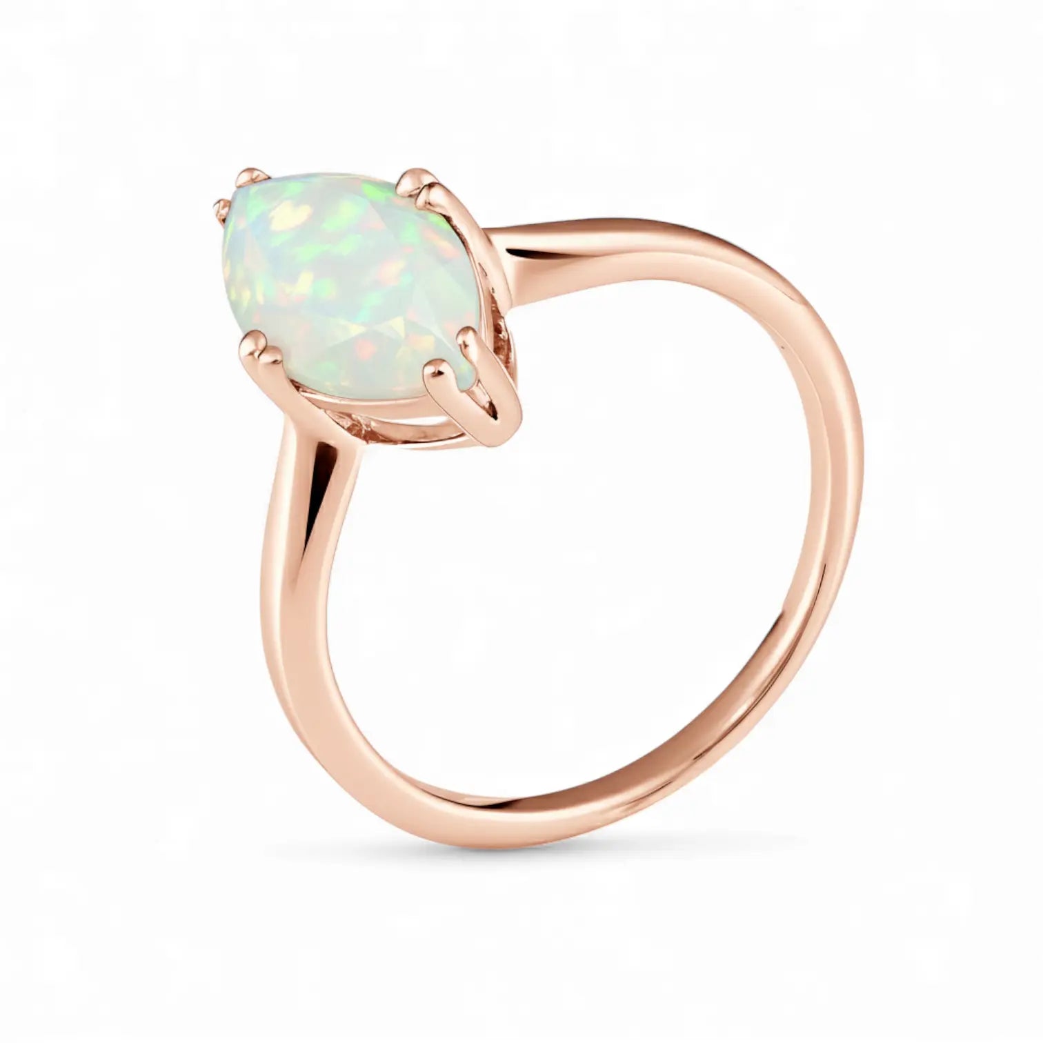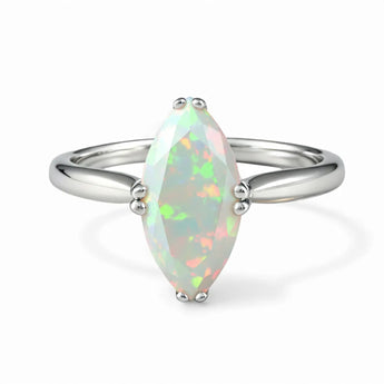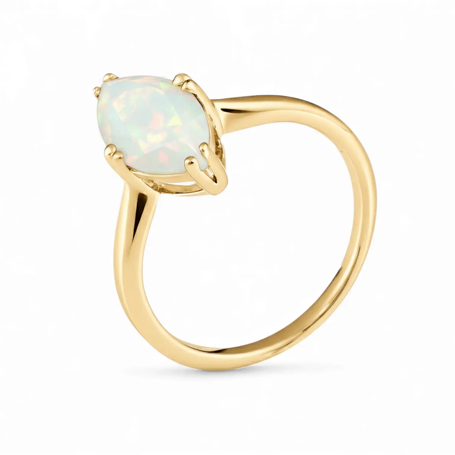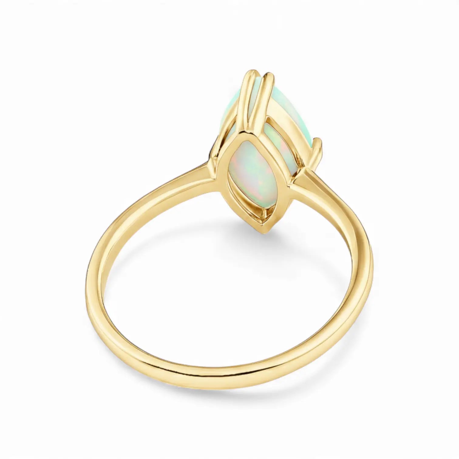 When the light changes, this opal marquise ring shows a new side, gentle hues that feel like morning light resting on your skin. Hints of blue, pink, and gold drift over a milky white gem. Each subtle gleam reminds you that even imperfection can shine. Make it yours, and let every ordinary moment catch a hint of magic in its light.