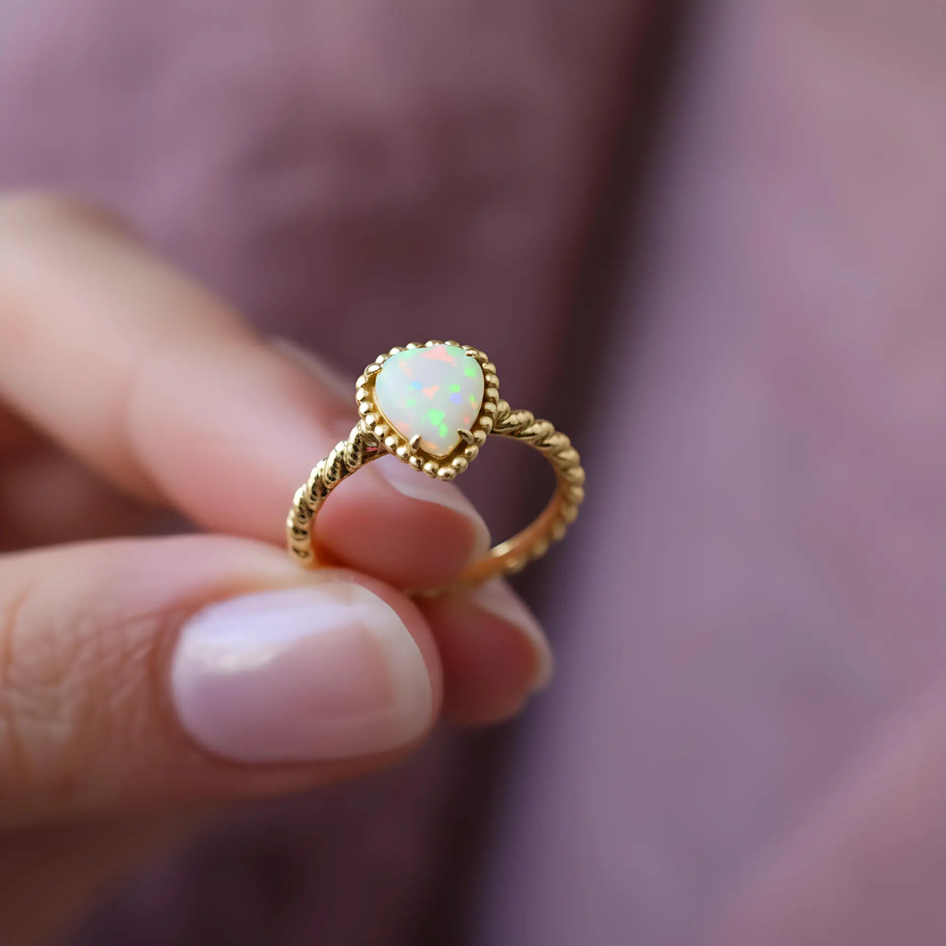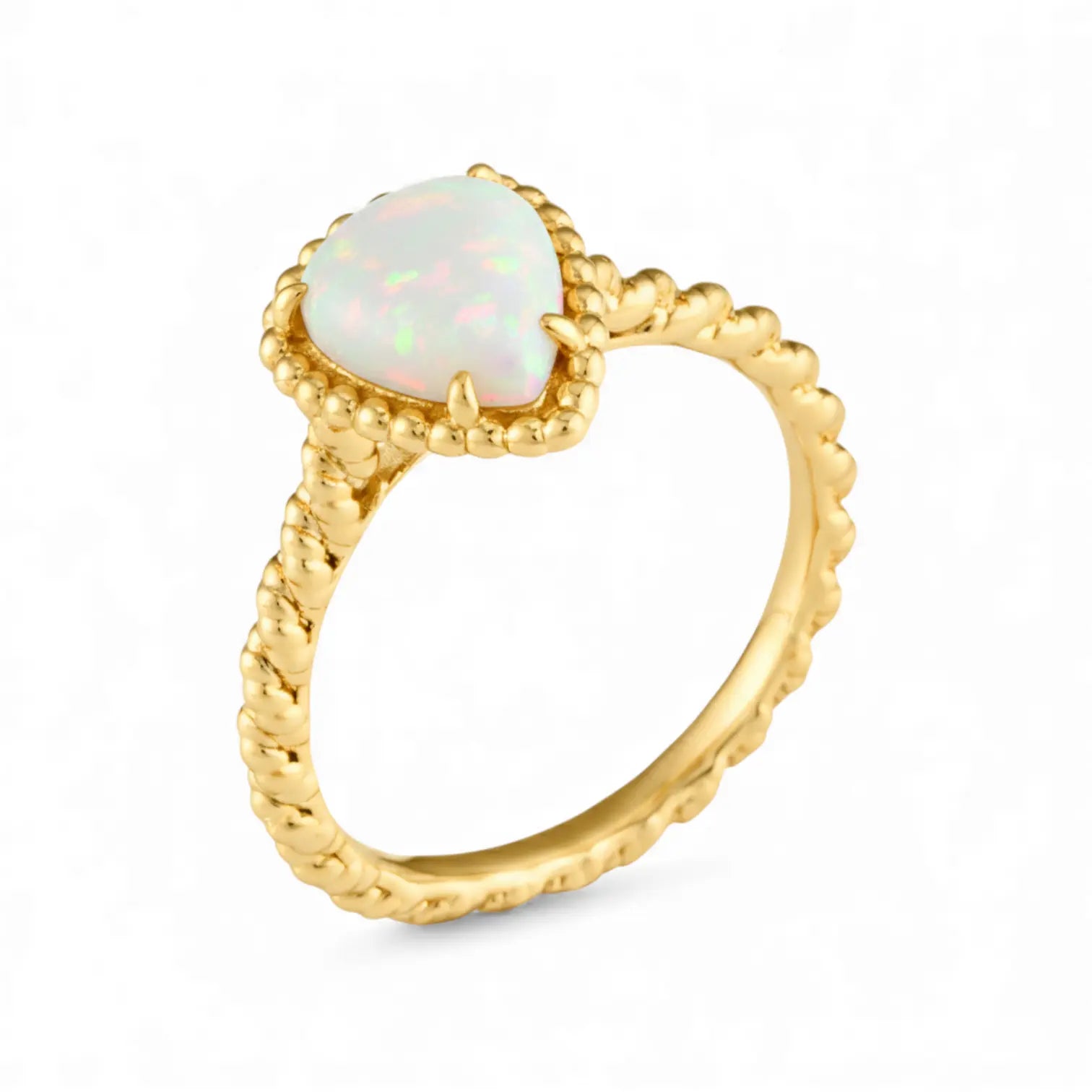 If October belongs to you, this Opal Pear Ring will perfectly reflect your story: gentle, vibrant, and with an understated brilliance. The twisted band gently encircles the gemstone, as if carefully placing all the beauty within. Opal represents Positivity, making your life brighter and more energetic. Wear this ring and capture your own beauty.