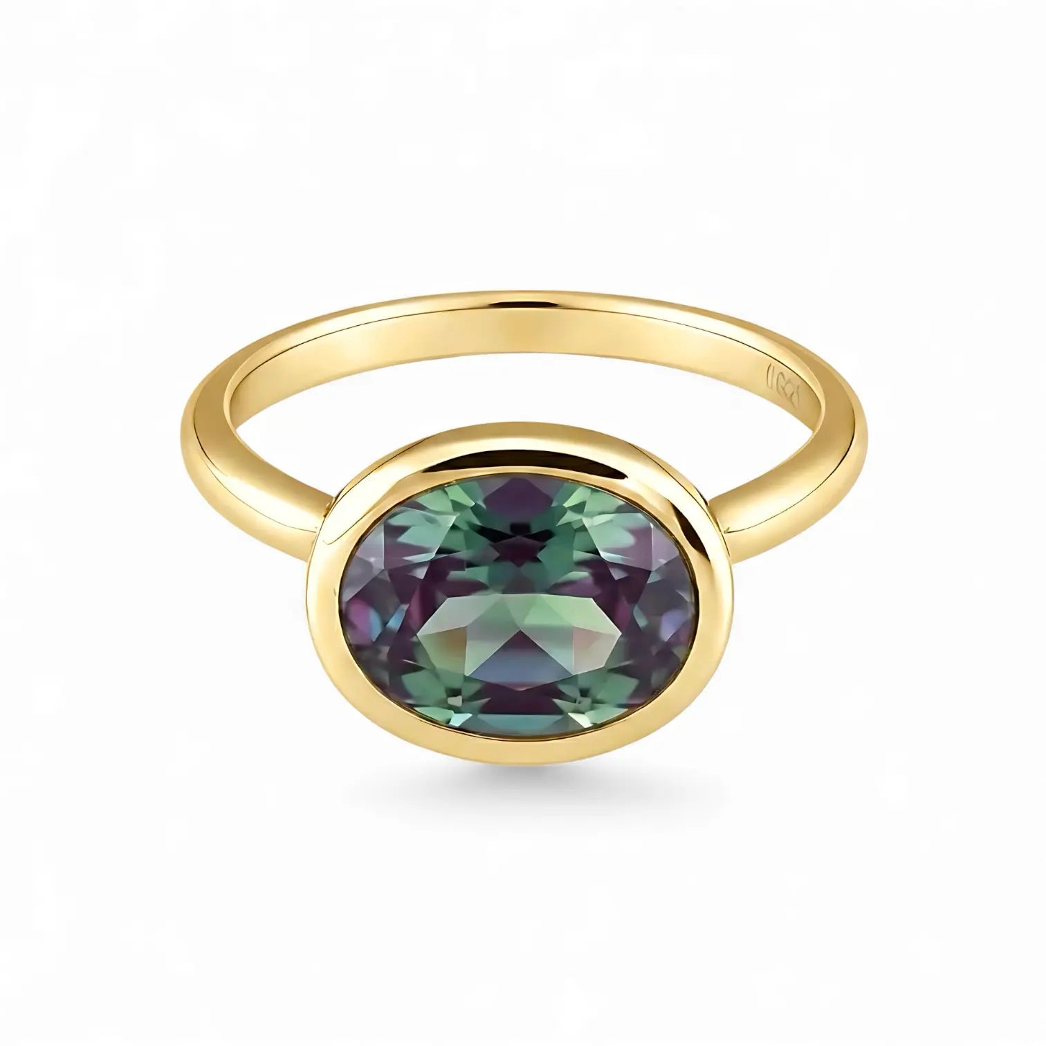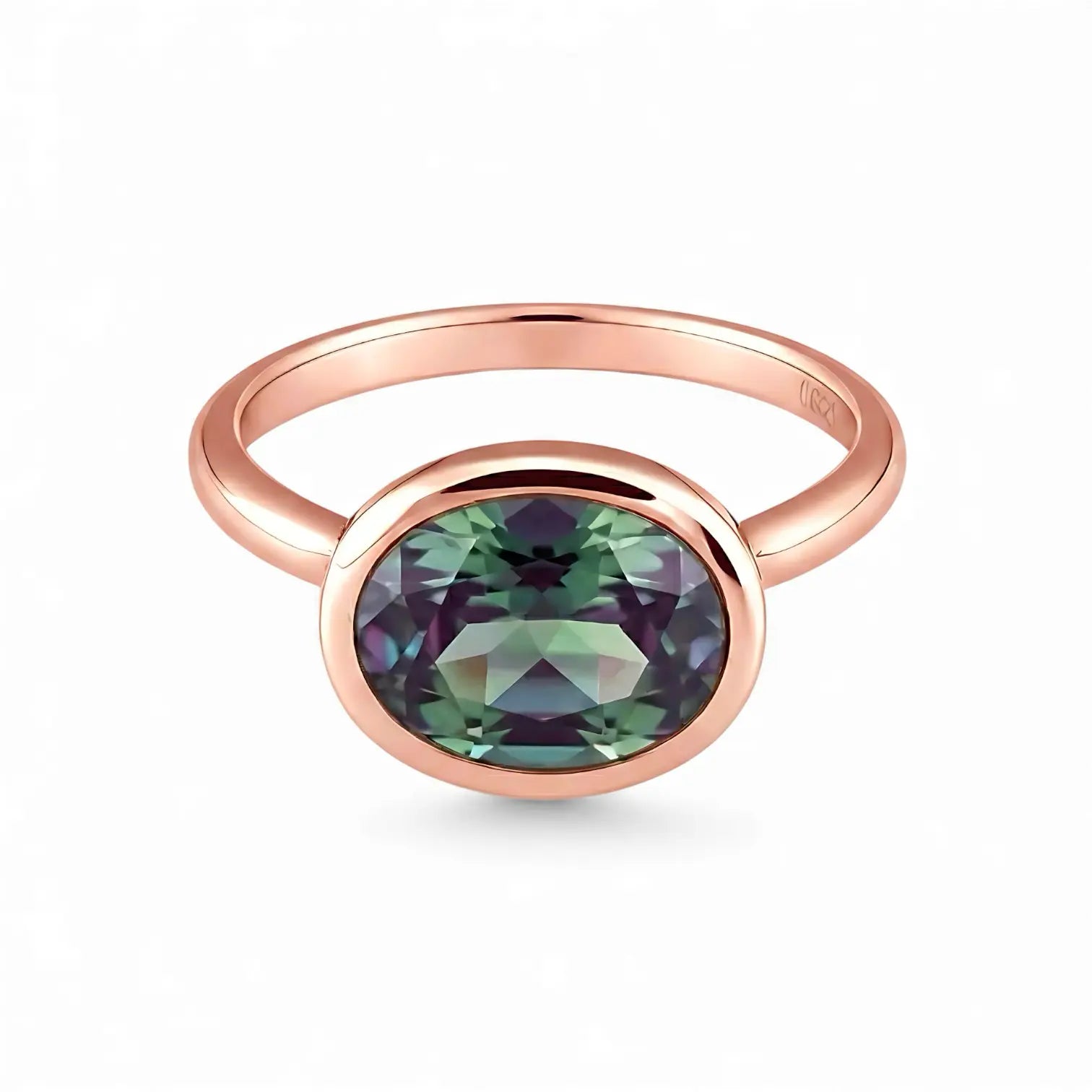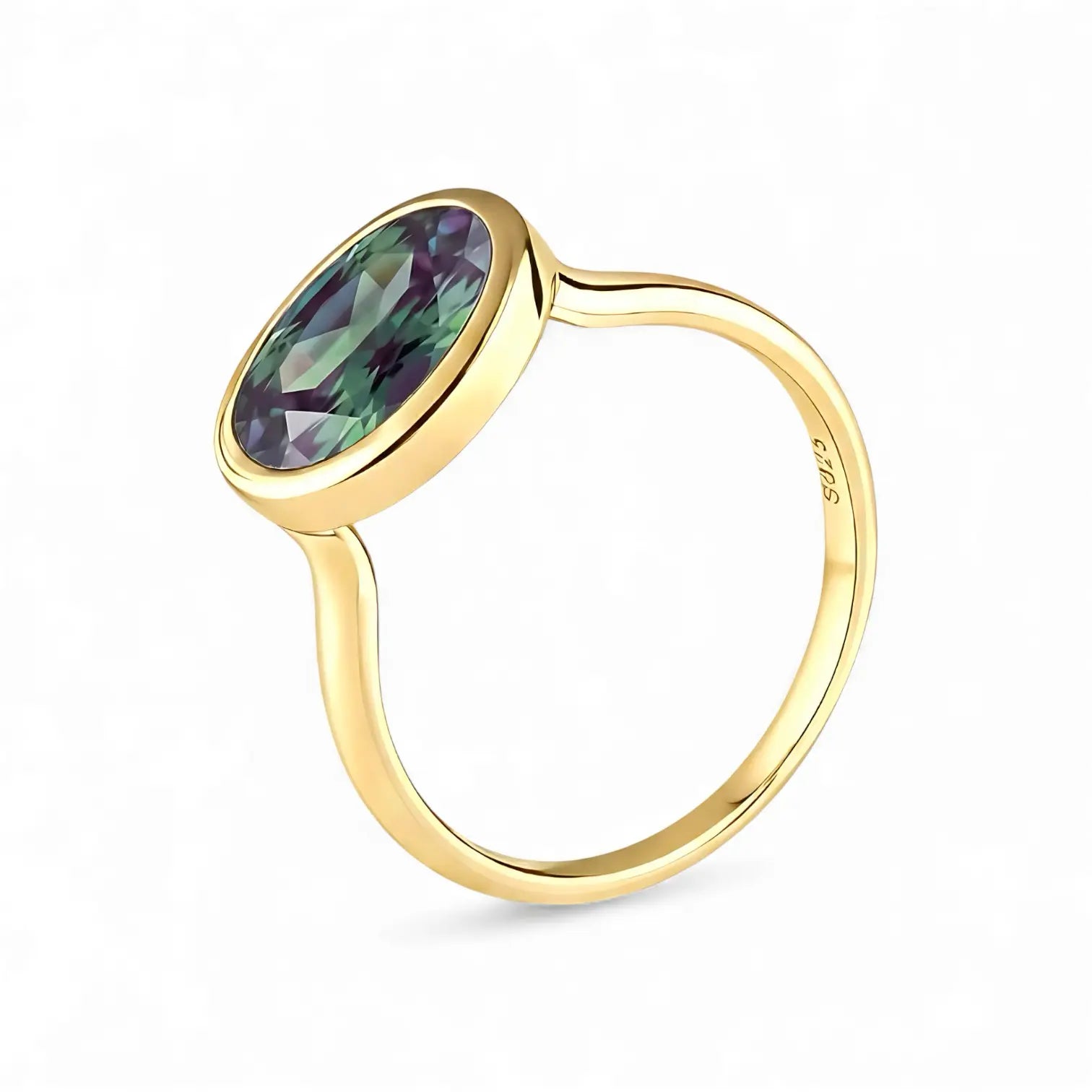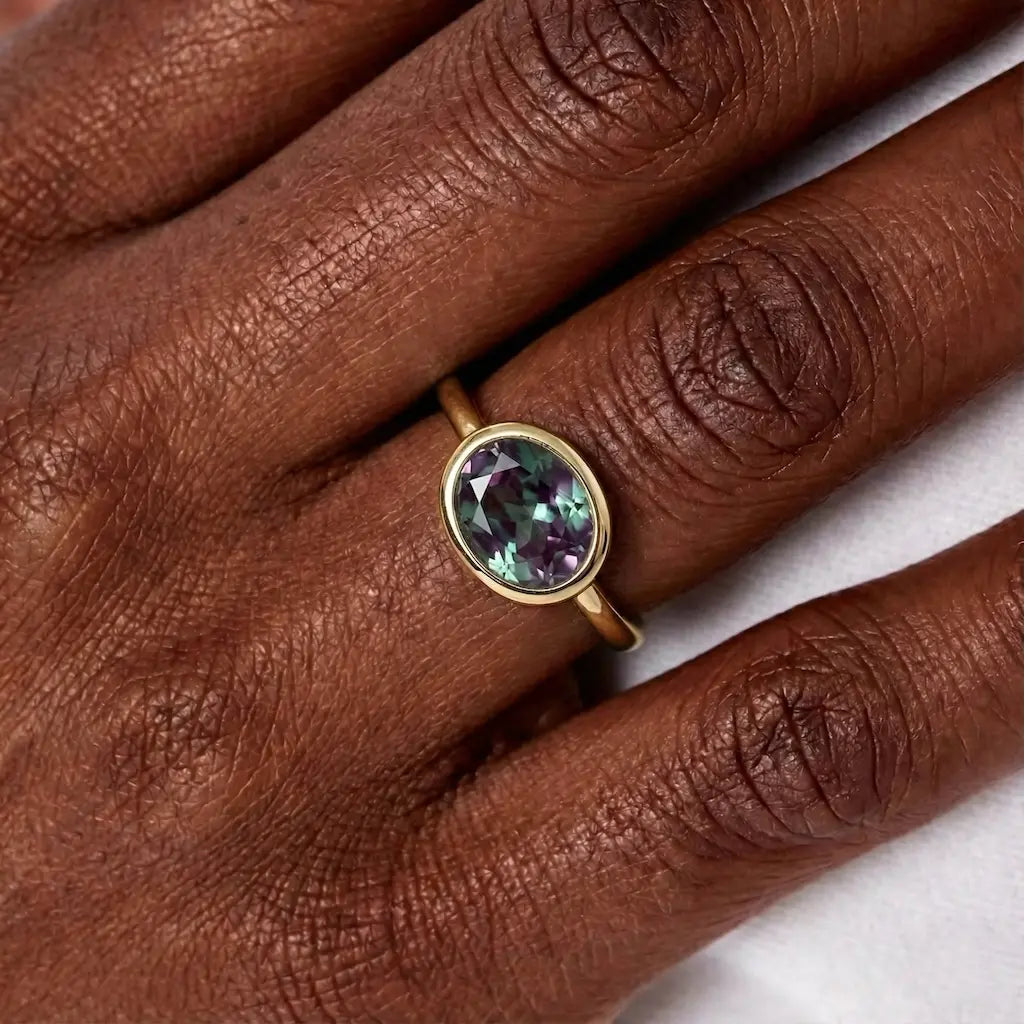 A breeze seems to settle on the finger as the oval alexandrite shifts gently in the light. The smooth metal band frames its changing hues with ease, creating a calm, rounded form. It feels close and steady, inviting a softer pause and reminding the wearer that even small changes in life carry their own quiet beauty.