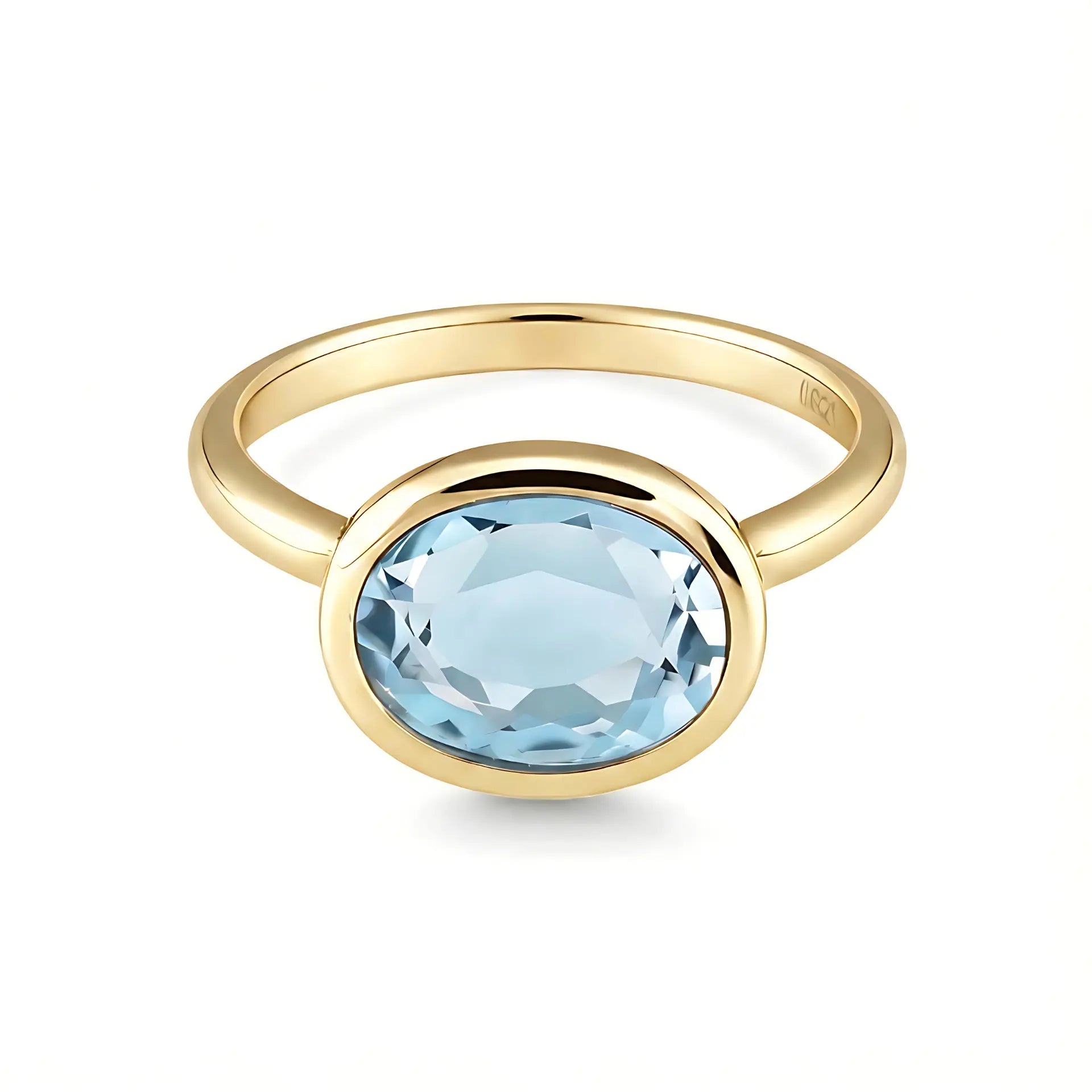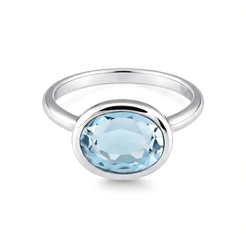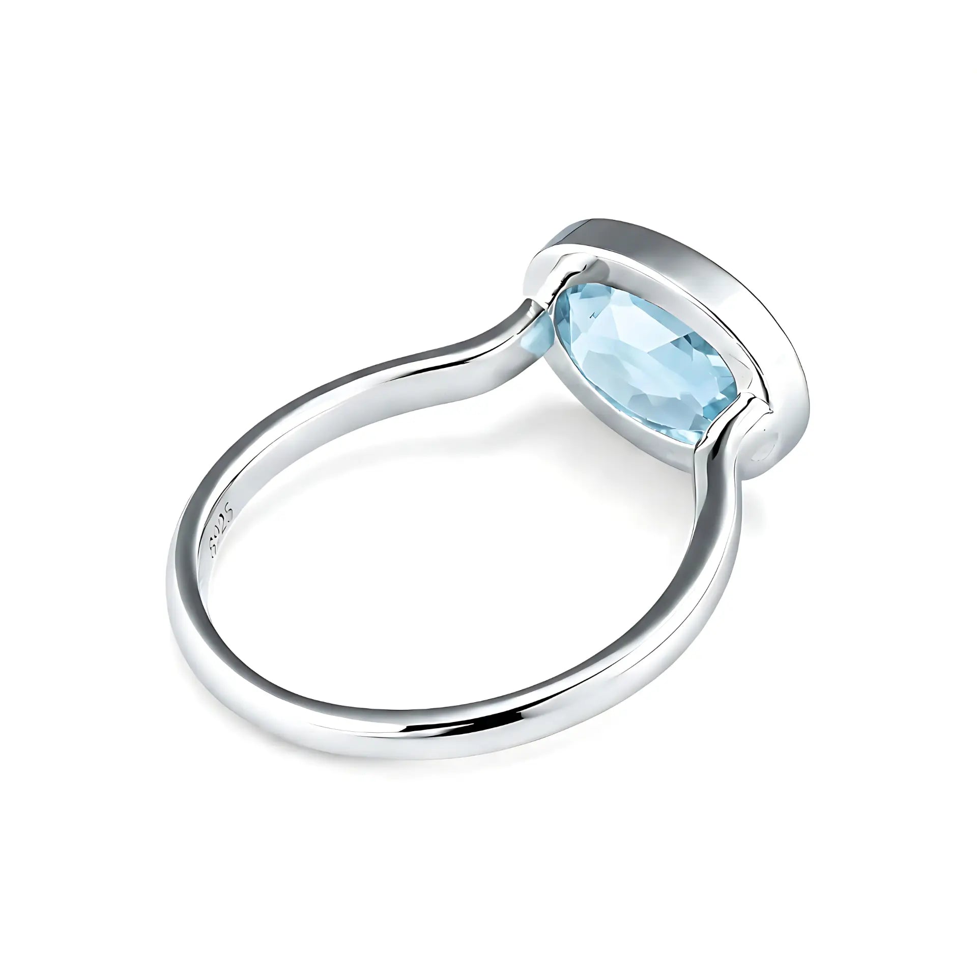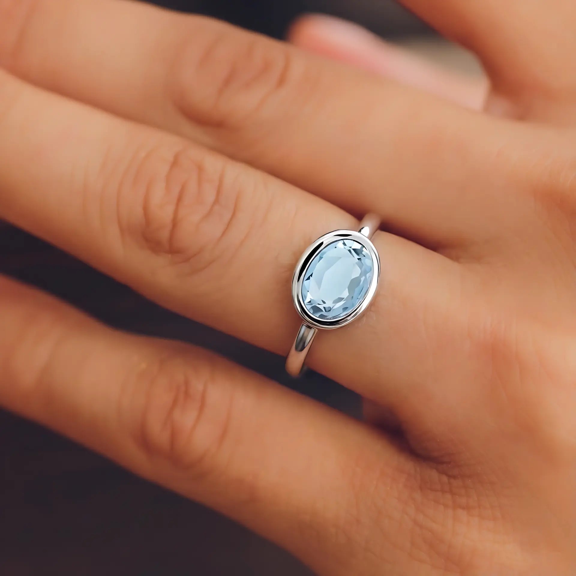 The ring holds a clear blue aquamarine in a smooth oval bezel, creating a quiet space on the hand, like a small piece of sea kept close. Its clean lines bring a calm presence, steady yet gentle. The blue gemstone ring recalls the moment when the heart gathers strength, encouraging a quiet step forward and offering a soft sense of reassurance in everyday life.
