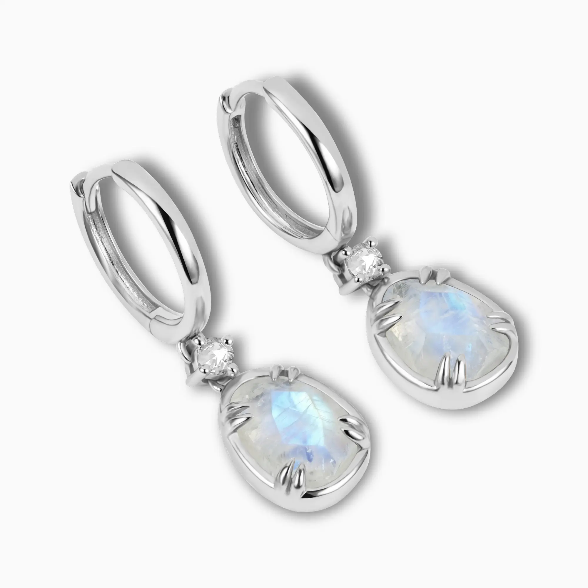 A trace of moonlight rests softly at the ear. A delicate hoop holds a luminous moonstone, crowned with a subtle glow like a guiding star. Clear and gentle, its light reflects intuition and inner awareness. More than an adornment, it becomes a quiet dialogue with the self, inviting calm, clarity, and trust in one’s inner voice.