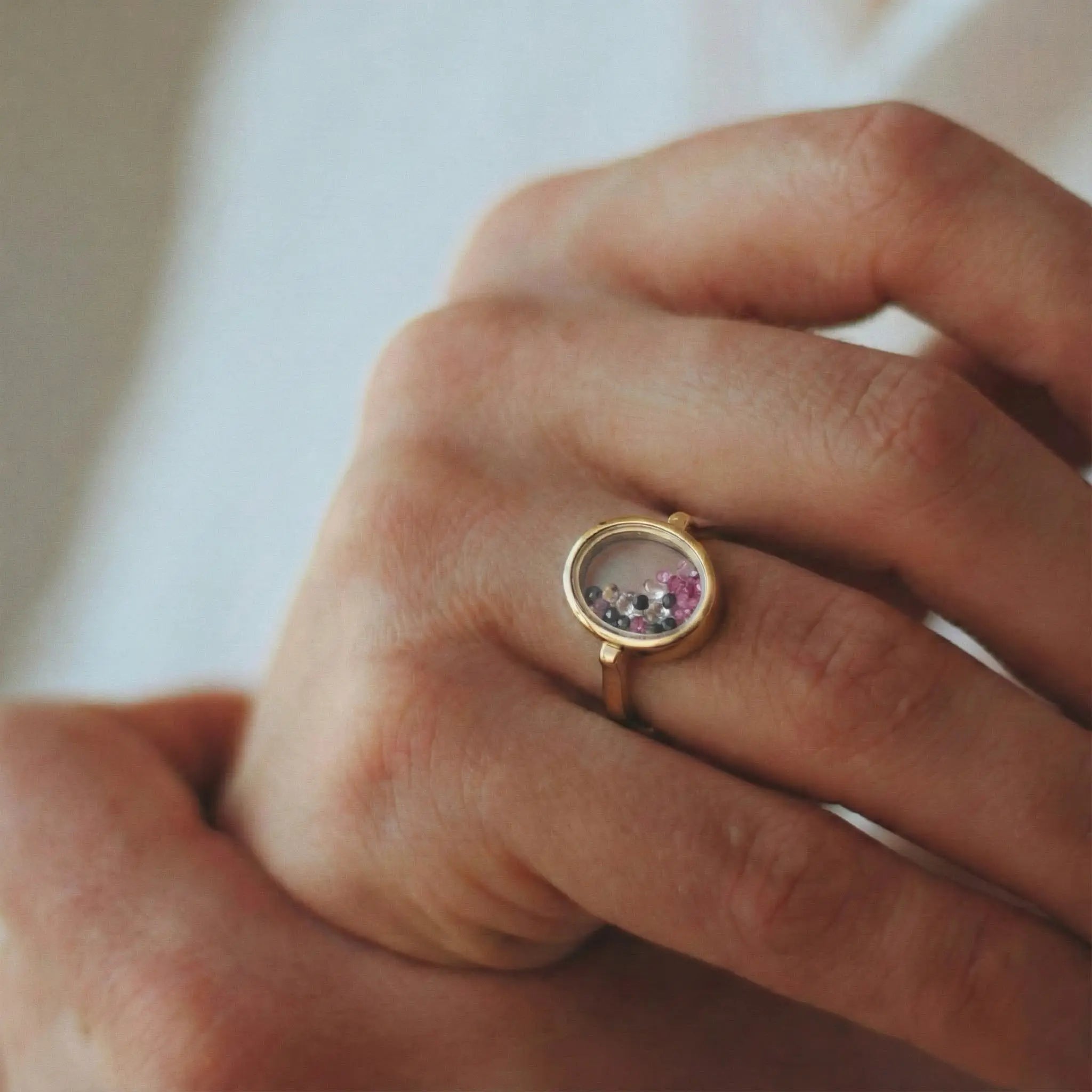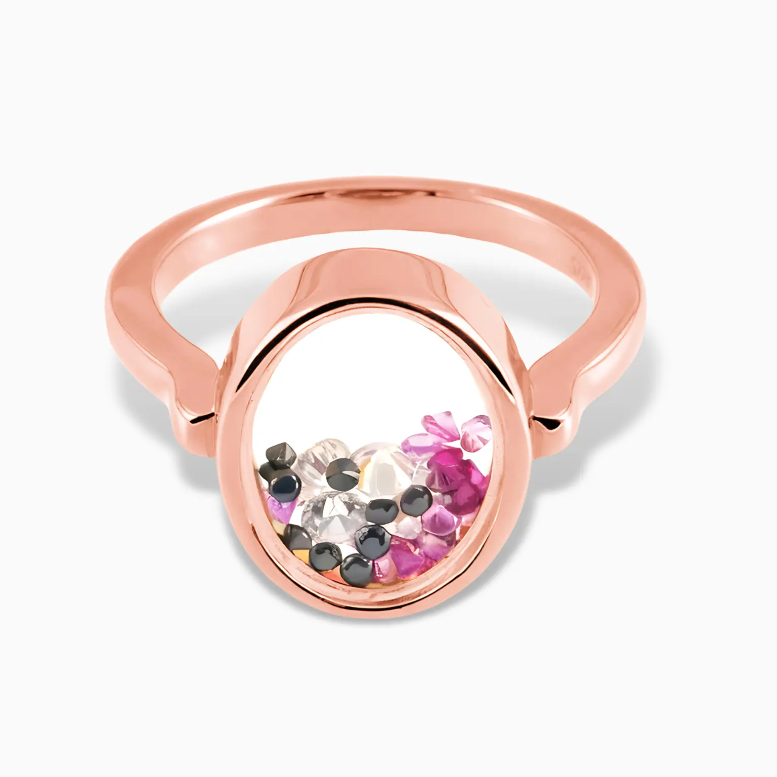 Our newly launched ring features a transparent capsule-style shaker design. White zircon, black onyx, rose quartz, and pink tourmaline are gently sealed inside.