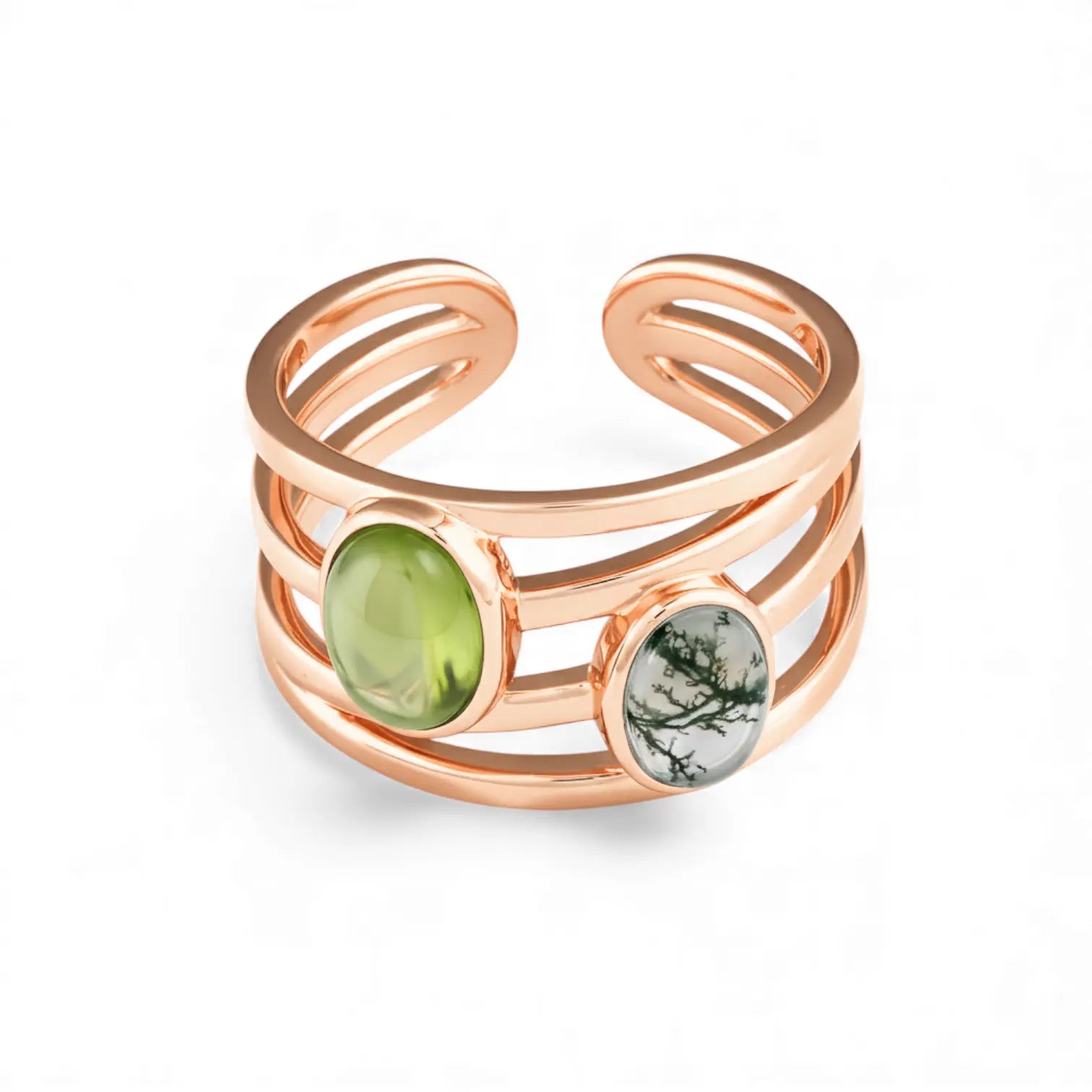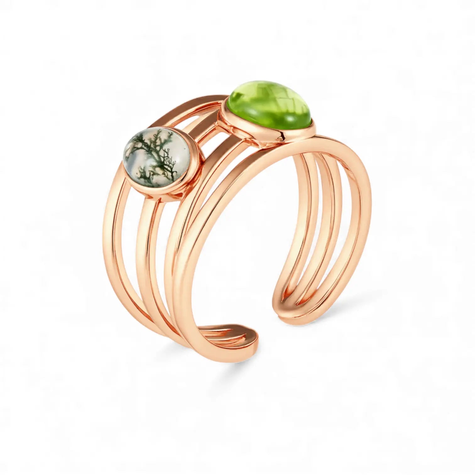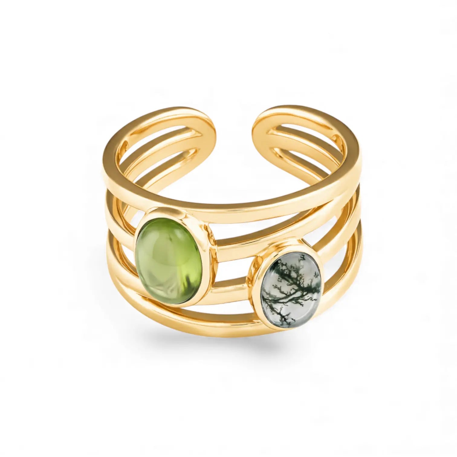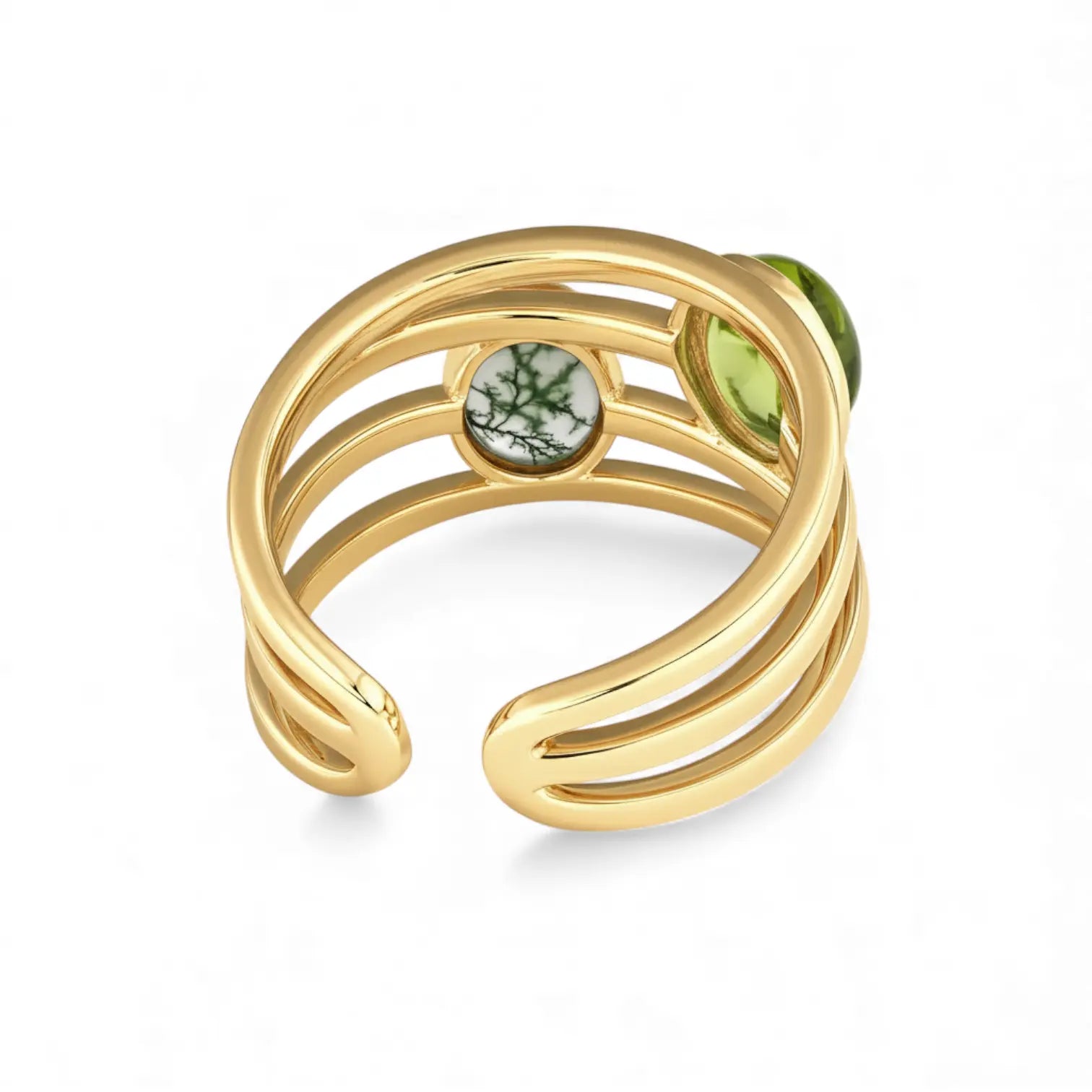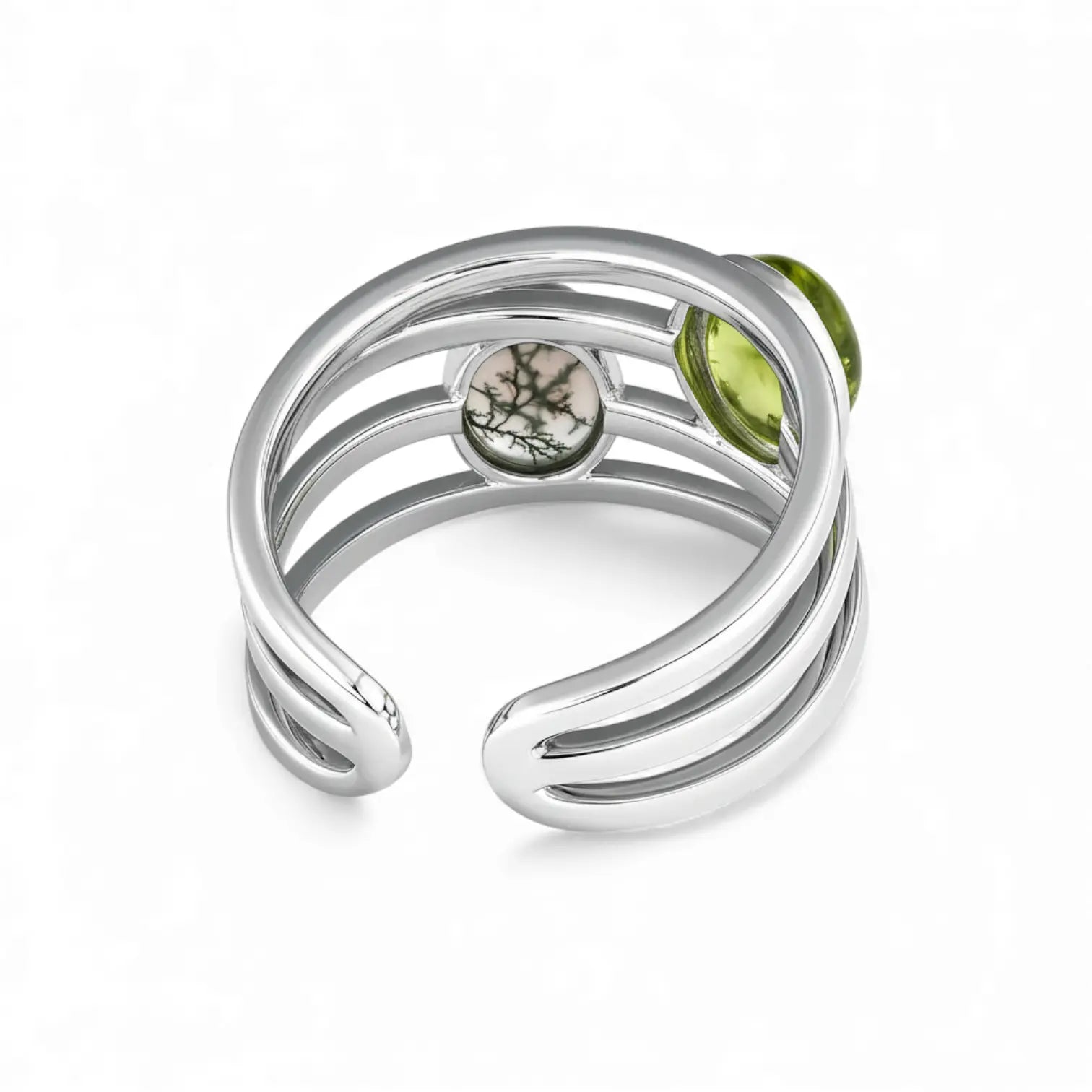 Meet our peridot and moss agate cuff ring. It's especially perfect for those born in August, allowing you to carry your natural, uplifting energy with you. Together, peridot and moss agate represent quiet understanding and the kind of growth. Peridot carries a gentle empathy. Moss agate, like a small forest on your fingertips, slowly infuses the power of growth into your daily life.