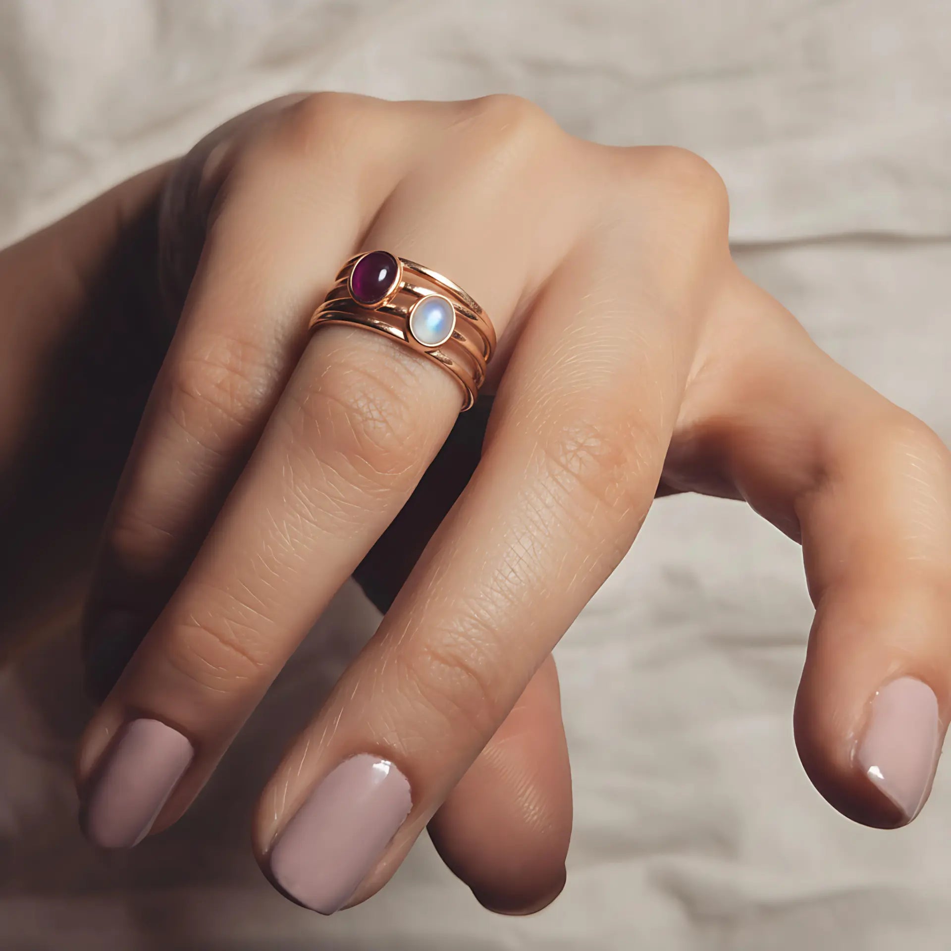 If you're looking for an energy that guides you and keeps you motivated, our Oval Ruby and Moonstone Ring is just that. Ruby makes you feel like life is moving forward, burning, and flowing. Moonstone helps you find the right direction between vitality and intuition. For those born in June and July, this is a small amulet that carries both the "light of intuition" and the "fire of life" with you.
