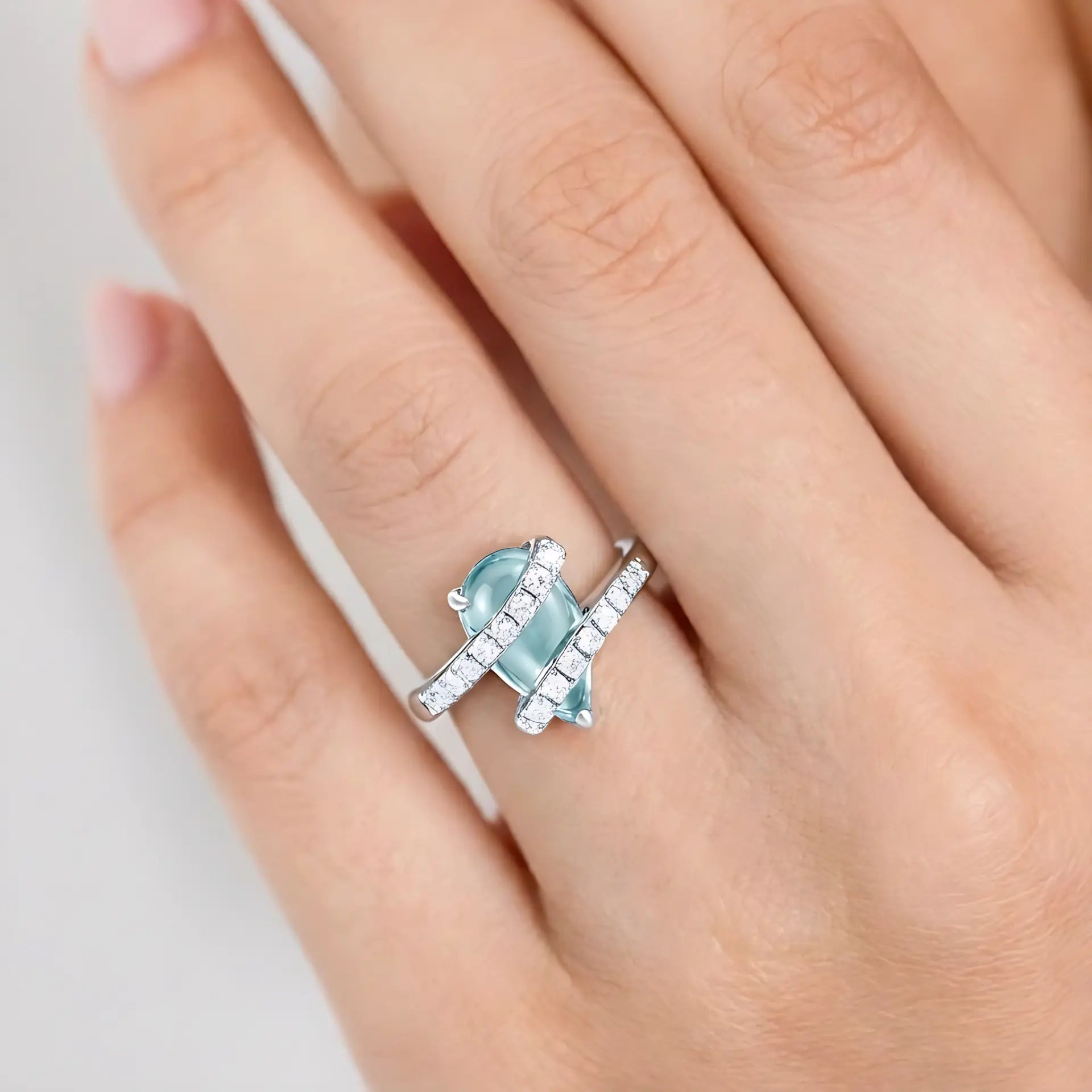 The clean, bright pale blue of aquamarine stands out on the band. Cubic zirconia on both sides adds a gentle touch of light. This ring empowers you to speak more boldly and move forward with greater confidence in crucial moments. As the birthstone for March, it adds a touch of clear-headed courage to your next step.