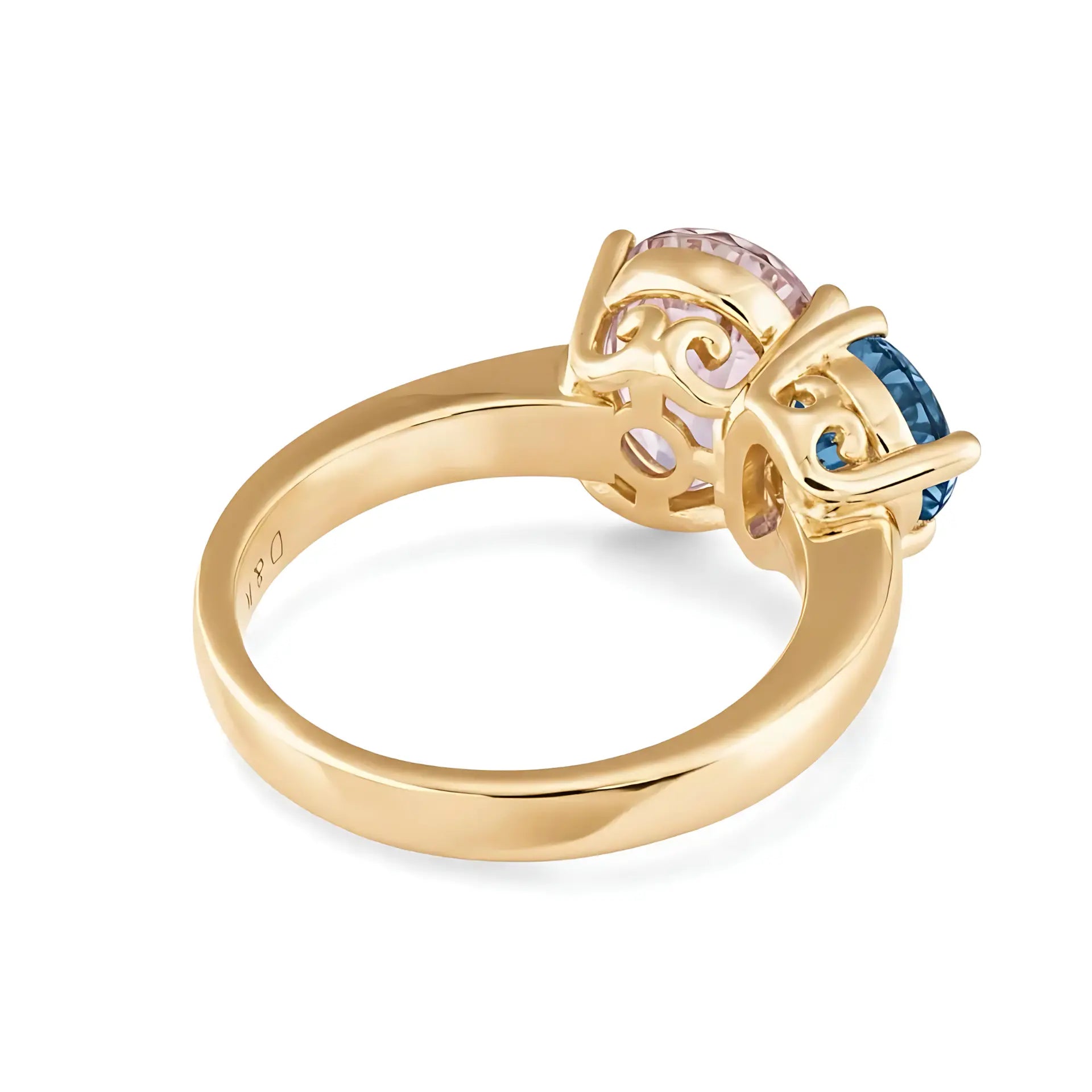 A tranquil balance unfolds where a deep London blue meets a tender blush on a polished closed band. The pear and oval forms create a subtle architectural rhythm, offering harmony without excess. London Blue Topaz imparts lucid clarity, while Morganite brings quiet compassion. Together, they create a calm and warm presence that settles gently on the hand.
